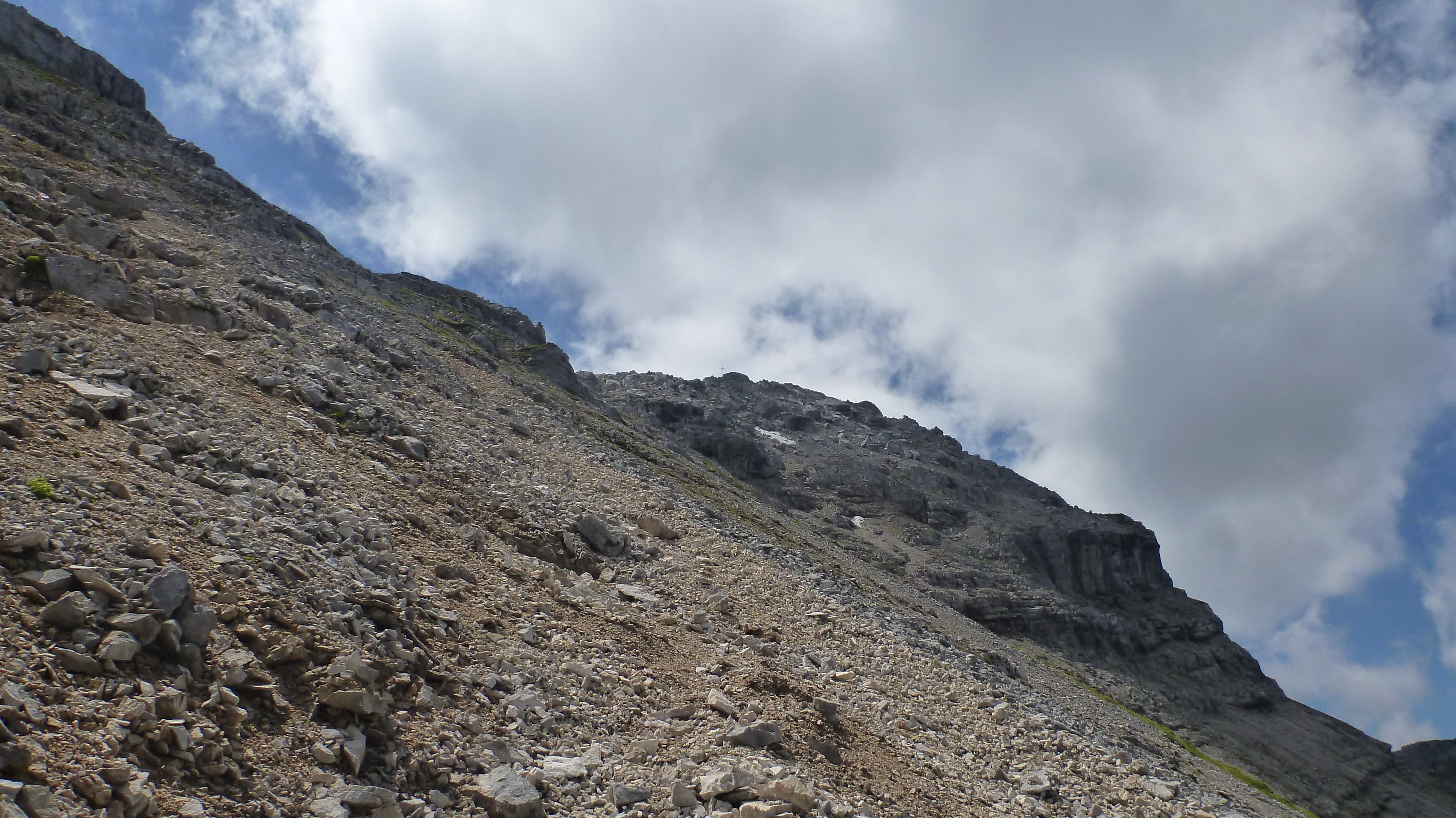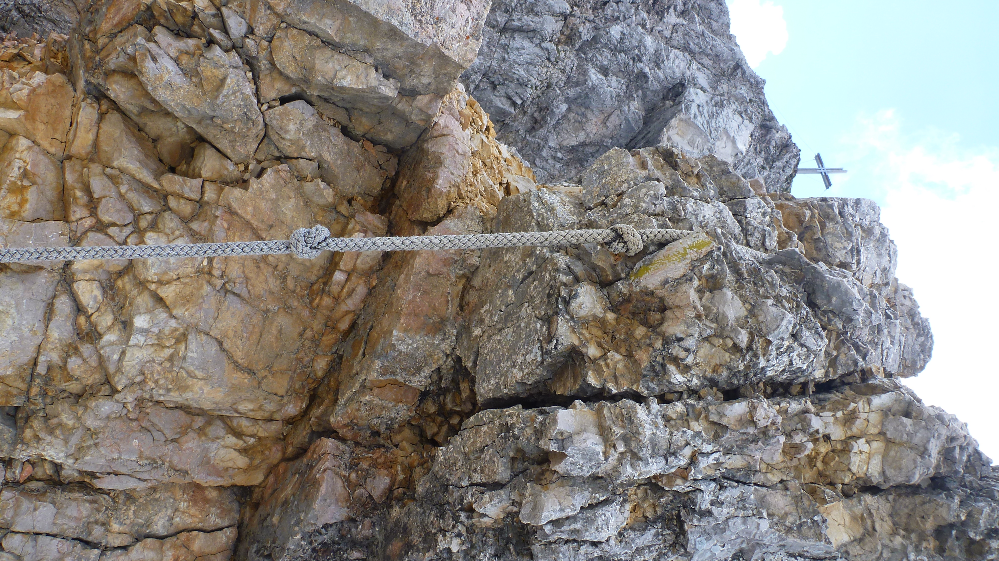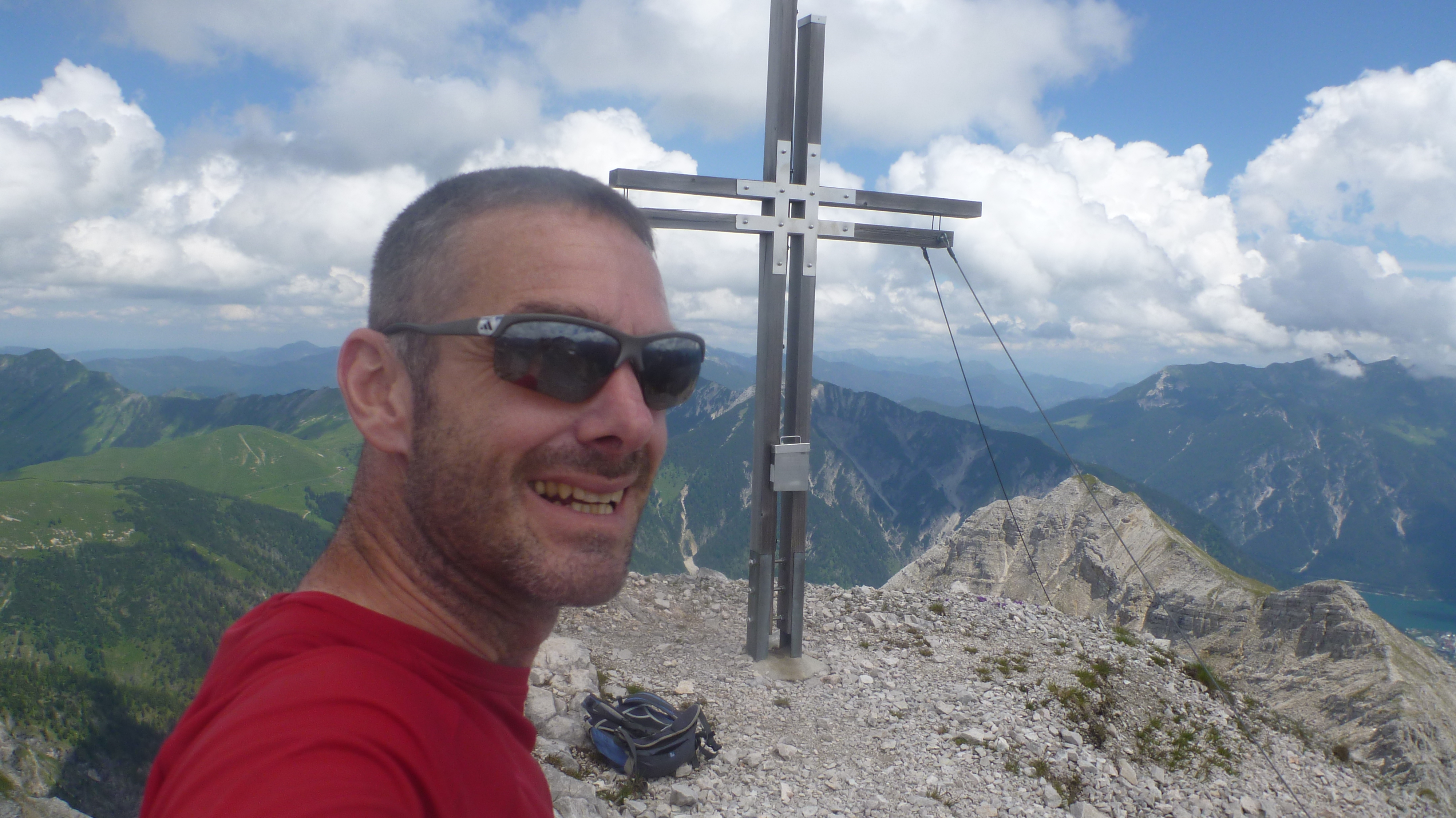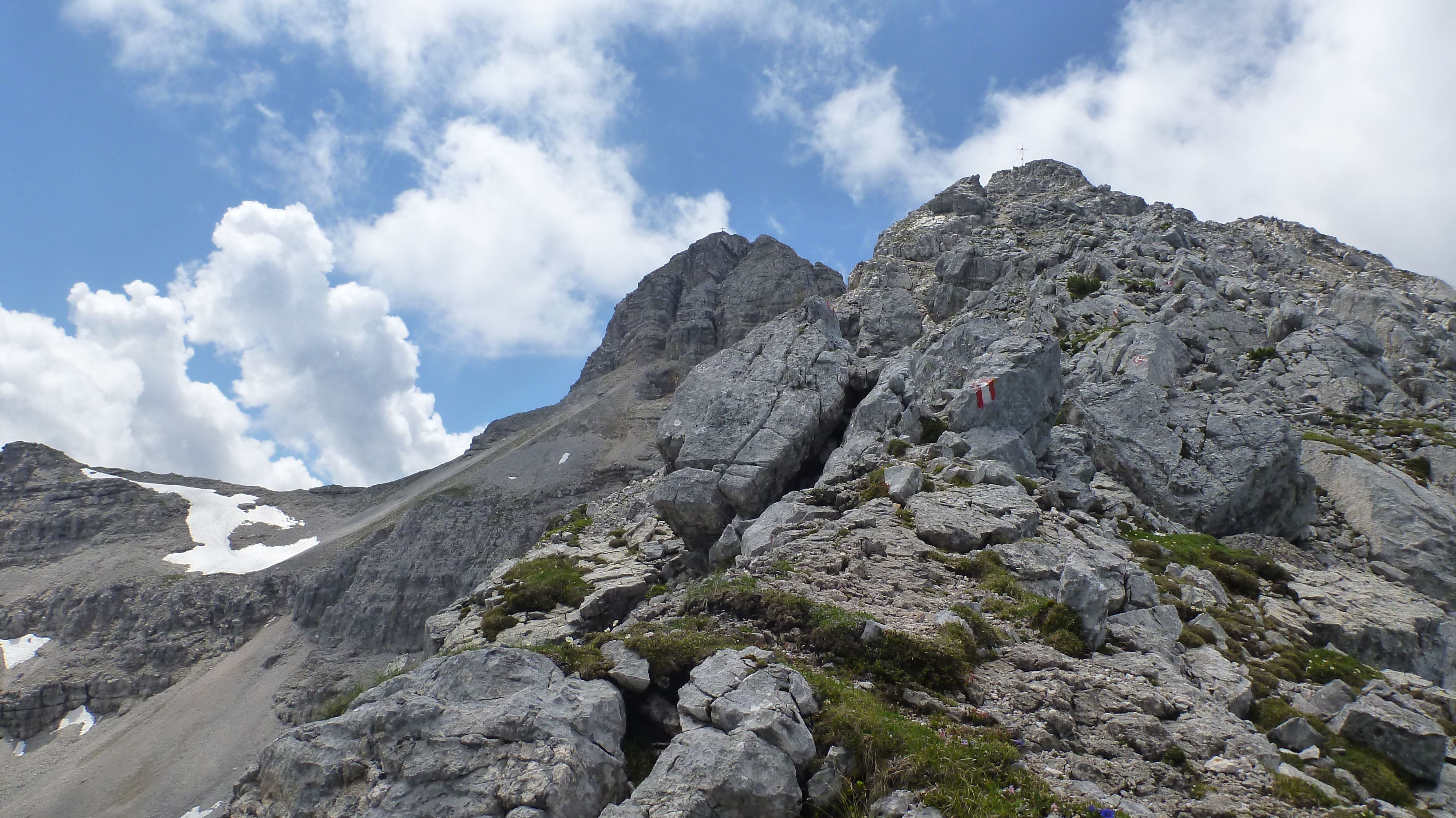 Sonstiges: Vom Parkplatz P9 an der Mautstraße in die Eng mit dem Mountainbike angenehm aufwärts Richtung Plumsjochhütte. Dort das Radl deponieren und zu Fuß zunächst durch Latschen, dann über steilen Karwendelschotter über den Rücken gut markiert aufwärts zum Vorgipfel. Von dort in etwas anspruchsvollerem und nicht mehr so gut markiertem Gelände (Aufpassen auf sperrende Steinmarkierungen, diese verhindern zahlreich mögliche Verhauer) zur "Schlüsselstelle" - eine kurze senkrechte Stufe kurz unterhalb des Gipfels, die aber durch ein dickes Seil perfekt abgesichert ist. Von dort in fünf Minuten unschwierig zum Gipfel.