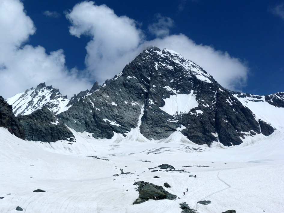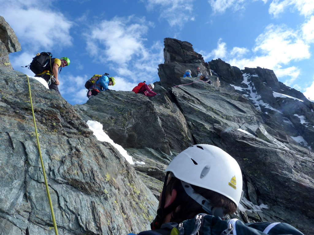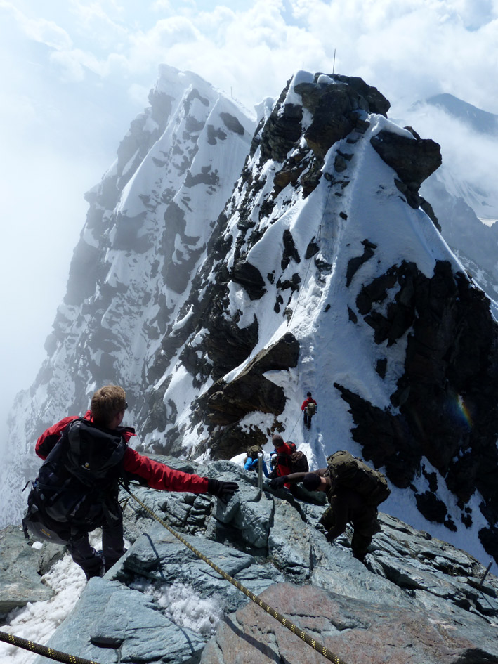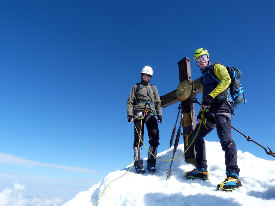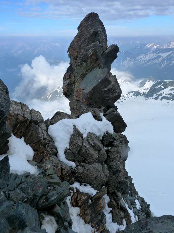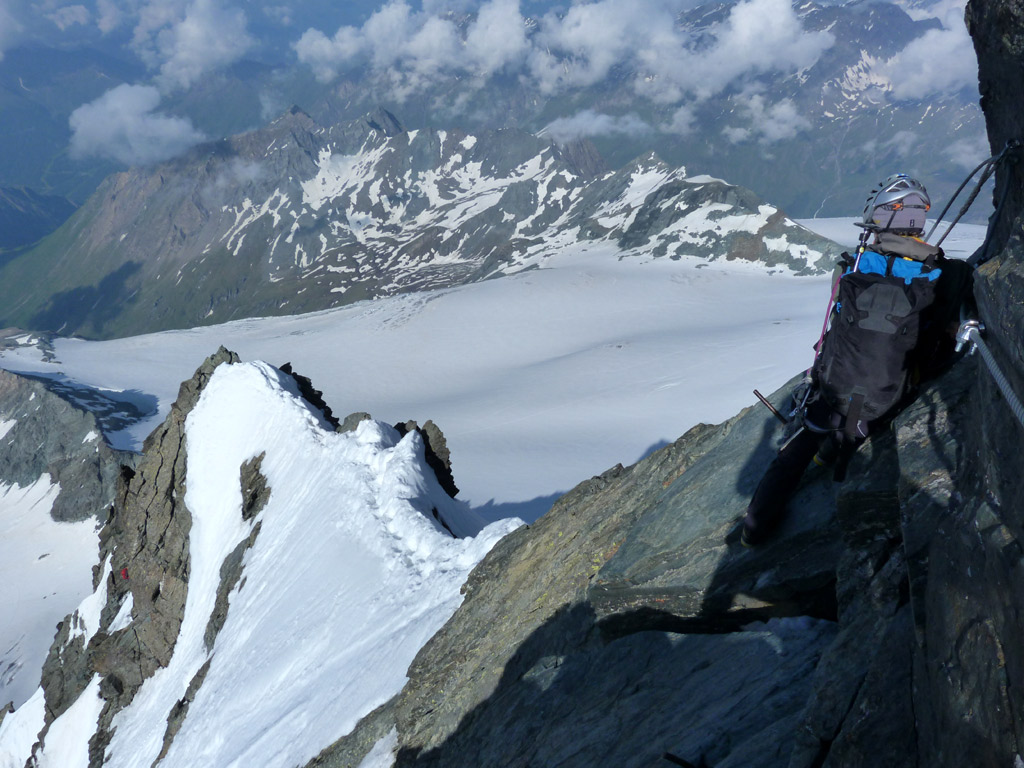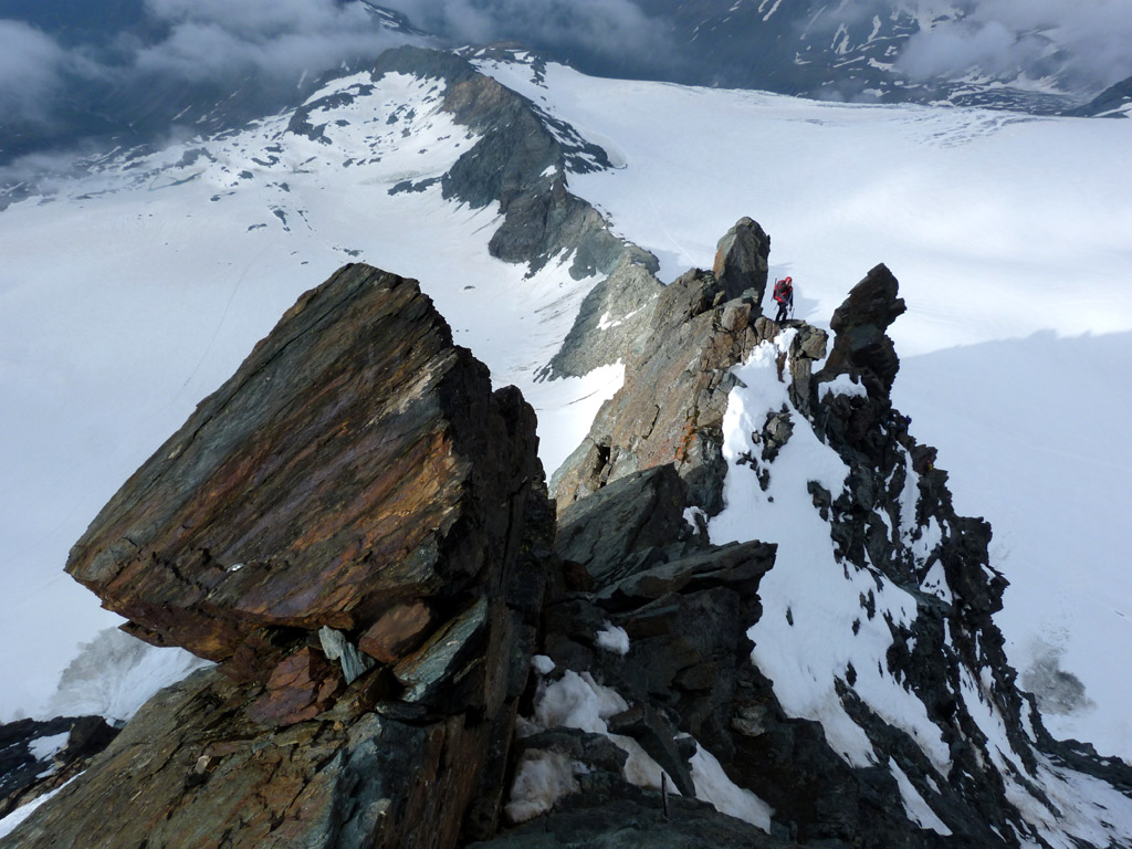 Tourenverhältnisse: 1. Tag: Aufstieg durchs Teischnitztal (die ruhigere Alternative zum Ködnitztal) zur Stüdlhütte, 3,5 Stunden; 2. Tag: Aufstieg via Stüdlgrat (ab Frühstücksplatz III+ und IV-) zum Gipfel; Abstieg über Normalweg (Kleinglockner, Adlersruhe) zur Stüdlhütte und durch Ködnitztal zum Lucknerhaus (von dort mit 2. Auto zum Startpunkt beim Taurerwirt). Stüdlgrat ließ sich komplett ohne Steigeisen begehen (die relevanten Kletter-/Schlüsselstellen sind alle weitgehend schneefrei); kurzer Stau an der Scharte zum Kleinglockner; auf dem Normalweg noch relativ viel weicher Schnee. Randkluft am Übergang vom Klettersteig unterhalb der Adlersruhe zum Ködnitzkees kein Problem (Randkluft ist noch eingeschneit). Generell noch relativ viel Schnee.