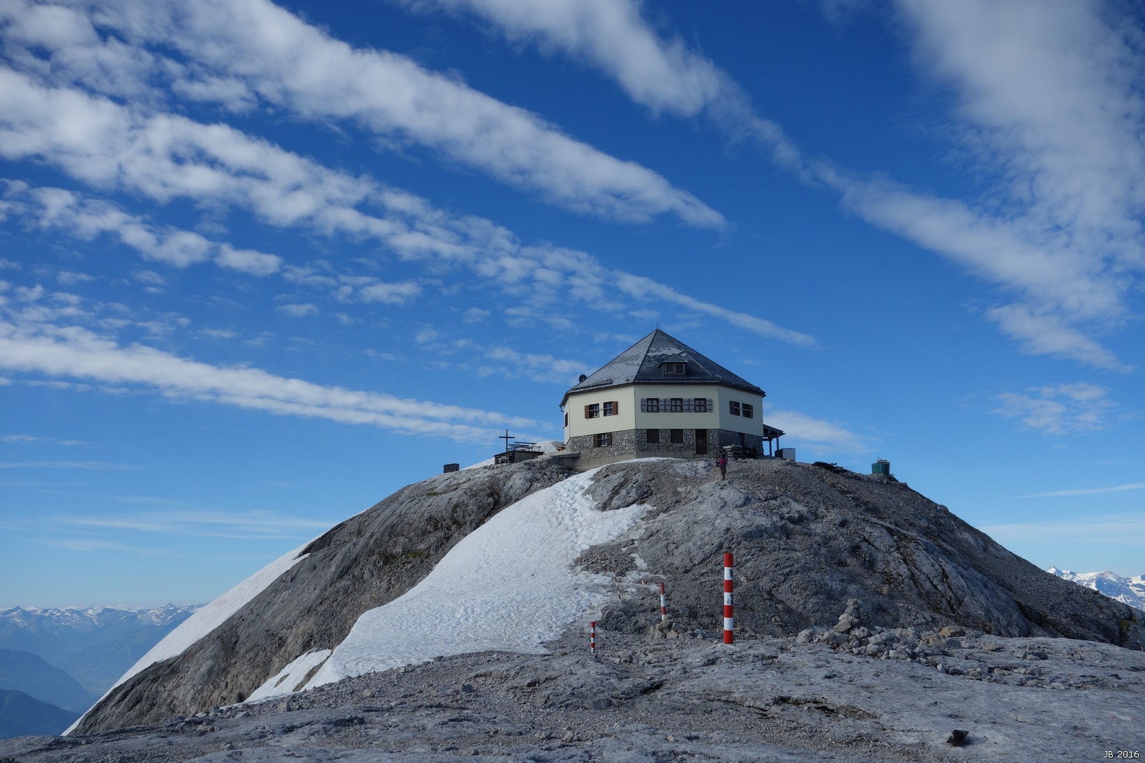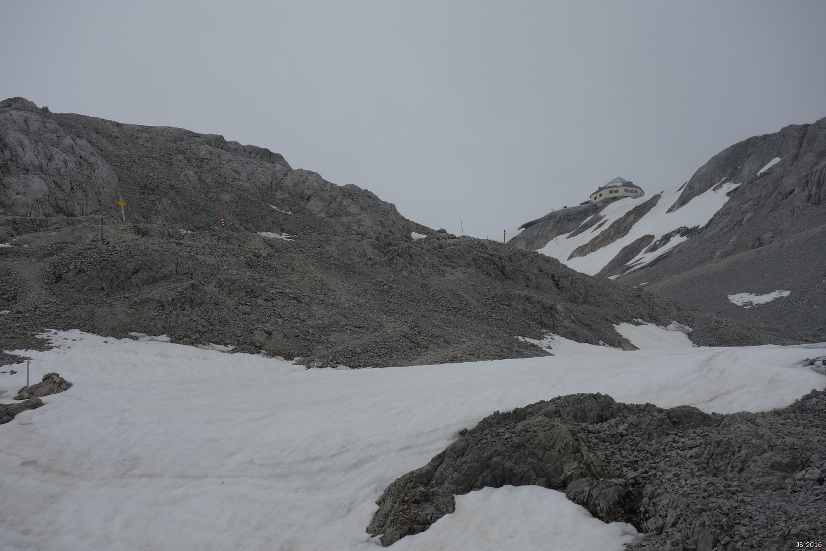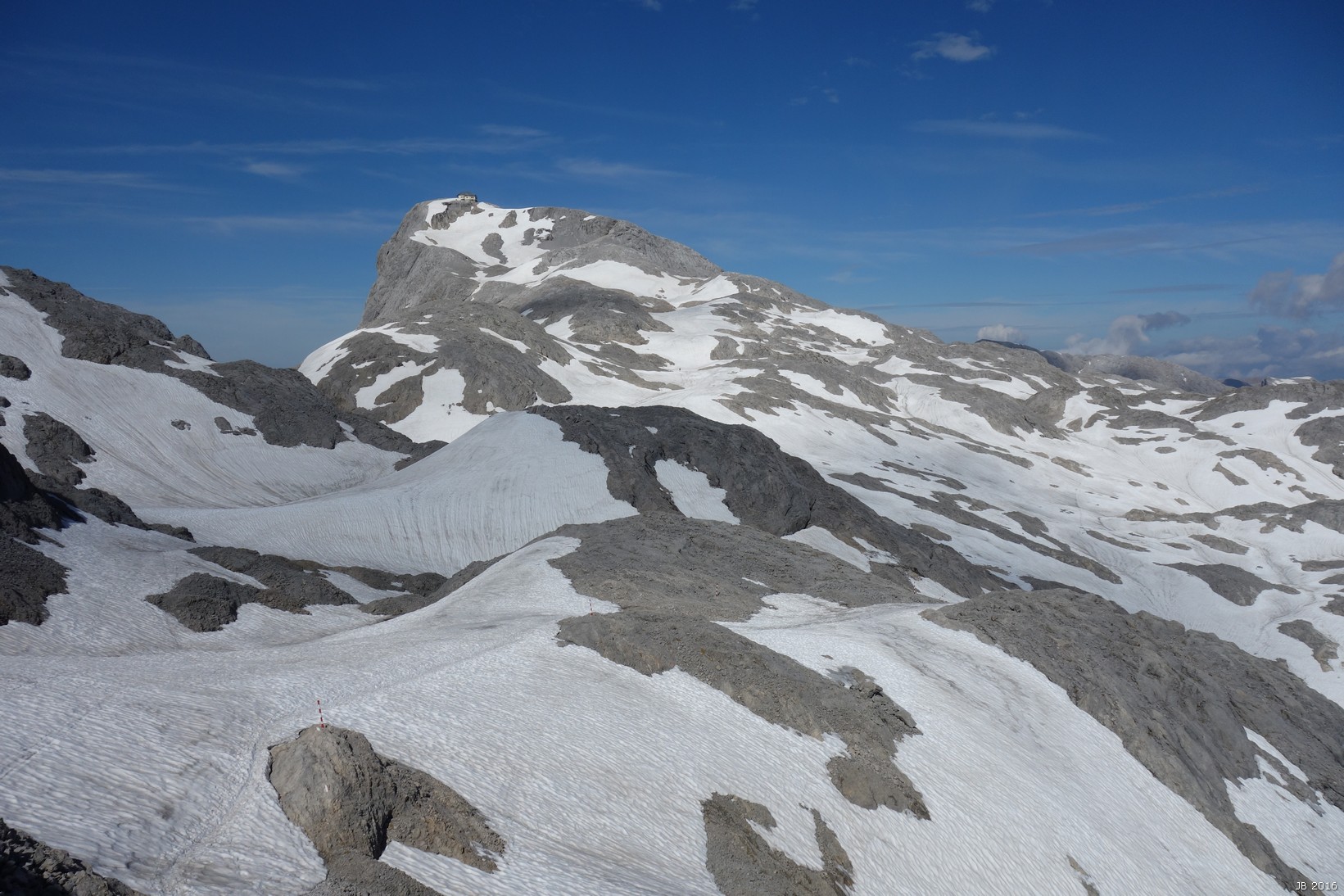 Abstieg nach O über den Normalweg an der Torsäule vorbei zur Mitterfeldalm 1670m und zum Arthur-Haus 1502m . Dieser Weg ist viel begangen, gut markiert und auf den Schneefelder gespurt. Teilweise viel Geröll, mit Gegenanstiegen fast 1700 Hm Abstieg.