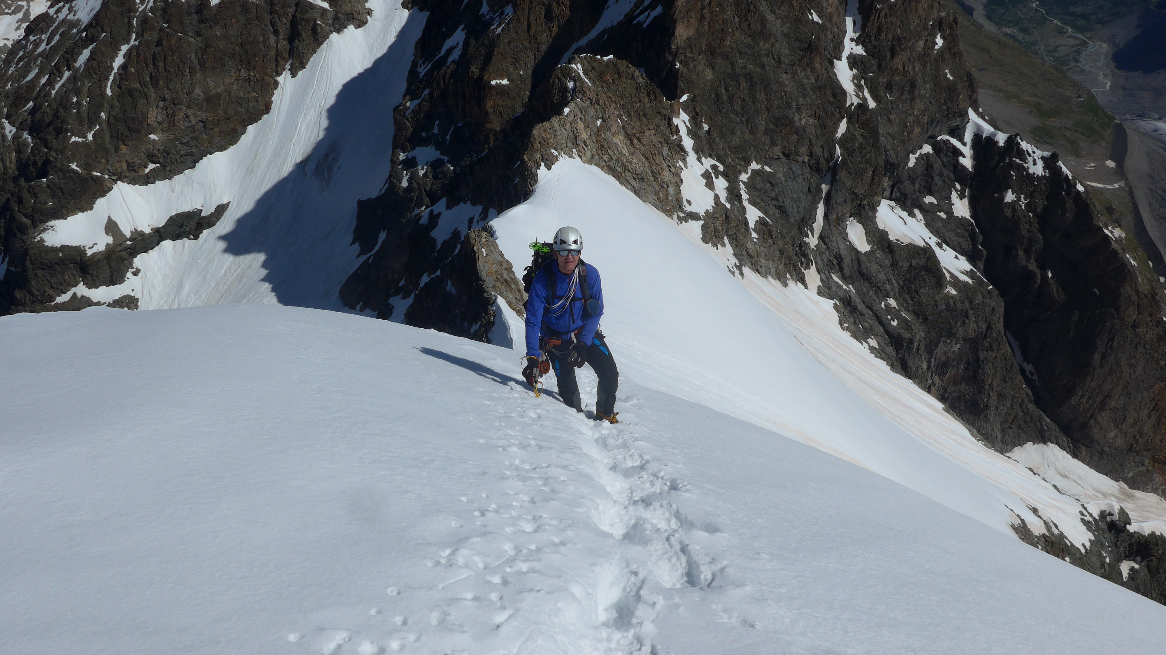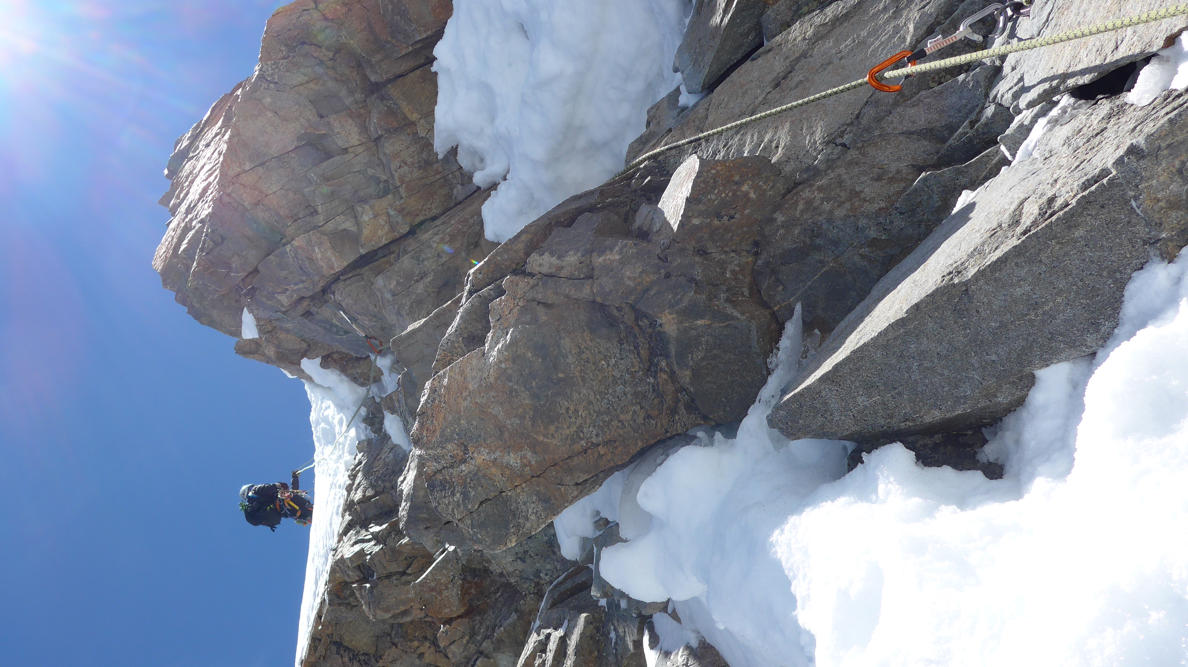 Gleitendes Seil nicht wirklich immer zuverlässig anwendbar. Diese SL haben wir gesichert. Köpflschlingen vereinzelt möglich. Sehr wenige Bohrhaken. 2 festgeklemmte (wirkliche) "Friends" gerne mit hergenommen. Wenige kleine Firnbalkone zum stehen, verabschiedeten sich in die Tiefe. Dafür war der Spreizschritt schön verfirnt.