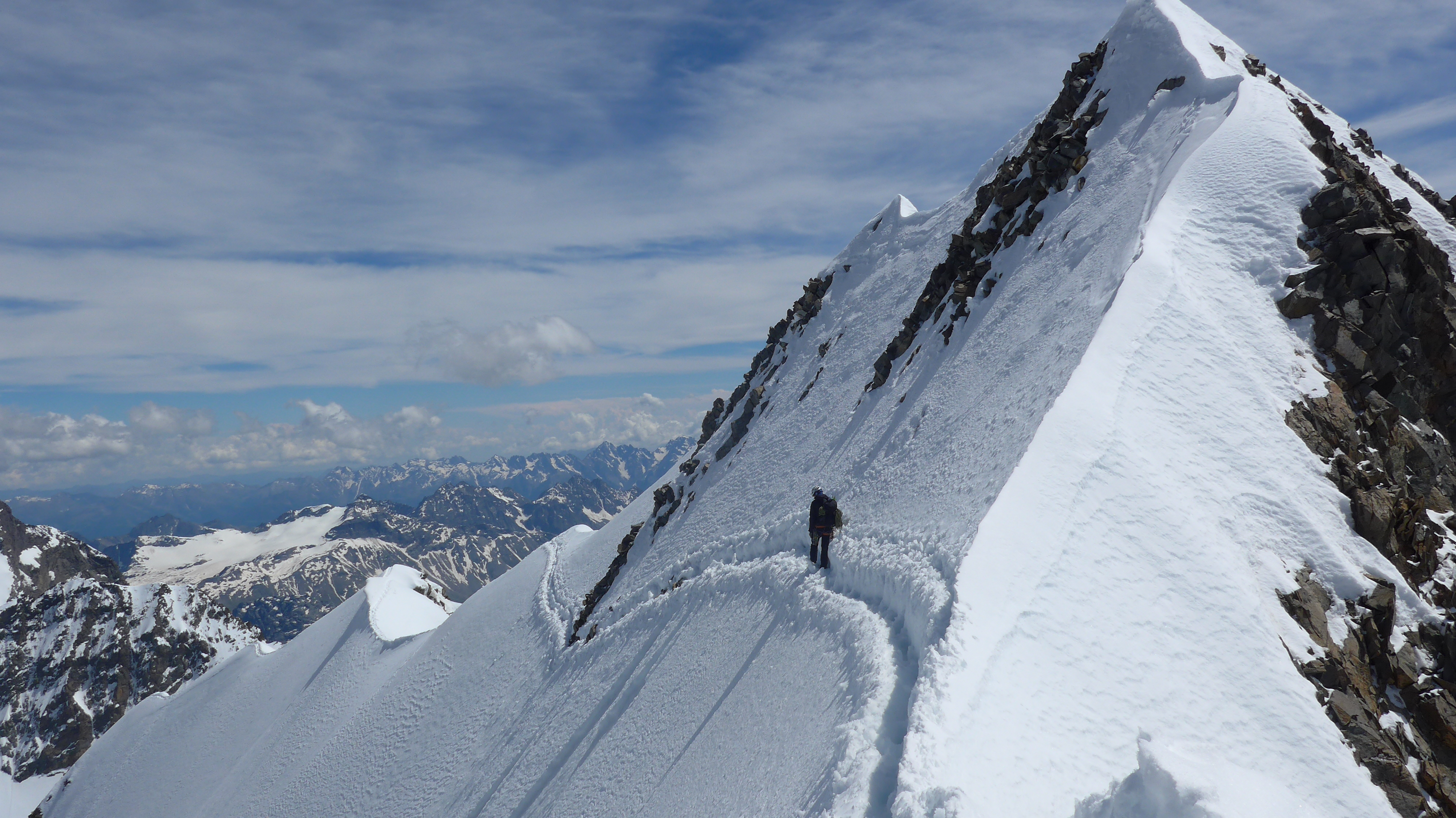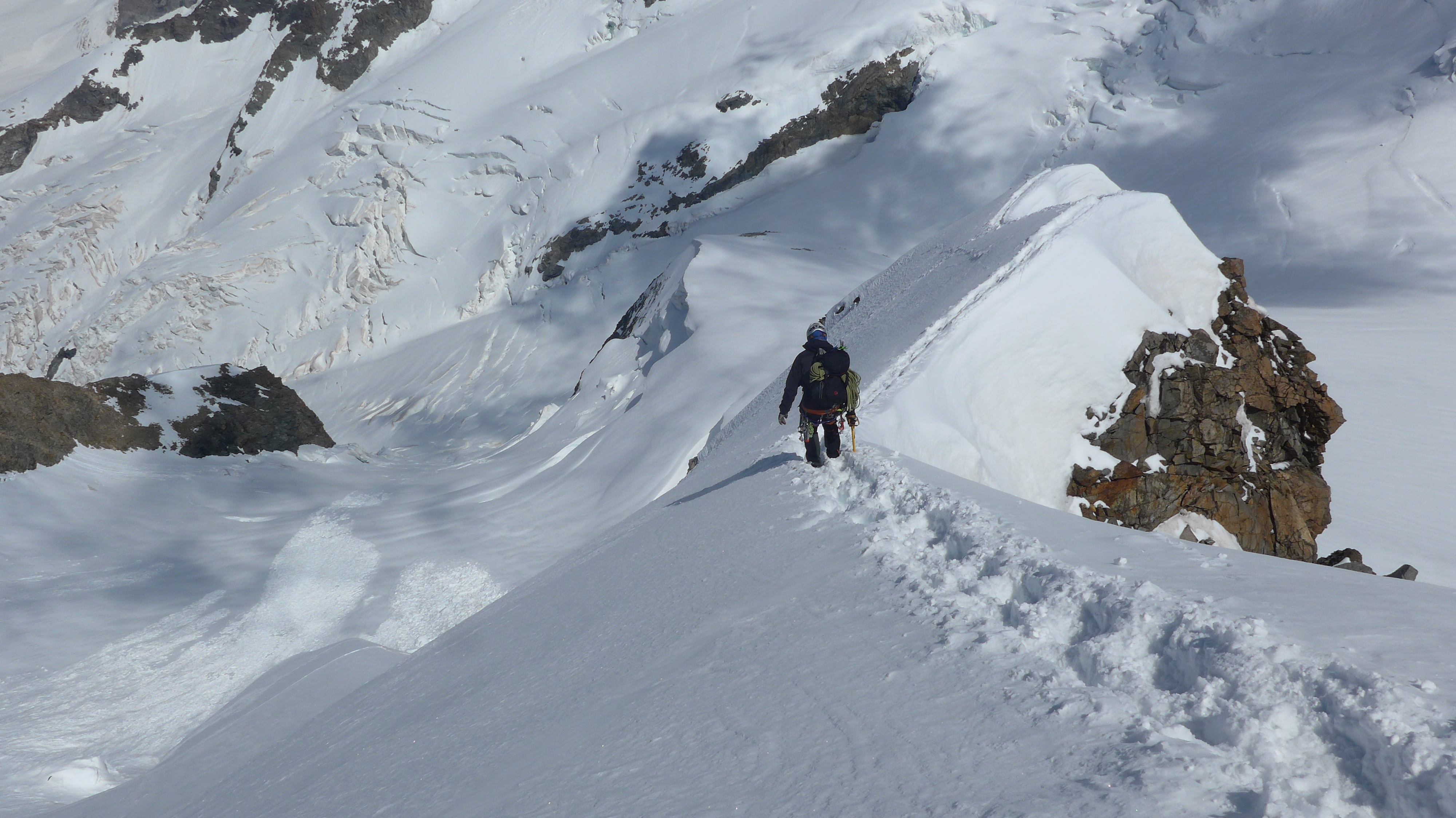 Nach der ersten Seillänge der Kletterei ist die Orientierung etwas schwieriger gewesen, da teils schneebedeckt. Die Topo´s (u.a. Bergsteigen.com + topoführer Bündner Alpen = tolles Buch) lassen die mindestens doppelt so lange Kletterstrecke auf 3 Seillängen zusammenschrumpfen, bis es in´s Firnfeld geht. Der erste Felsriegel mußte überklettert werden, keine Firnumgehung möglich - etwas höherer Zeitaufwand. Der 2. Felsriegel war gut zu umgehen. Nun folgt der lange, steile 40° + mehr und sehr ausgesetzte Schneegrat. Meist relativ gut zu gehen - gute Firnauflage - noch keine Blankeisstellen.