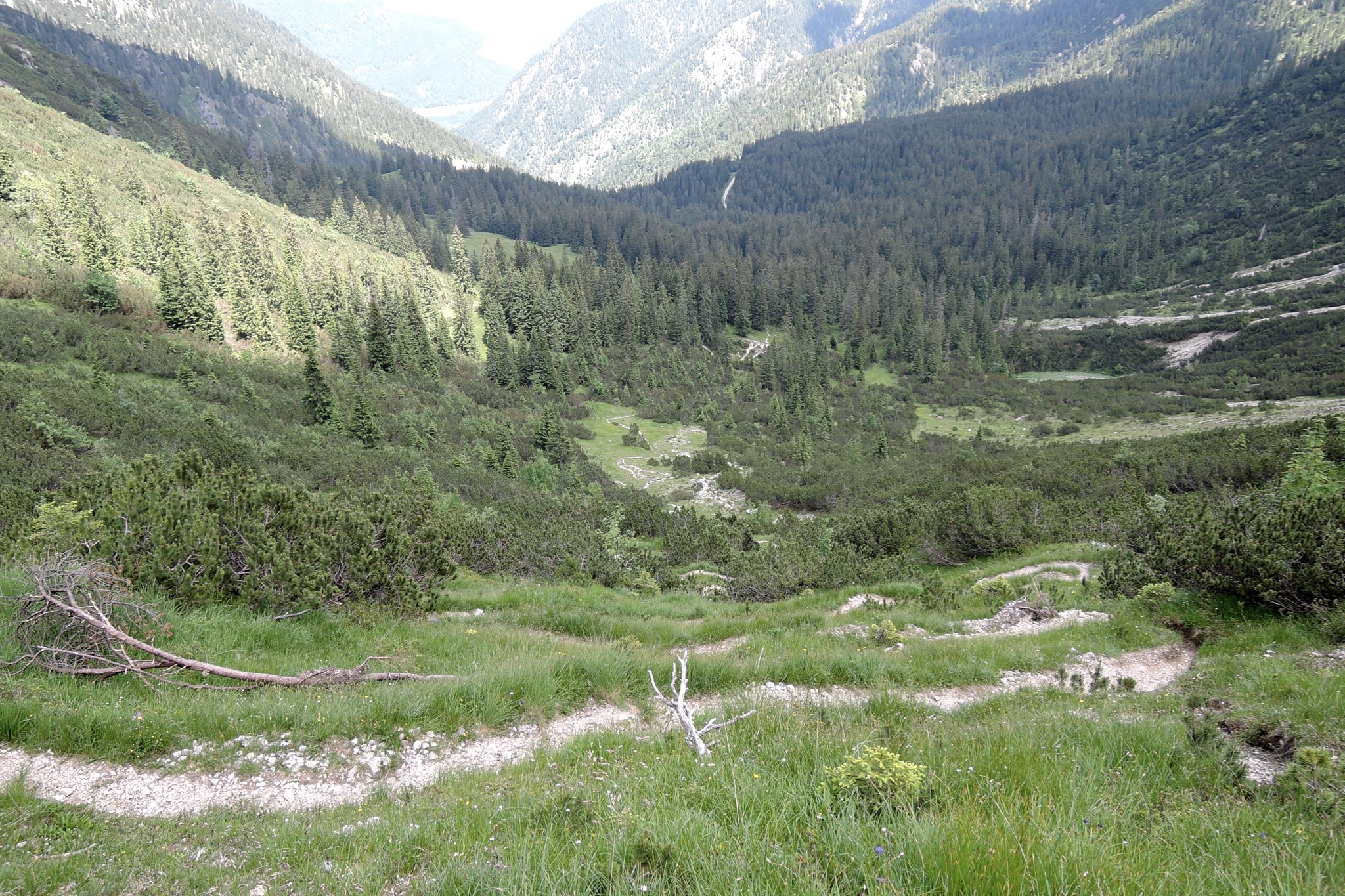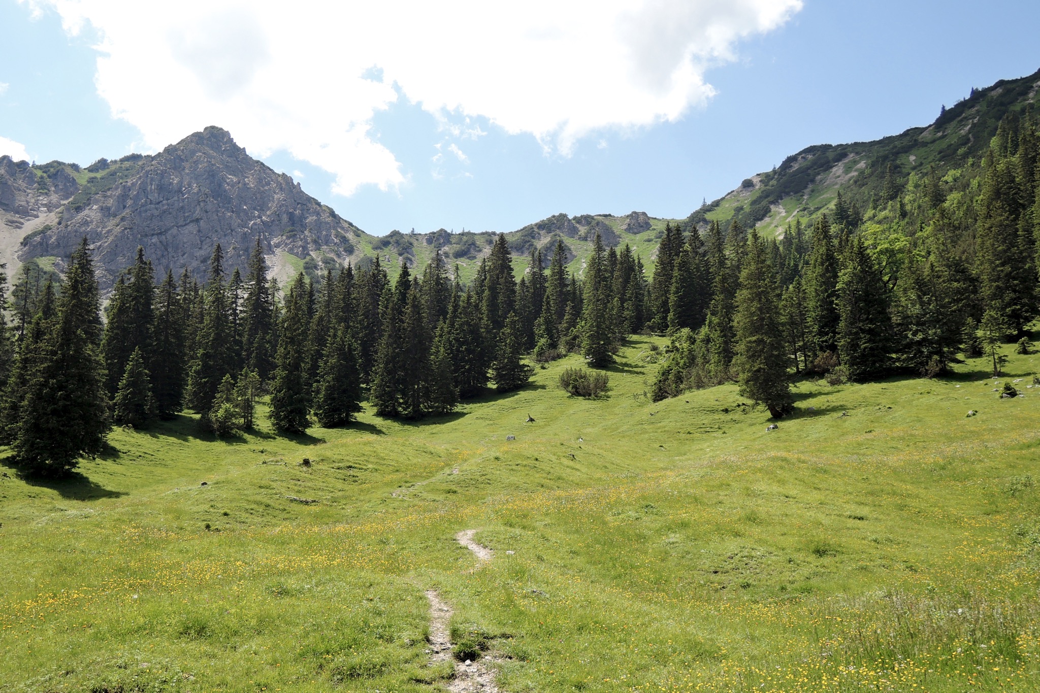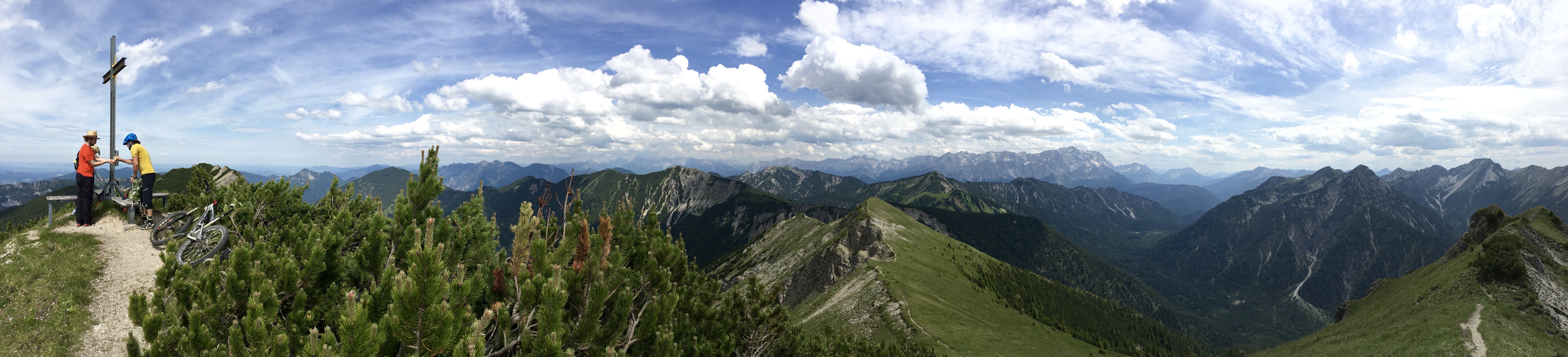 Sonstiges: Vom WP bei Graswang (880m) Richtung SW zur Linder und an dieser flußabwärts bis zur Brücke, dort rechts Richtung SO nach Dickelschwaig und weiter Richtung Kienjoch. Am Abzweig “Kuhalmstr.” rechts auf den kleinen Pfad und auf diesem bald steil Richtung SW durch den Wald hinauf. Auf 1050m trifft man auf die Forstrasse, der man nach links bergauf Richtung Notkarspitze/Kienjoch folgt. Auf 1320m lässt man die Kuhalm links liegen und folgt auf 1380m am Wegweiser “Kienjoch” dem Pfad rechts Richtung SW durch lichten Wald und über die Almwiesen “In den Gruben”. Auf etwa 1600m steilt der Pfad ordentlich auf und es geht in zahllosen Kehren hinauf zum Sattel (1772m) zwischen Kienjoch (1953m) und Federkopf (1818m). Jetzt noch dem Gratverlauf entlang Richtung NW zum Gipfelkreuz des Kienjochs (1953m) hinauf.
