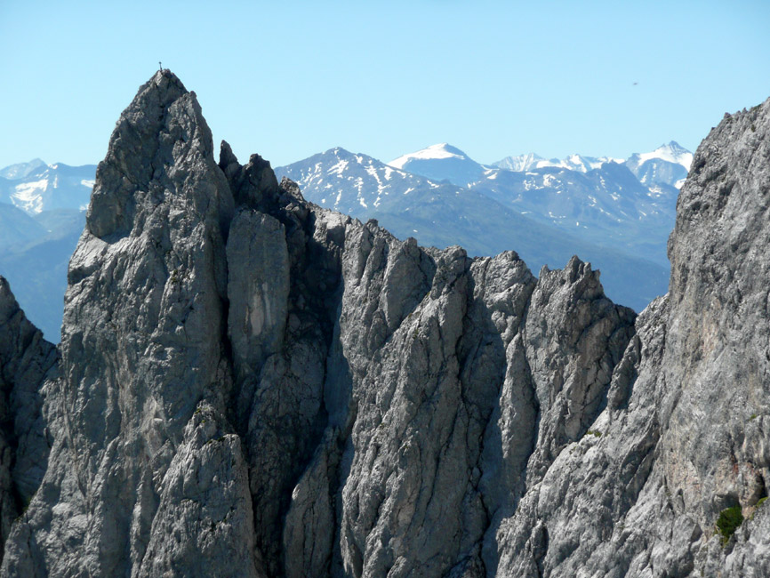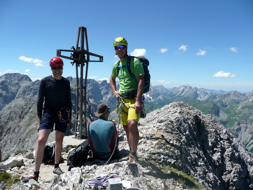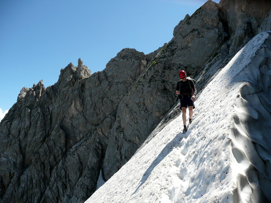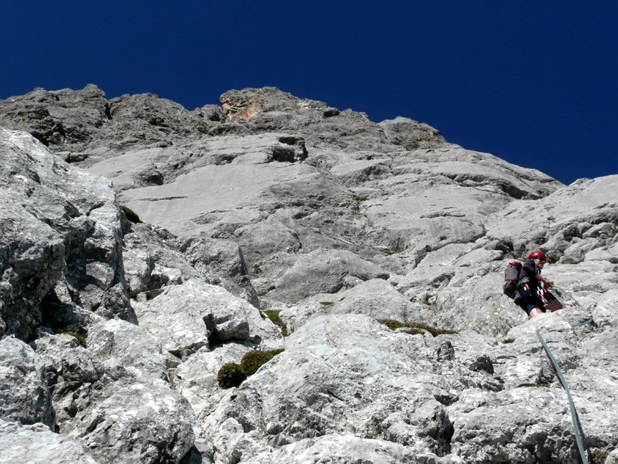 Tourenverhältnisse: Einstieg (IV+) ist die technisch schwierigste Stelle der Nordostkante, danach meist III bis IV. Alles trocken. Fels ab der vierten Seillänge zunehmend bröselig, bisweilen Steinschlag. Alle Standplätze mit Ringhaken gebohrt. An den Schlüsselstellen stecken Haken, sonst mobile Zwischensicherungen (man braucht ca. 6 Expressen, einige vor allem längere Bandschlingen, mittlere Klemmkeile). Abstieg über den Klettersteig (Normalweg).