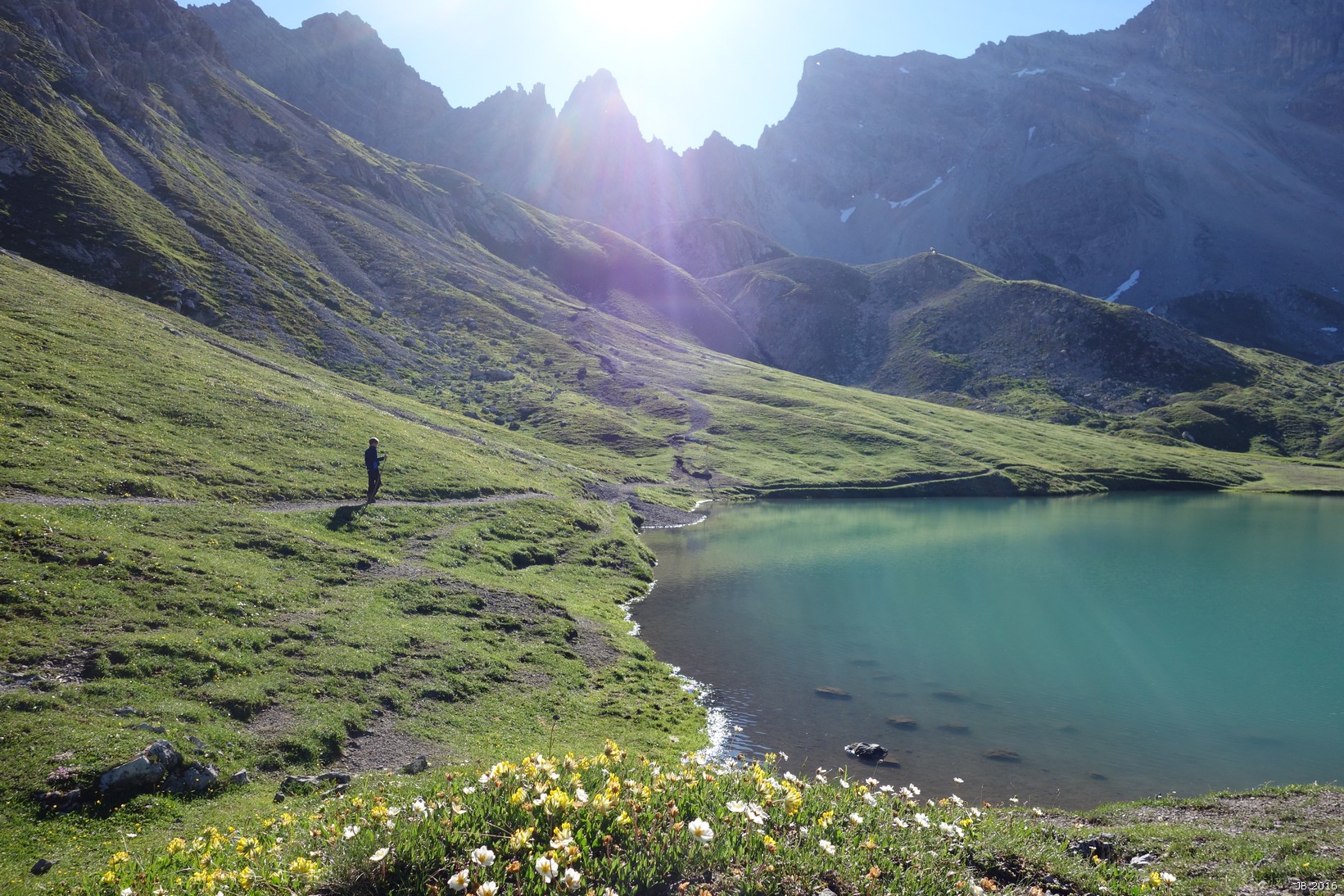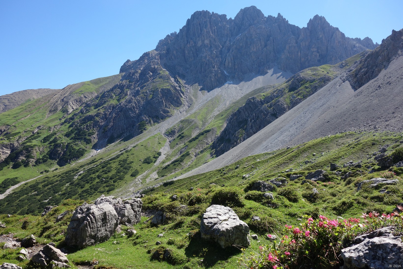 Großsrtige Rundwanderung auf markierten Wegen, abseits der Hüttenwege sehr ruhig. Alpenrosen- Blüte !