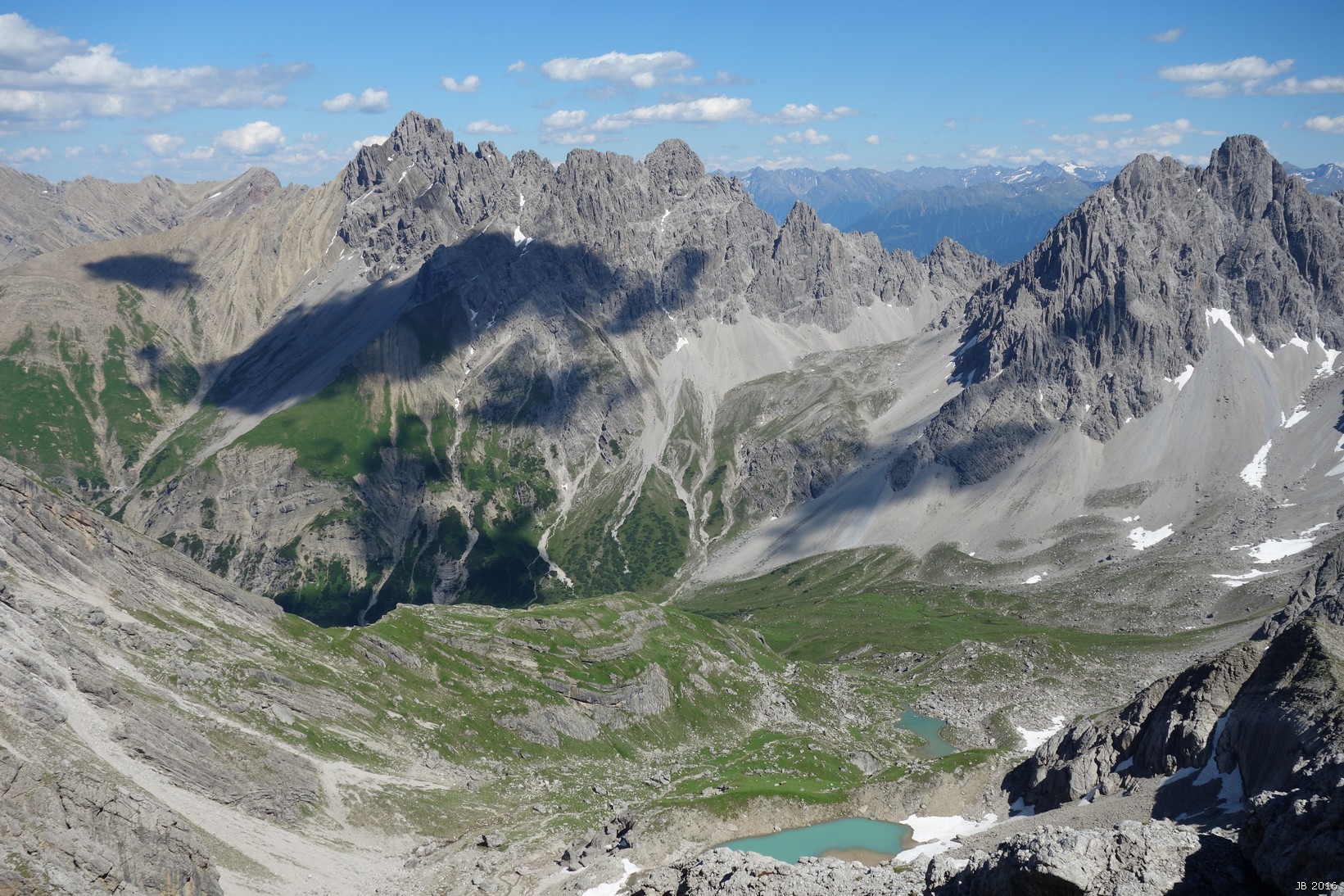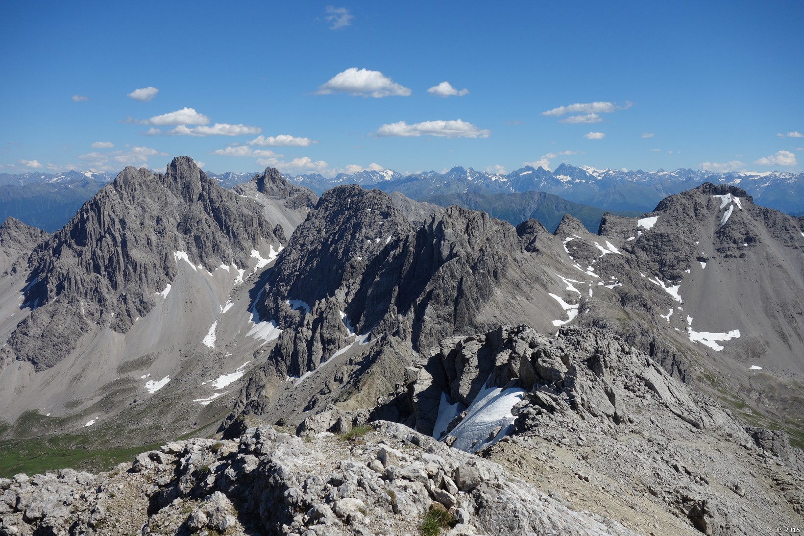Blick vom Gipfel auf Dremelspitze, Bergwerkskopf und Parzinnspitze