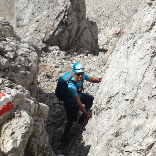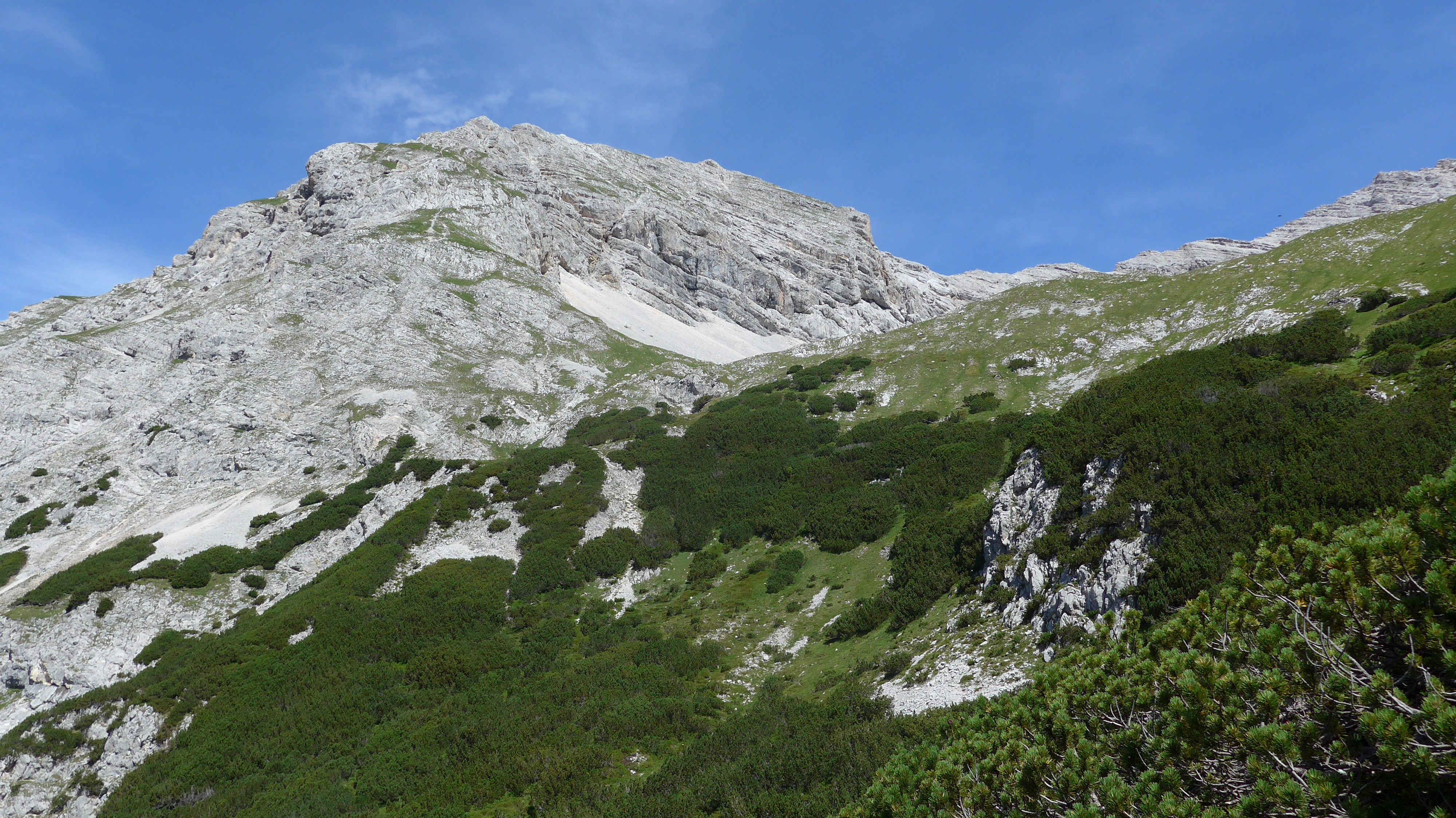 Tourenverhältnisse: Mit dem Radl am Gleirschbach entlang bis zum Radl PP unterhalb der Pfeishütte. Auf gutem Weg weiter durch Latschen in´s Sonntagskar . Schotterreise hinauf bis zum gut markiertem Felsteil I - II. Relativ fest - für Karwendel. Teils Schotter.