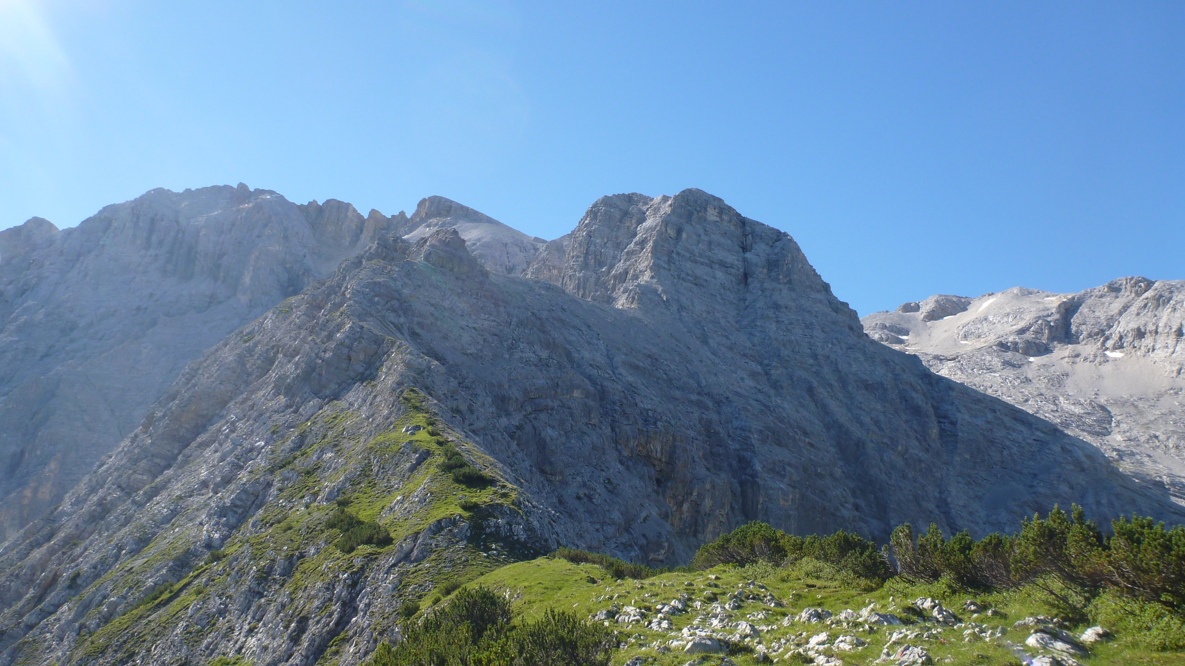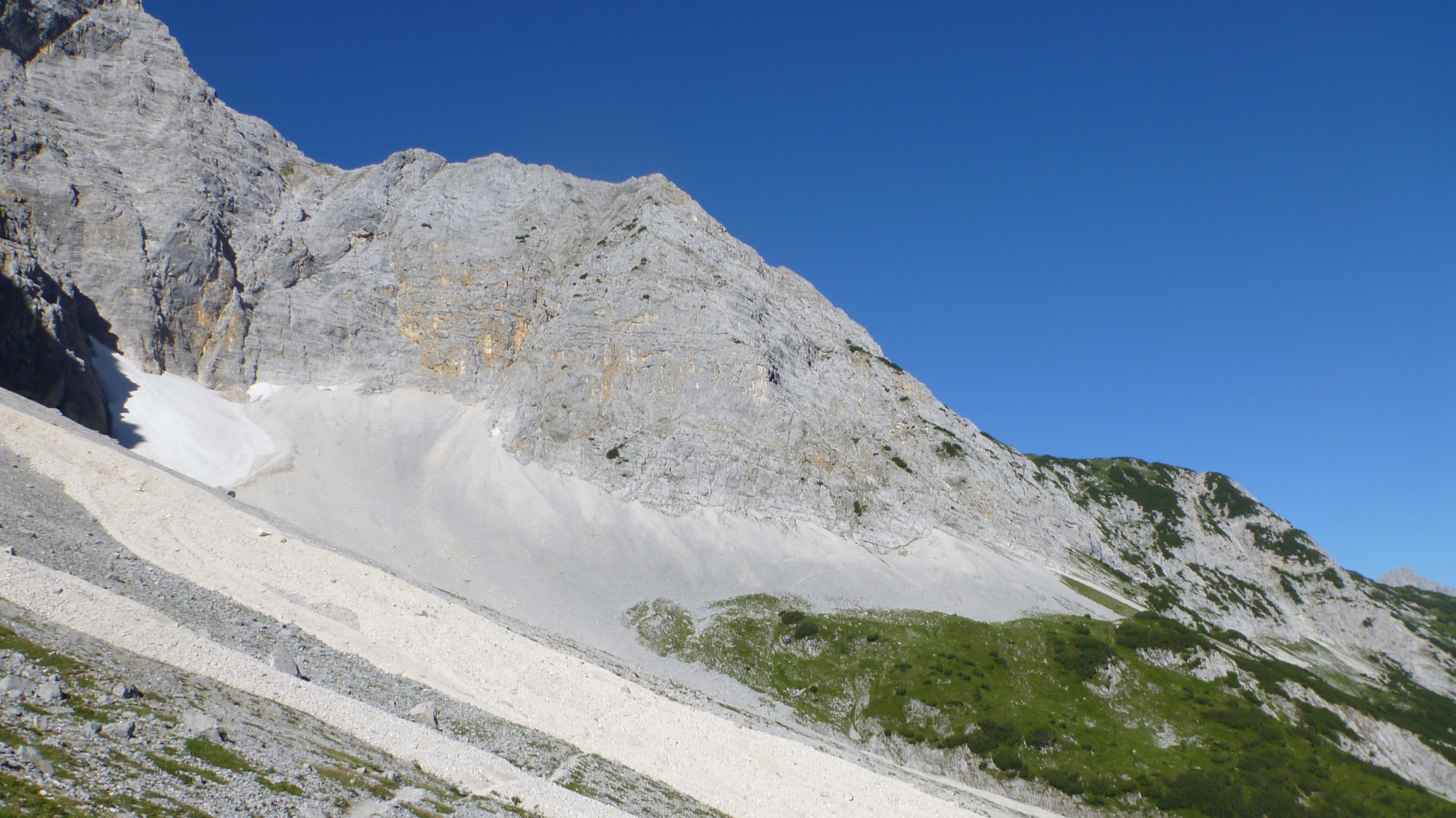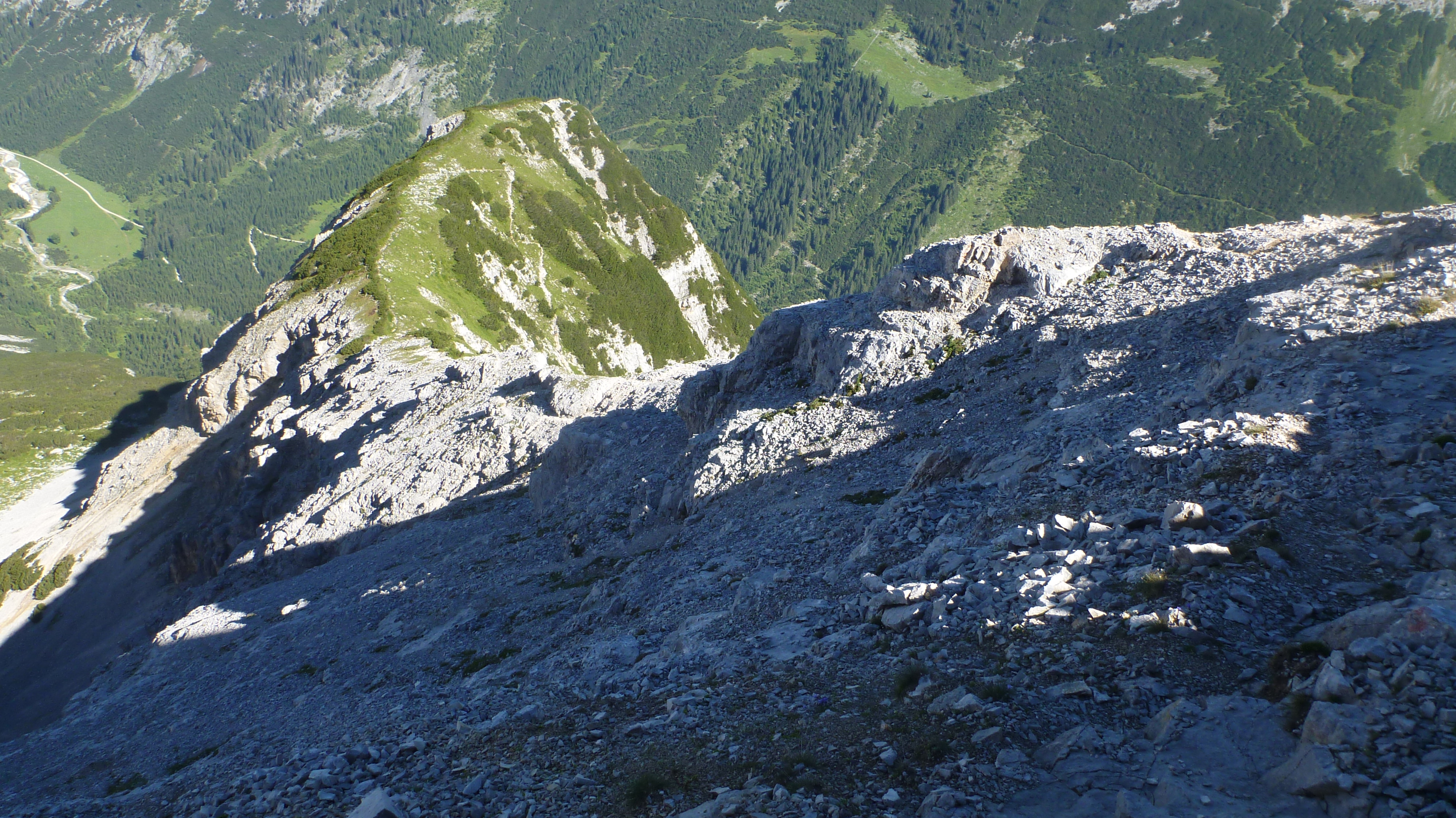 Sonstiges: Auffahrt mit dem Bike um 5:45 Uhr zum Karwendelhaus, durch die Lawinenverbauungen aufwärts Richtung Schlauchkar und nach 20 min abbiegen in den Brendelsteig. Durch Karwendelschotter die Flanke querend und durch Latschen und Schrofen nach oben zum Grat (mehrere kurze Seilversicherungen). Am Grat über Wiesen, später Schotter und leichtes Schrofengelände (UIAA I) auf die sperrende Felswand zu, dort nach rechts in die Flanke und weiter über Schrofen aufwärts. Es folgt typisches Karwendelgelände, viel Schotter nach links auf den Gipfelhang zu und über diesen zur Westlichen Ödkarspitze. Von dieser am Grat in Gehgelände in 10 Minuten zur Mittleren Ödkarspitze. Weiter am Grat zum Aufschwung der Östlichen Ödkarspitze, hier ist wieder leichte Kletterei nötig. Vom Gipfel abwärts folgt die Schlüsselstelle, die aber mit Hilfe eines Seils entschärft ist. Kurz danach ist der Schlachkarsattel erreicht. Von dort Besteigung der Birkkarspitze. Abstieg durch das Schlachkar in einer guten Stunde und mit dem Rad zurück zum Ausgangspunkt.