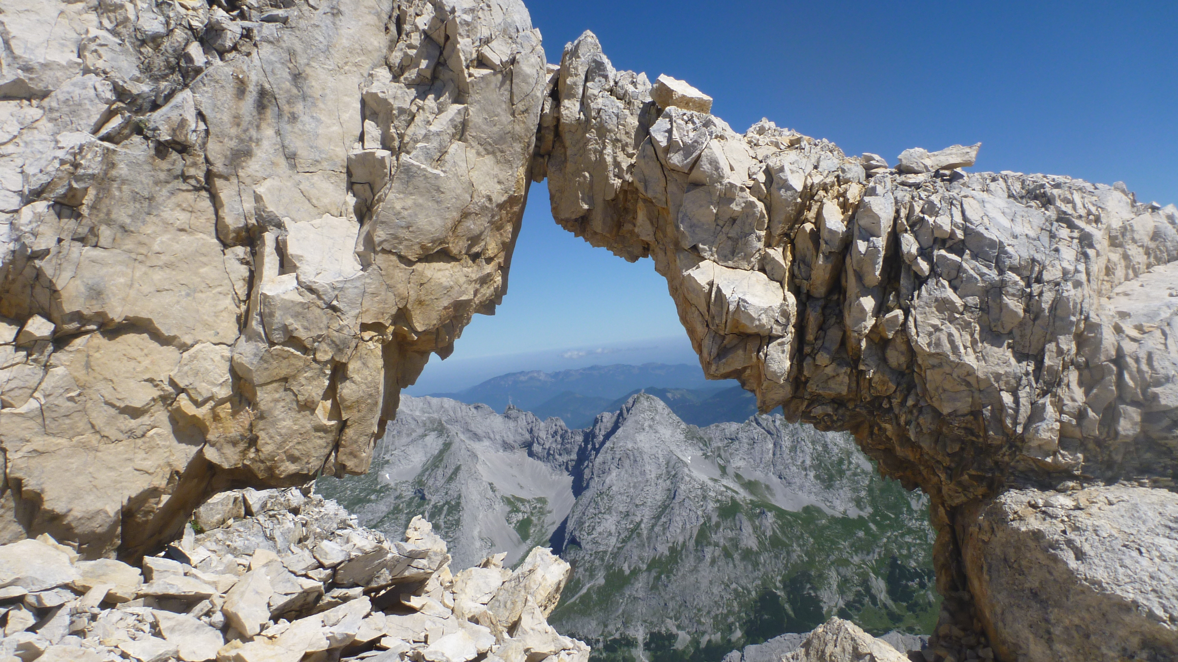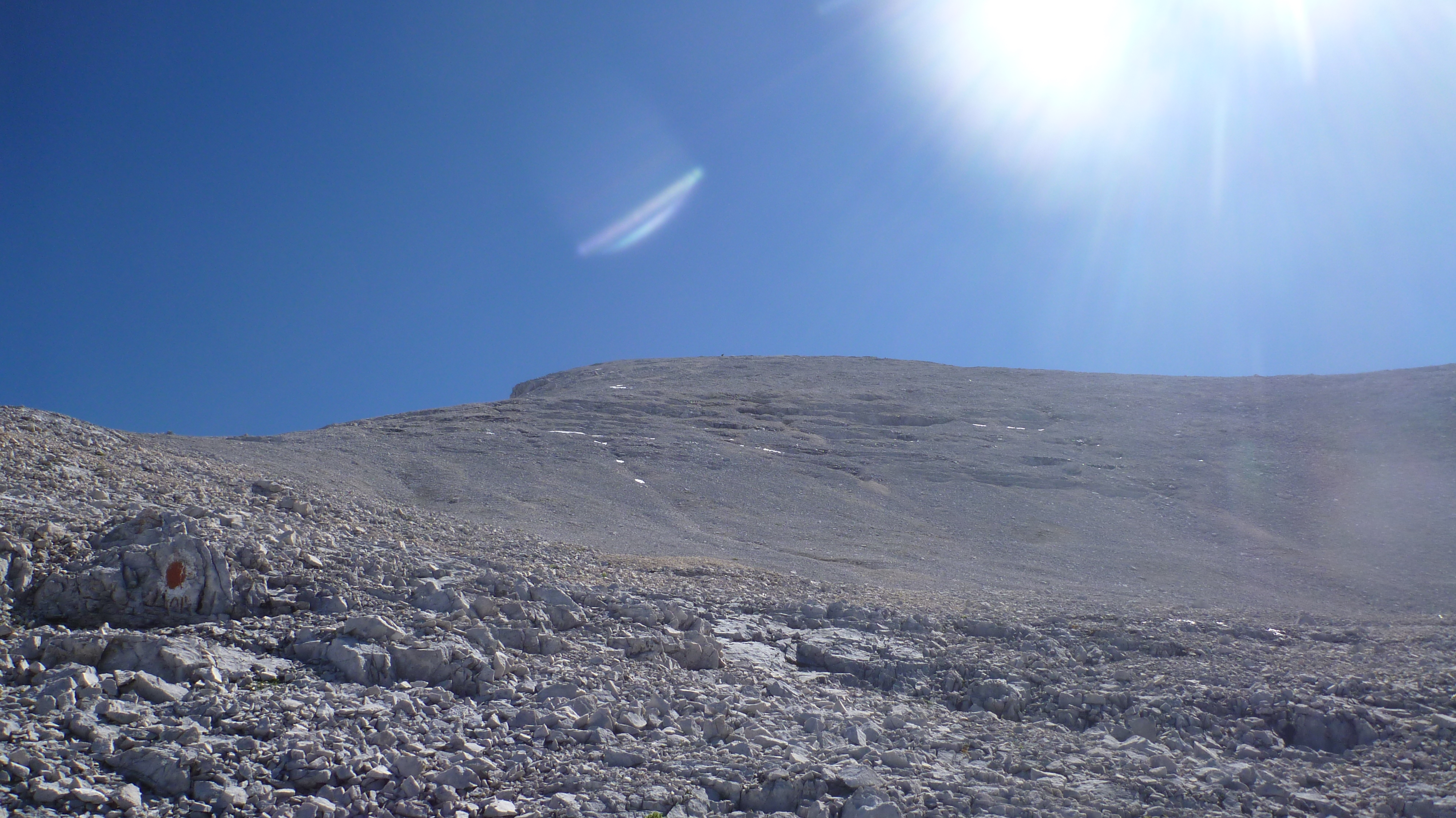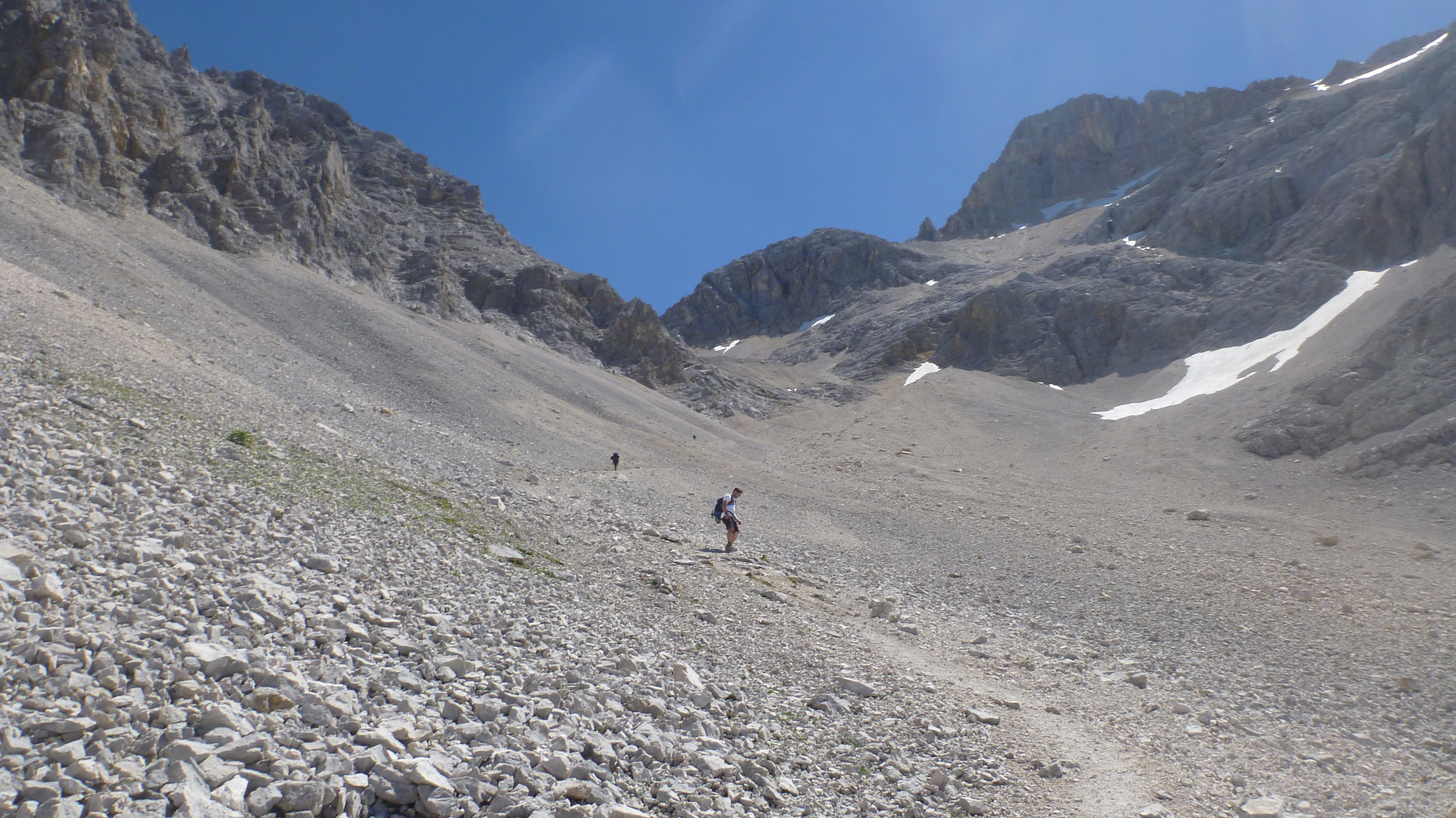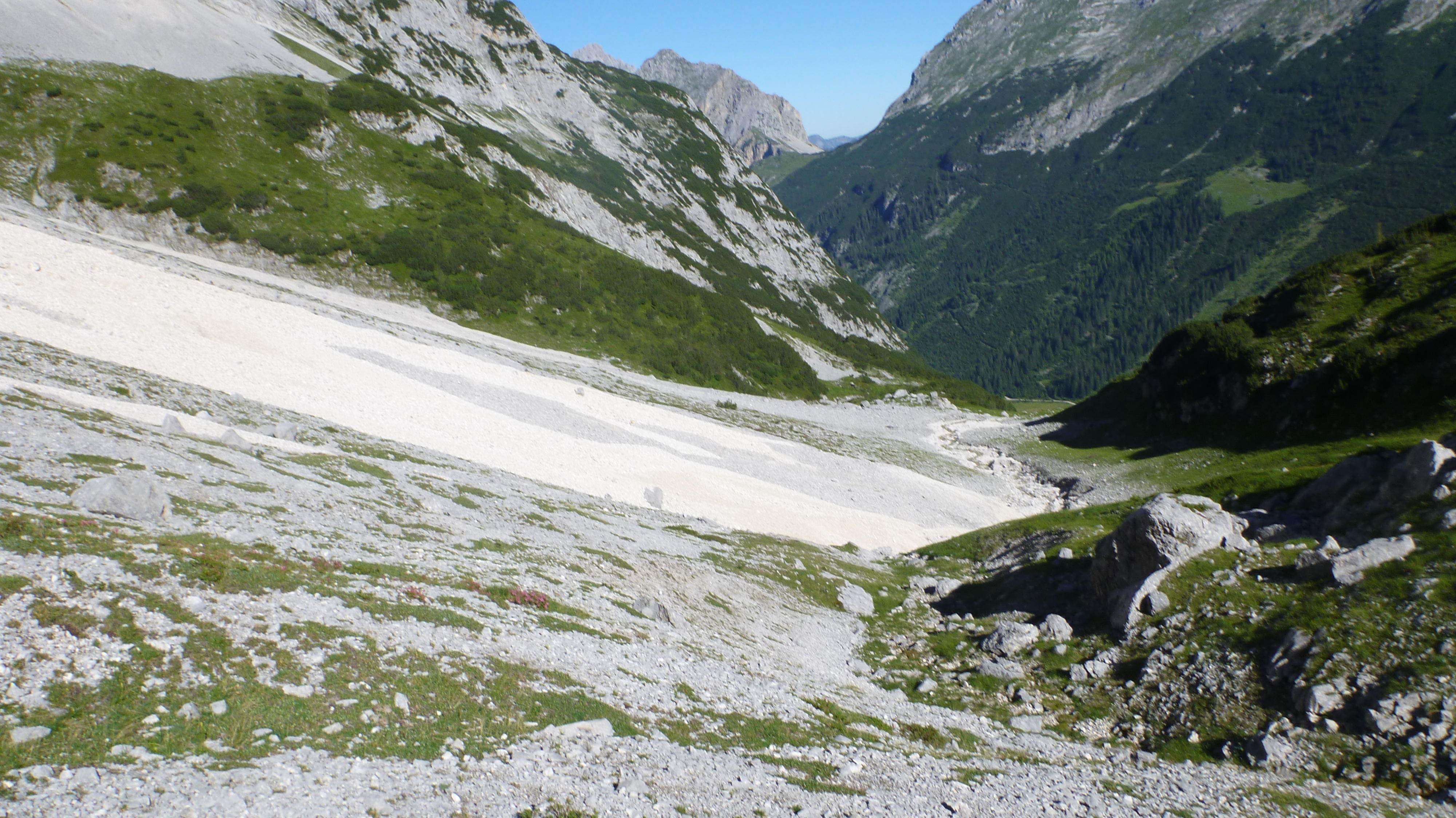 Sonstiges: Auffahrt mit dem Bike um 5:45 Uhr zum Karwendelhaus, durch die Lawinenverbauungen aufwärts Richtung Schlauchkar und nach 20 min abbiegen in den Brendelsteig. Durch Karwendelschotter die Flanke querend und durch Latschen und Schrofen nach oben zum Grat (mehrere kurze Seilversicherungen). Am Grat über Wiesen, später Schotter und leichtes Schrofengelände (UIAA I) auf die sperrende Felswand zu, dort nach rechts in die Flanke und weiter über Schrofen aufwärts. Es folgt typisches Karwendelgelände, viel Schotter nach links auf den Gipfelhang zu und über diesen zur Westlichen Ödkarspitze. Von dieser am Grat in Gehgelände in 10 Minuten zur Mittleren Ödkarspitze. Weiter am Grat zum Aufschwung der Östlichen Ödkarspitze, hier ist wieder leichte Kletterei nötig. Vom Gipfel abwärts folgt die Schlüsselstelle, die aber mit Hilfe eines Seils entschärft ist. Kurz danach ist der Schlachkarsattel erreicht. Von dort Besteigung der Birkkarspitze. Abstieg durch das Schlachkar in einer guten Stunde und mit dem Rad zurück zum Ausgangspunkt.