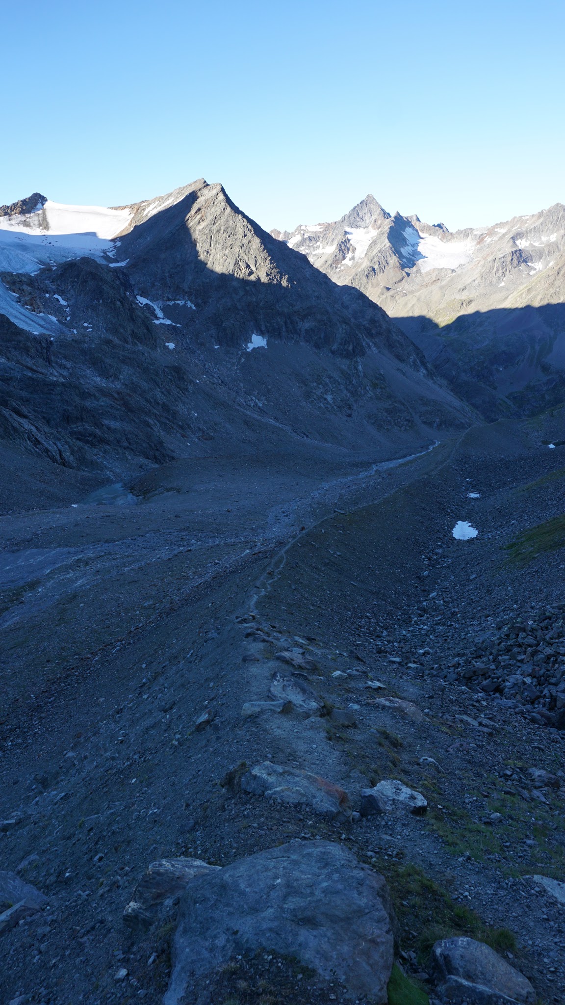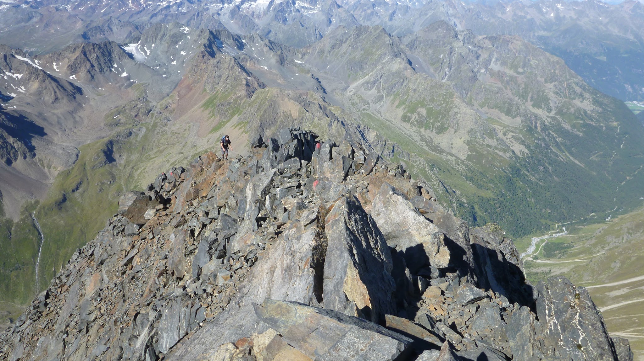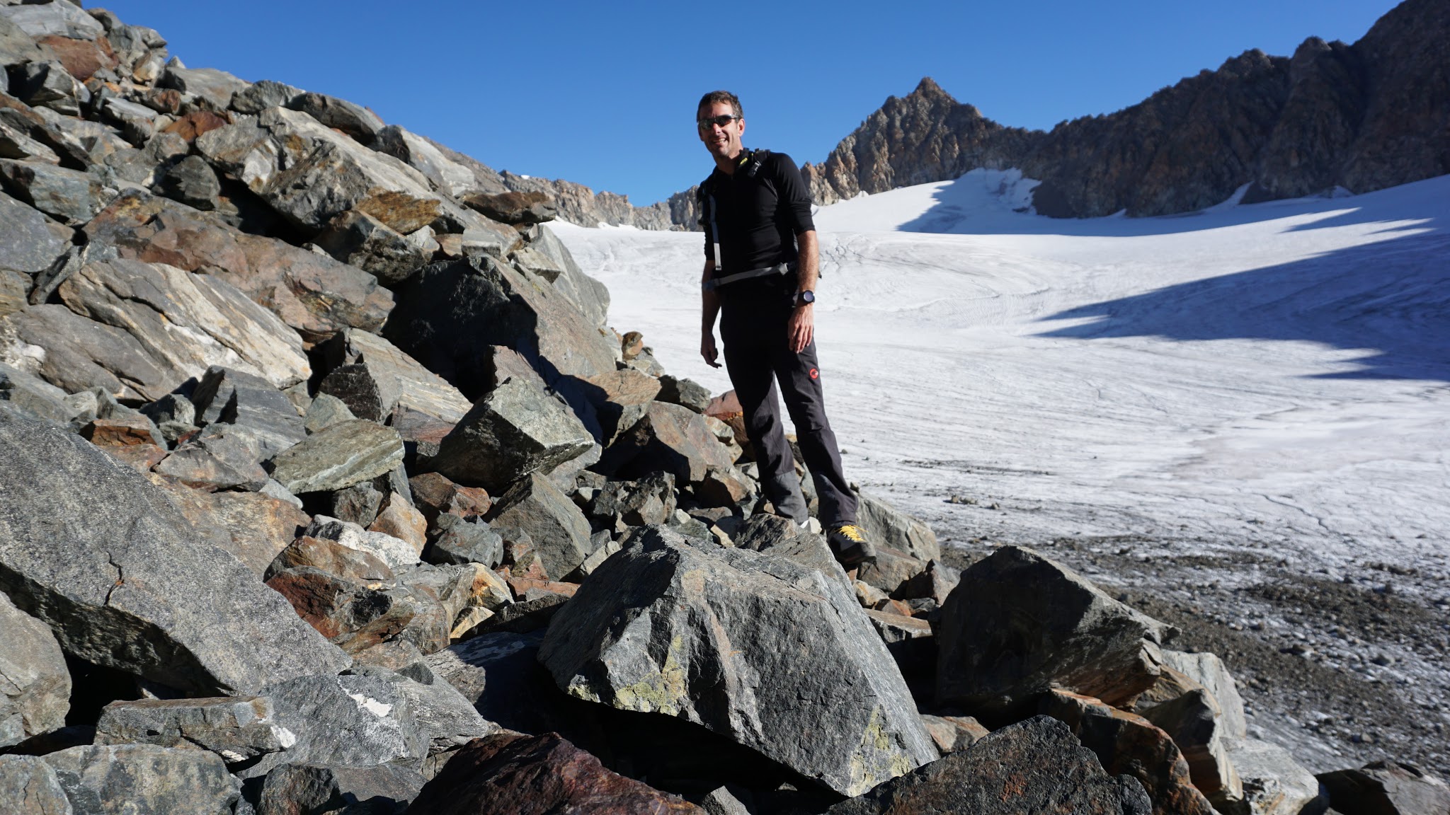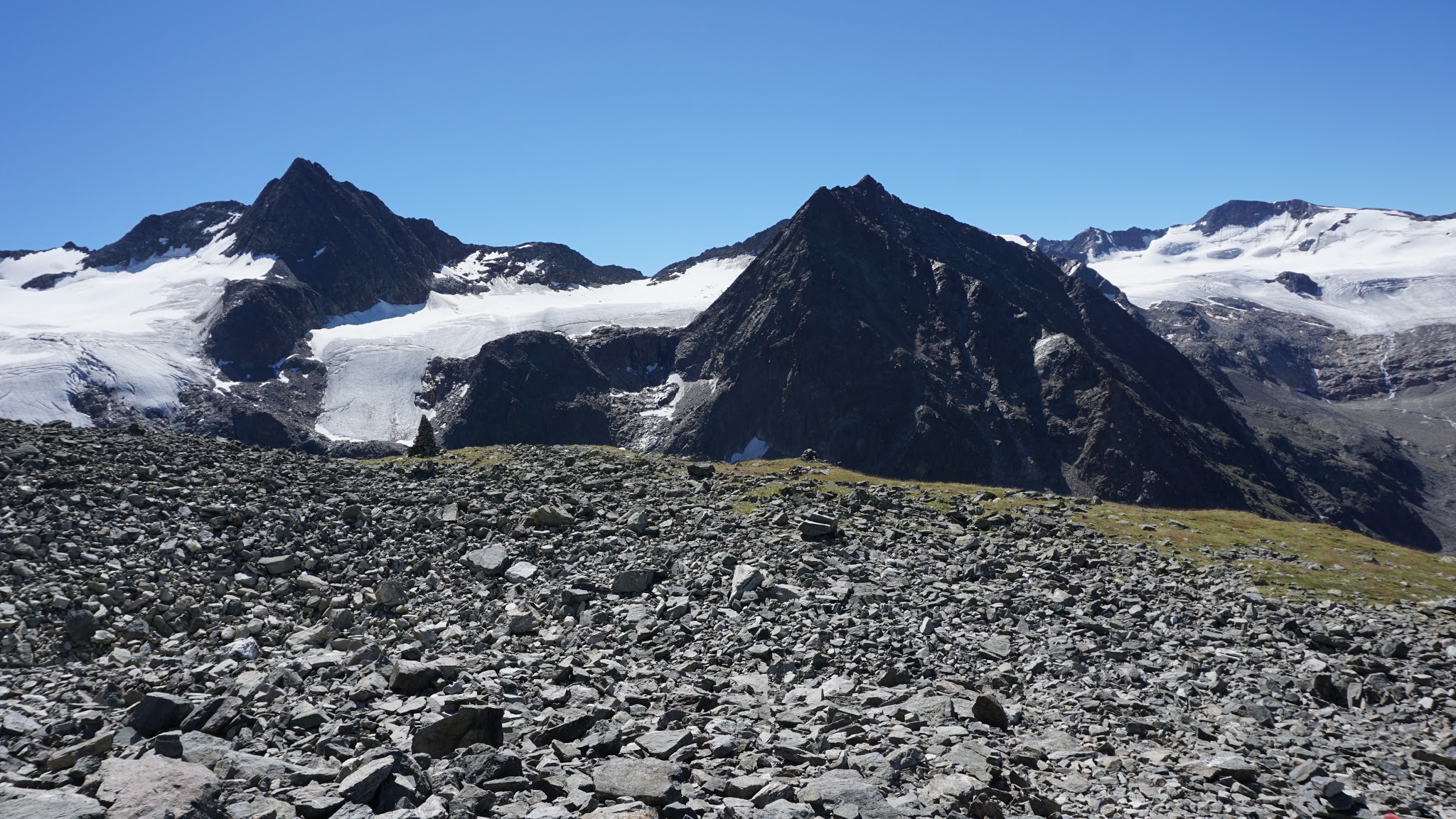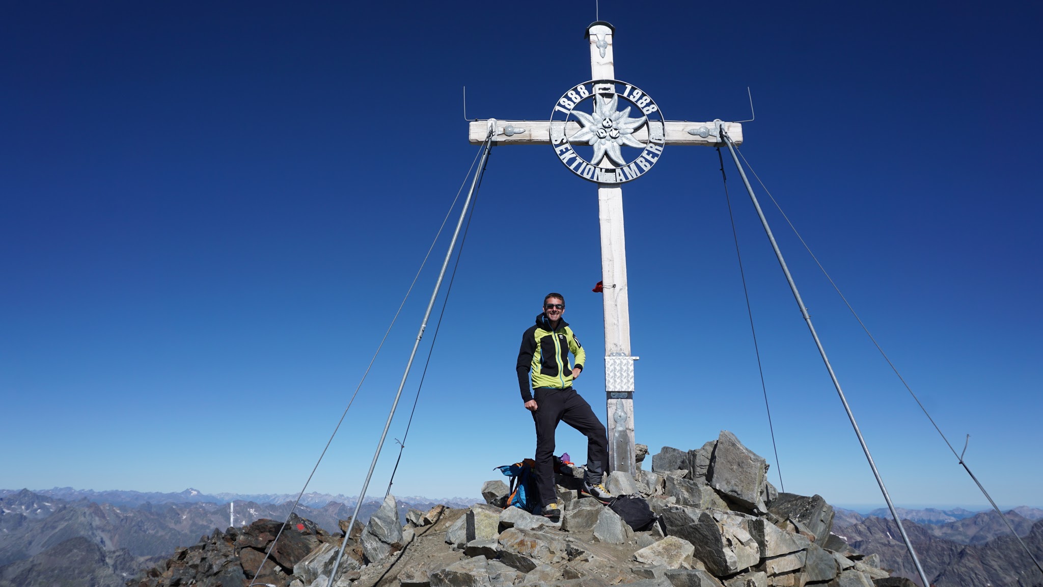 Sonstiges: Auffahrt am Nachmittag mit dem Mountainbike zur Amberger Hütte, von dort am nächsten Morgen erst entlang der Sulze und dann über den Weidehang aufwärts zur Moräne und über diese zum Beginn des Schwarzbergferners. Dort über den Nord-Ost Grat in leichter Schutt- und Blockkletterei auf den Gipfel. Abstieg über den Süd-West-Grat, nach unten hin Serpentinensteig zum Hohen Egg und über die Moräne zur Amberger Hütte.
