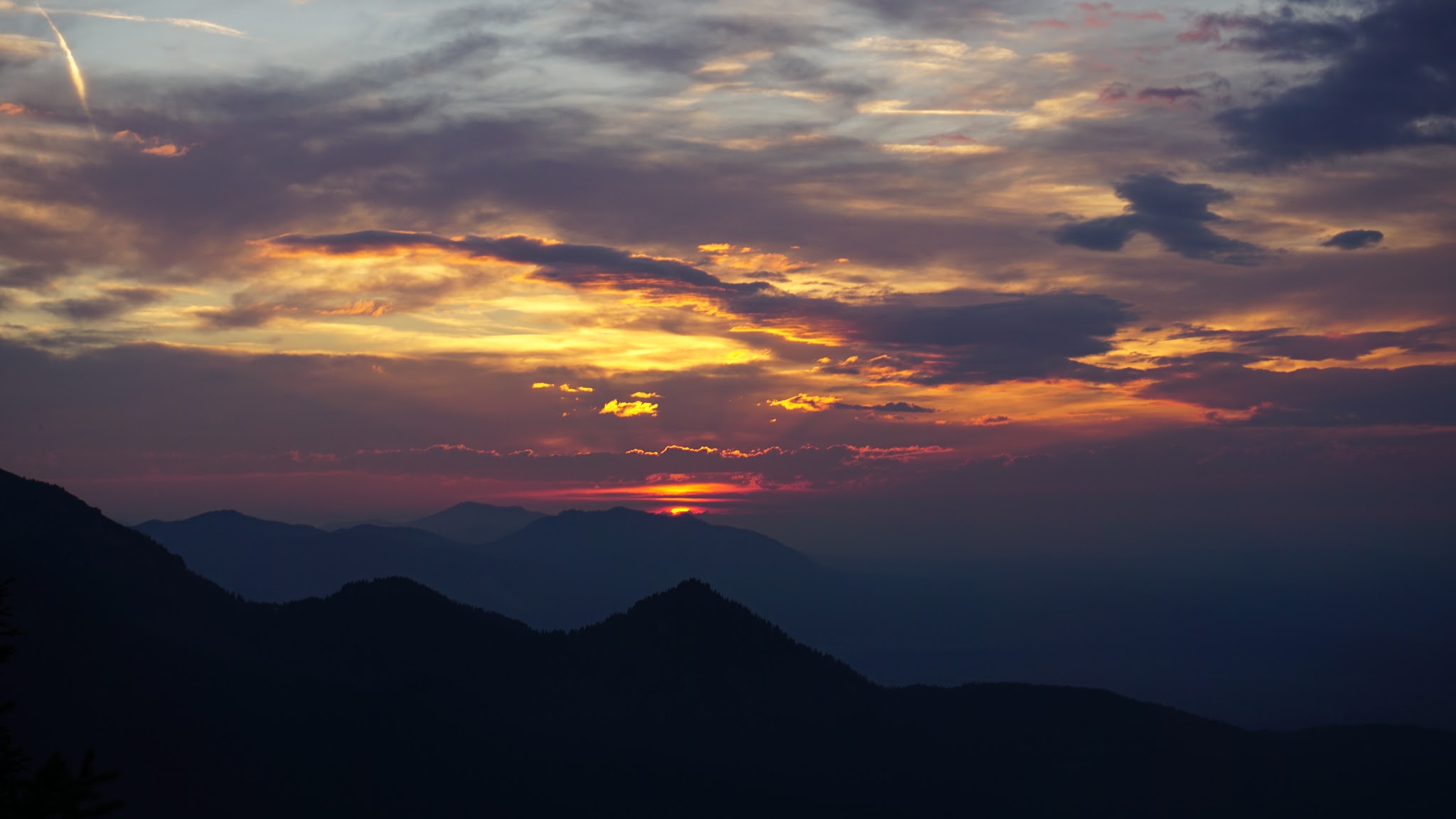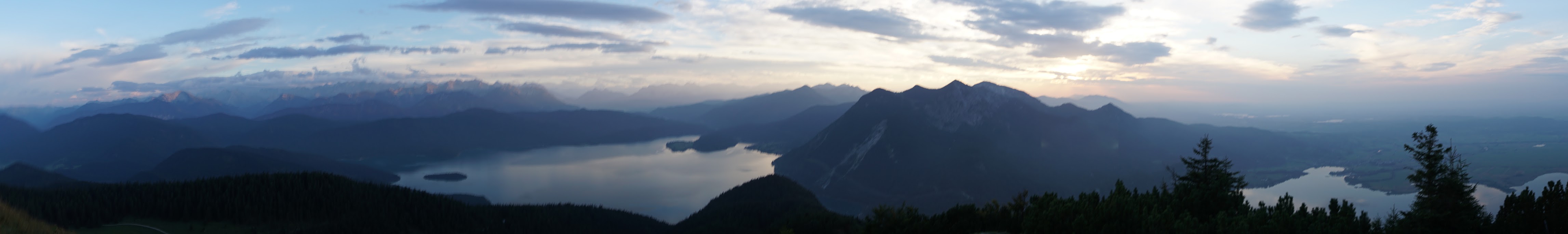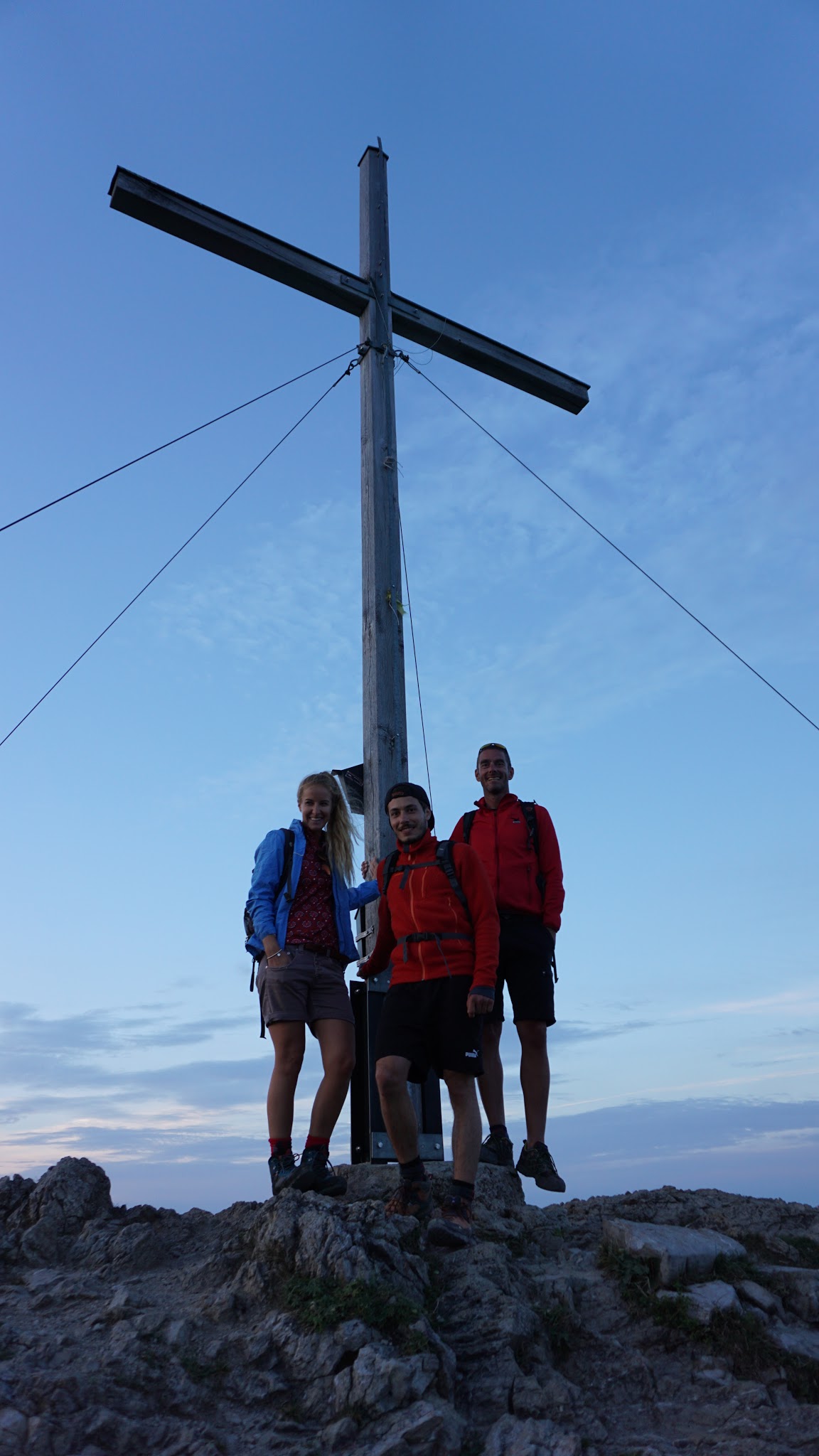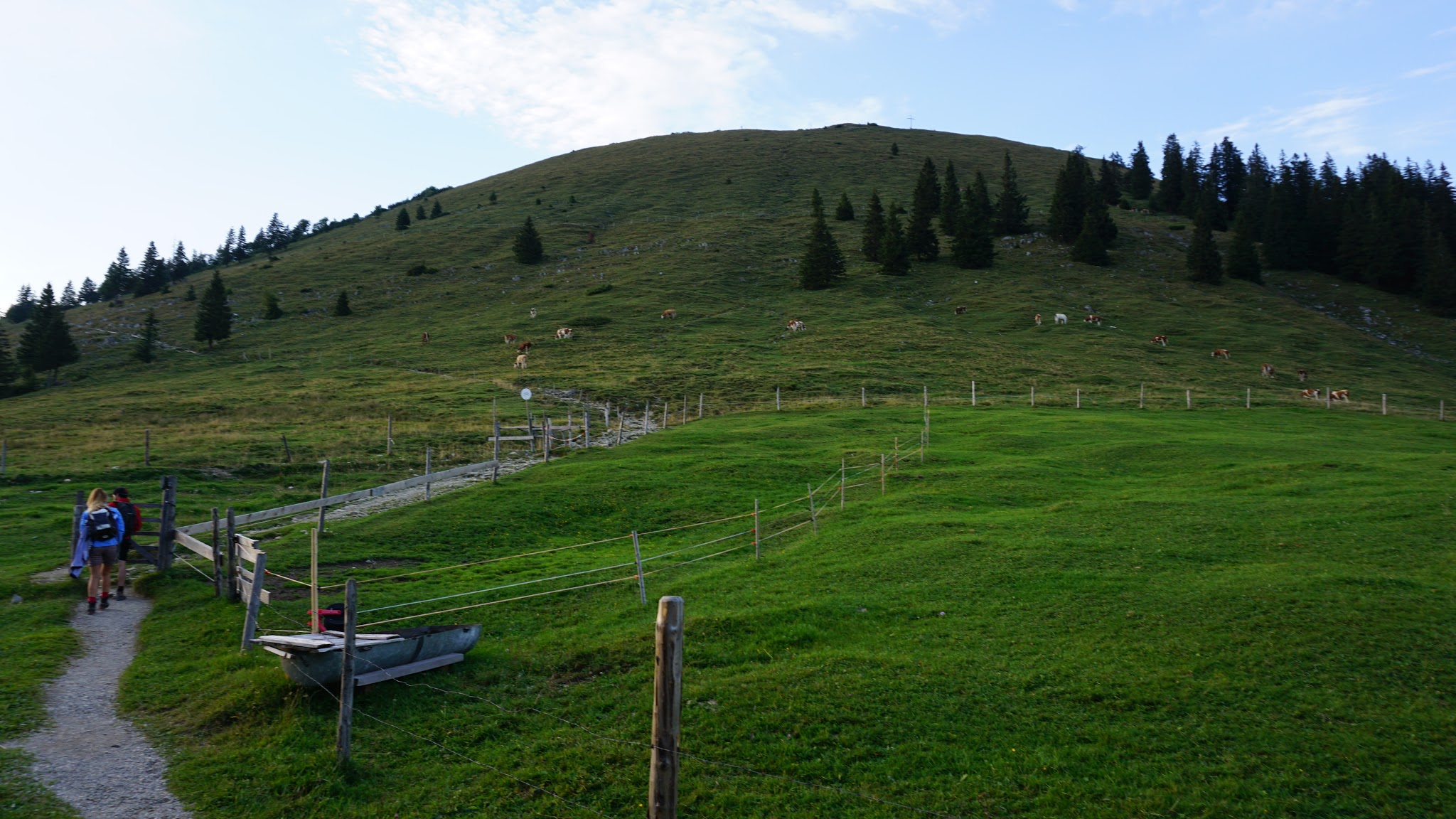 Sonstiges: vom Parkplatz gegen 18 Uhr gestartet, zunächst in vielen Serpentinen durch den Wald nach oben, dann am Wegweiser zur Jocheralm weiter (nur bis 17 Uhr geöffnet). Nach Pause über den Weidenhang nach oben zum Gipfelkreuz. Abstieg nach Sonnenuntergang über Normalweg zurück zum Auto.