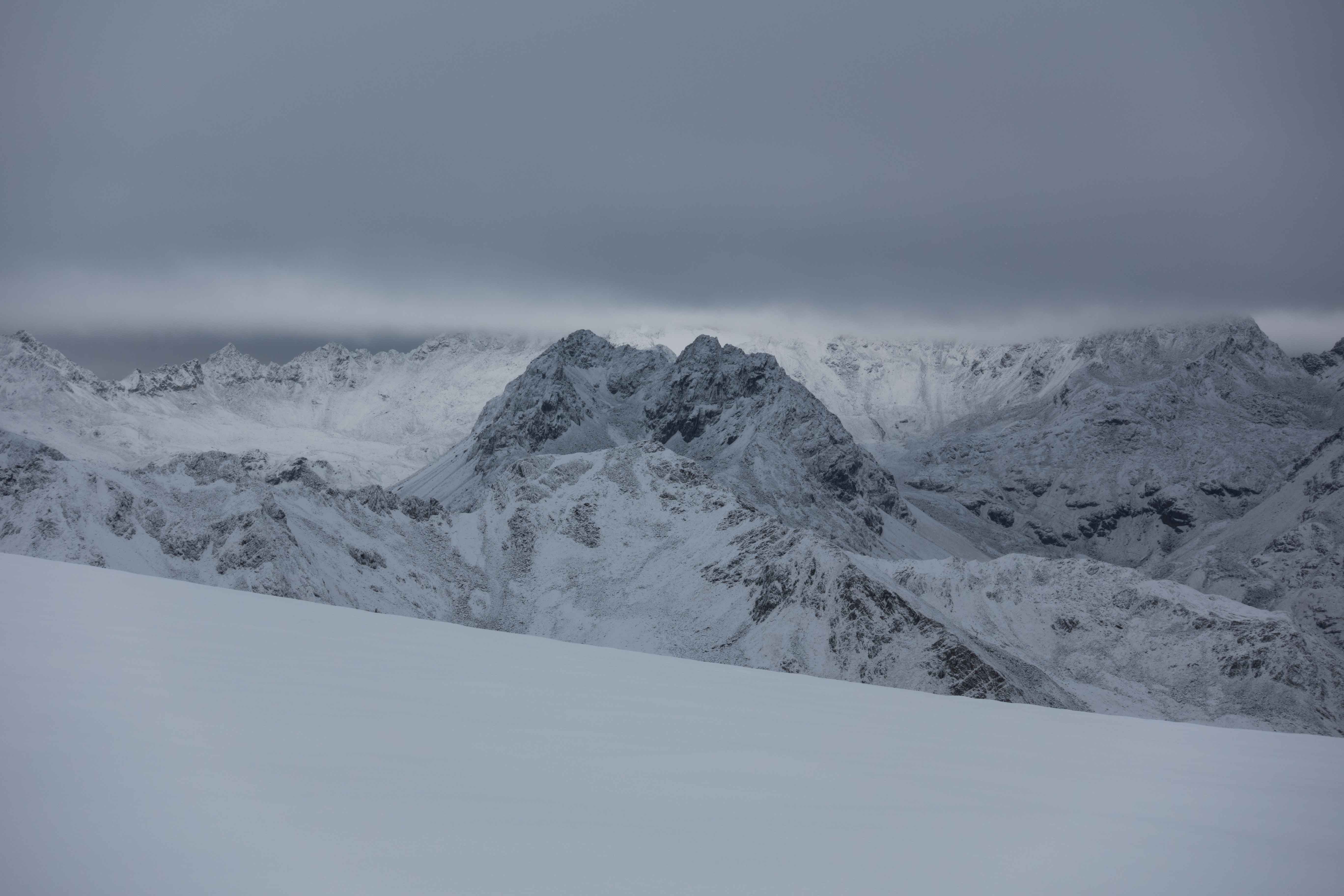 Tourenverhältnisse: Nach dem Durchzug der Front (Abkühlung auf -7 Grad, lebhafter Wind aus NW in der Nacht auf Montag) nochmals 5-15 cm Neuschnee. Darunter 10cm vom Wochenende davor. Vorher war der Gletscher blank bis >3000m. Daher sind die Spalten relativ offen und durch den Neuschnee oft tückisch zugeweht. Auf dem Weg zum Brandenburger Haus eine sehr heikle Spaltenzone auf ca. 3130m Höhe (1 Spaltensturz bis zur Brust, mehrmals mit dem Fuß/Bein eingebrochen). Alle spärlich vorhandenen Spuren sind mittlerweile zugeweht, niemand unterwegs außer uns über 3 Tage.