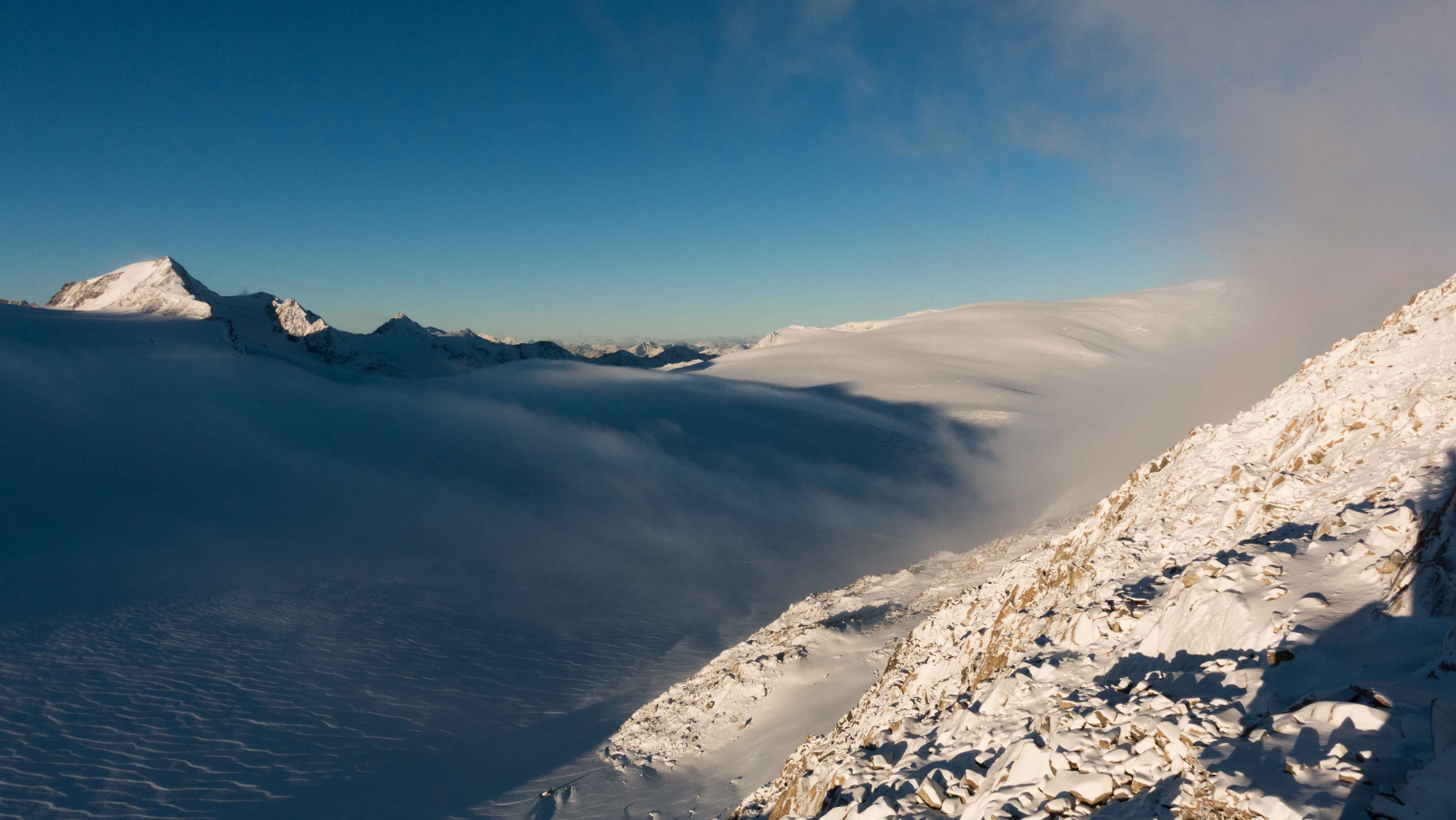 Tourenverhältnisse: Nach dem Durchzug der Front (Abkühlung auf -7 Grad, lebhafter Wind aus NW in der Nacht auf Montag) nochmals 5-15 cm Neuschnee. Darunter 10cm vom Wochenende davor. Vorher war der Gletscher blank bis >3000m. Daher sind die Spalten relativ offen und durch den Neuschnee oft tückisch zugeweht. Auf dem Weg zum Brandenburger Haus eine sehr heikle Spaltenzone auf ca. 3130m Höhe (1 Spaltensturz bis zur Brust, mehrmals mit dem Fuß/Bein eingebrochen). Alle spärlich vorhandenen Spuren sind mittlerweile zugeweht, niemand unterwegs außer uns über 3 Tage.
