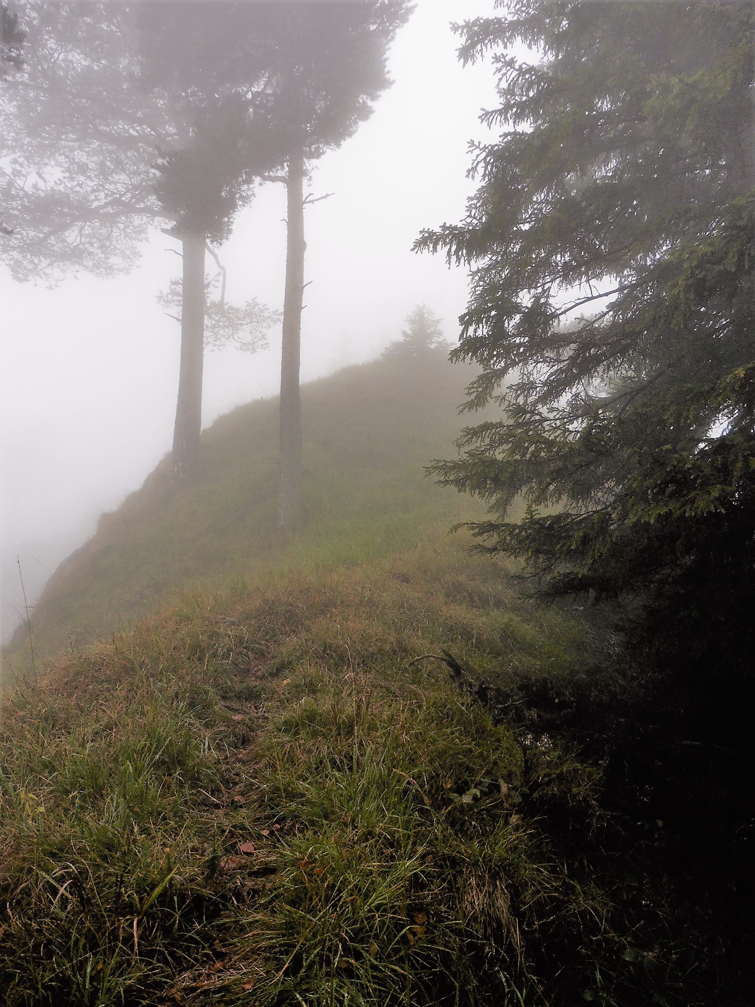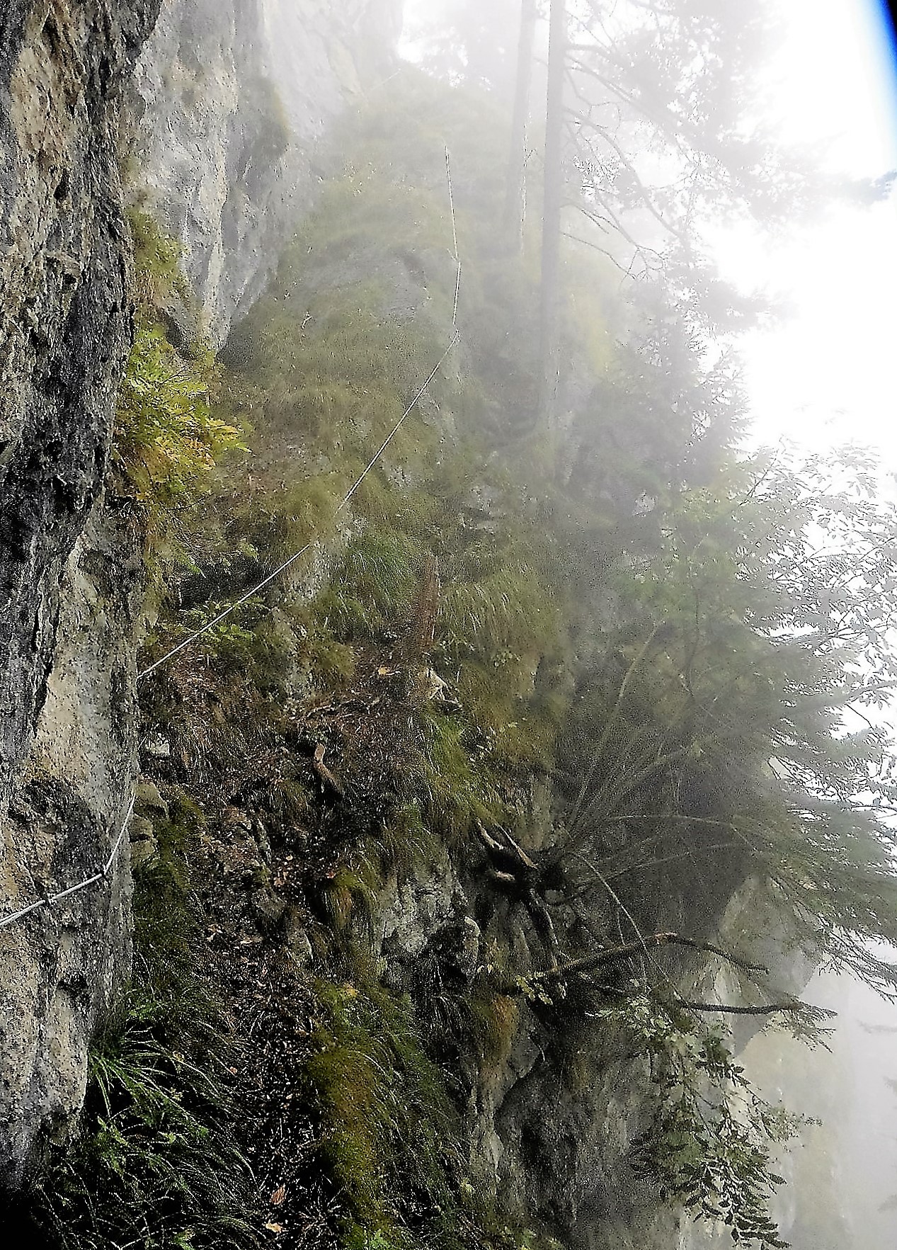 Tourenverhältnisse: sehr ungünstig, der Boden und die gesamte Flora waren tropfnass; hinzu kam am frühen Vormittag dichter Nebel, sodass ich meinen Plan den gesamten Kienberg zu überschreiten nach dem Pfrontner Berg aufgab; im gesamten Bereich gibt es nur schmale Pfade resp. Trittspuren, die teilweise sehr steil und ausgesetzt sind; einige Markierungspunkte erleichtern die Orientierung; an 2 Stellen sind Drahtseile angebracht; Trittsicherheit, Schwindelfreiheit und etwas Kletterfertigkeit sind notwendig; ca. 560 Hm;