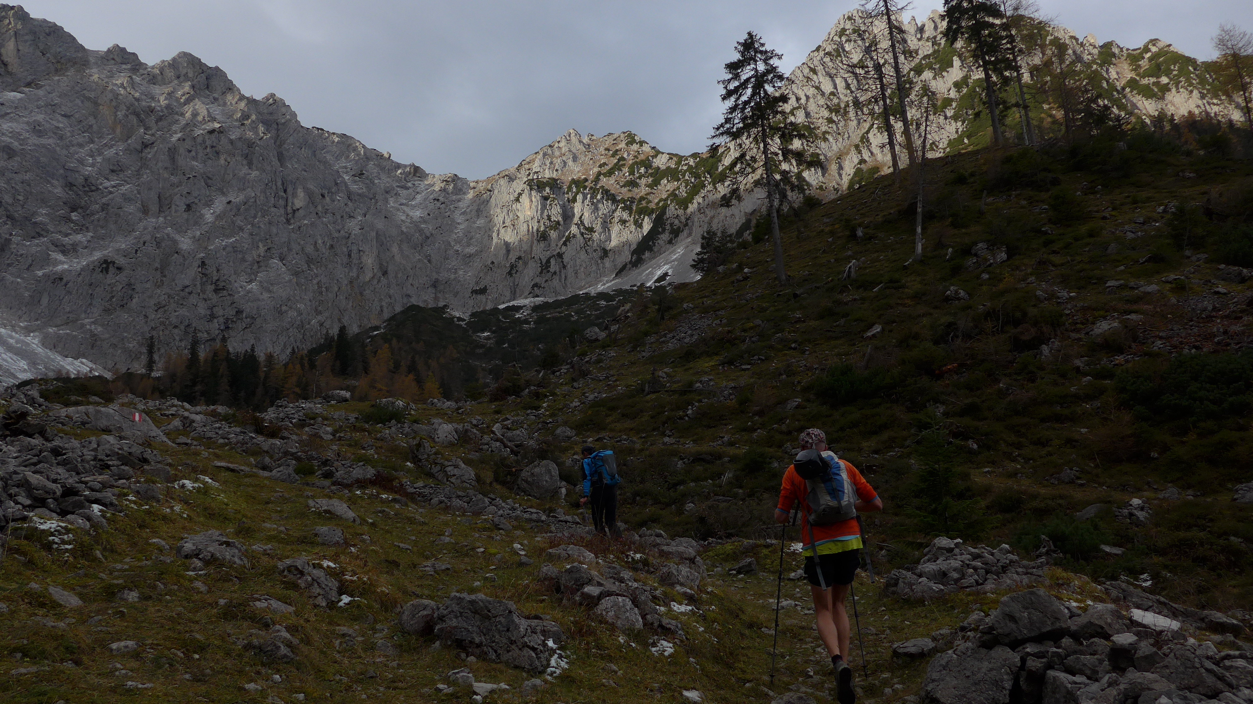 Ab Roßkaiser in den Sattel nach Ost absteigen, hier fast in Falllinie, kurz nach SW in der 1. Schuttreise absteigen - so kann man einem "Latschentrauma" entgehen. Oberhalb der Hochalm auf den Wanderweg zum Jöchl. Es gibt nahe des Felsriegels einen Steig nach Ost, den haben wir nicht gesehen, somit ein paar Hm mehr.