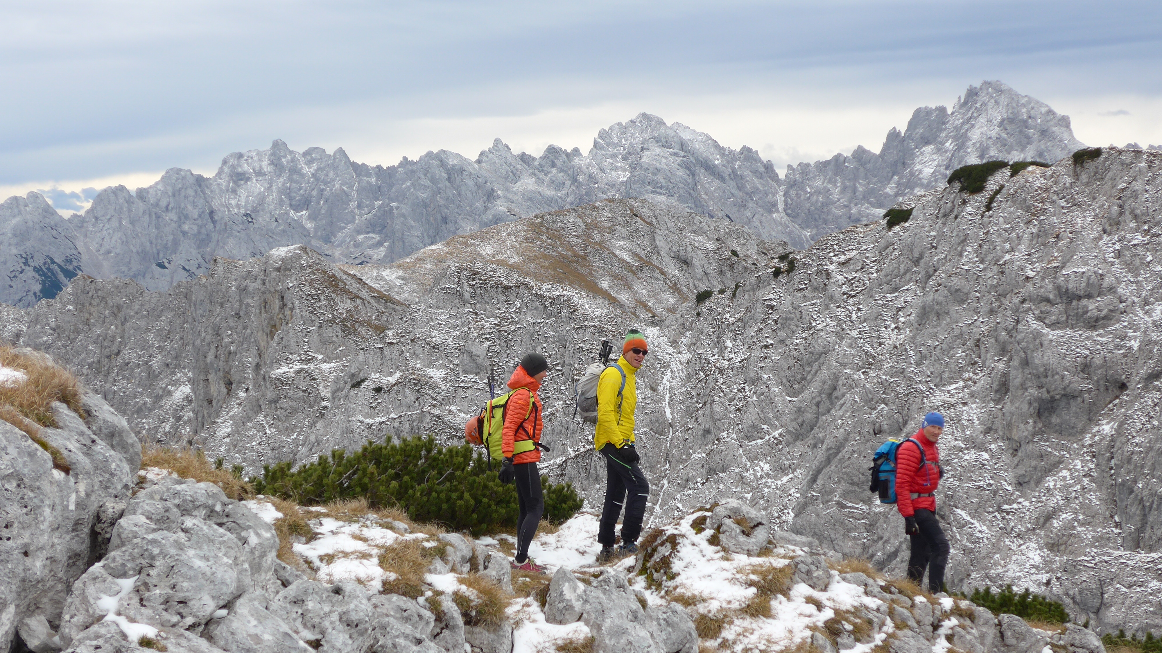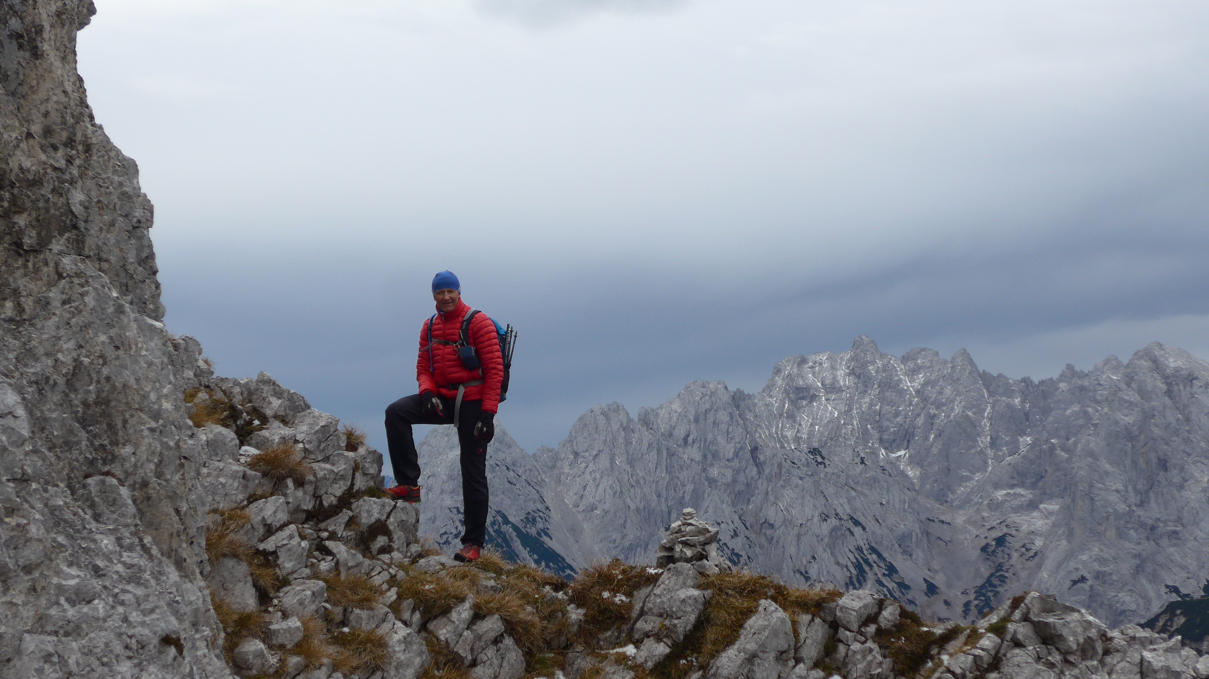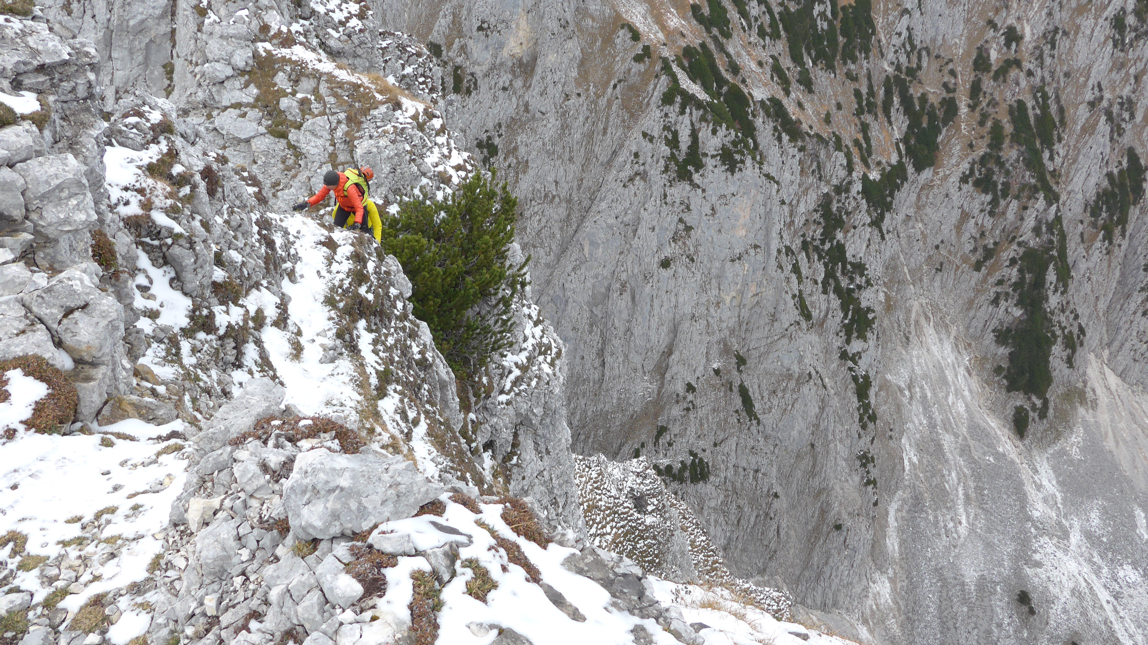 Leicht + markiert von der Pyramidenspitze zur Vorderen Kesselschneid. Ab hier wird´s alpin + brüchig + z.T. sehr ausgesetzt und die landschaftlich sehr lohnende Gratkletterei (Stellen II, meist I + Gehgelände) beginnt. Heute mit dem kräftigen Wind + den Schneeflecken etwas spannender. Wie im Buch beschrieben eher am Grat oder südlich davon entlang, trotzdem braucht´s Orientierungssinn - hin und wieder bestätigen einen die Steinmännchen.