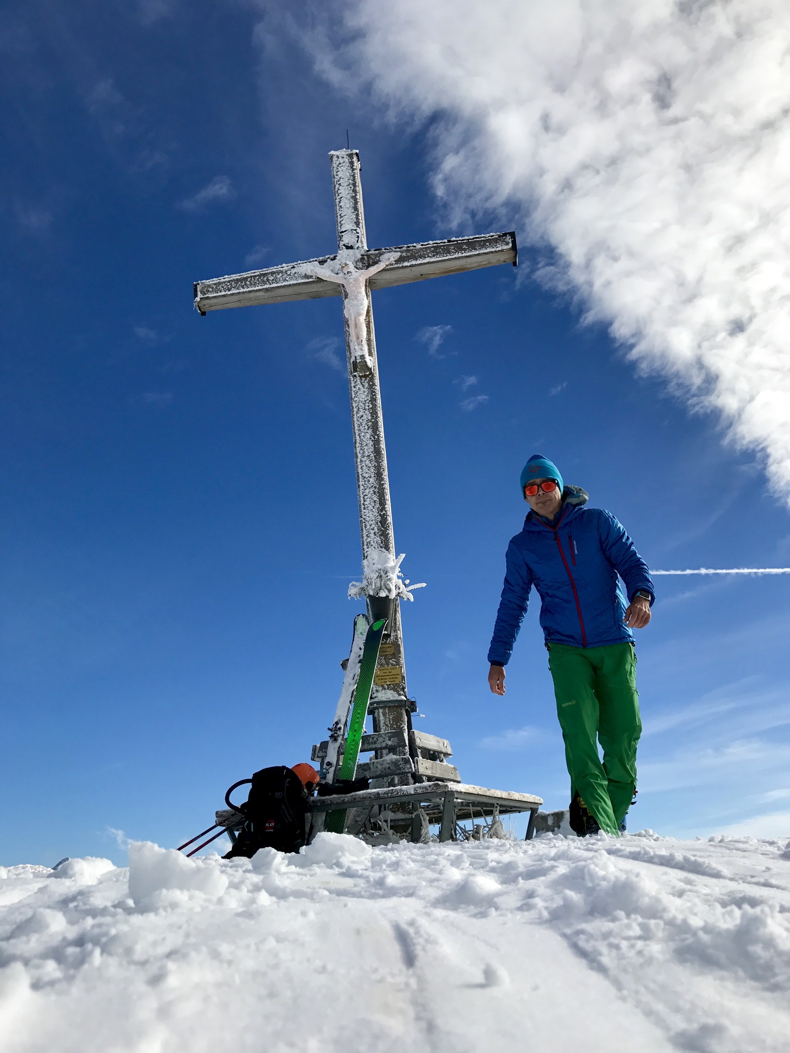Sonstiges: Vom PP am Stümpflinglift (1120m) bei blauem Himmel und Frühjahrstemperaturen über die Stümpfling-Abfahrt und den Ziager zur und von der Jagahütt’n rüber zum Roßkopf (1580m) hinauf. Bald nach mir stürmen 15 Schneeschuh-Senioren den Gipfel – Skitourengeher dagegen nur ganz wenige.