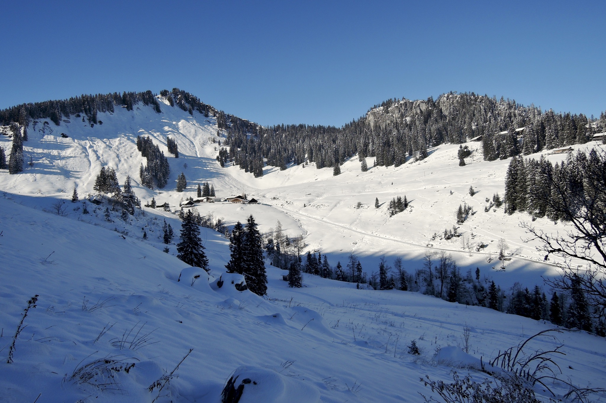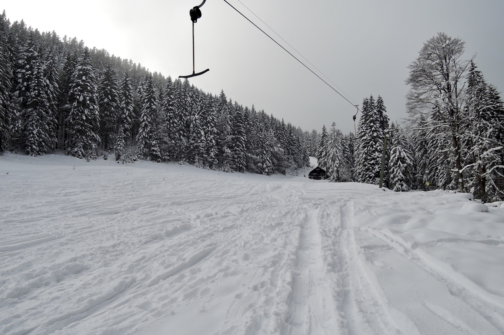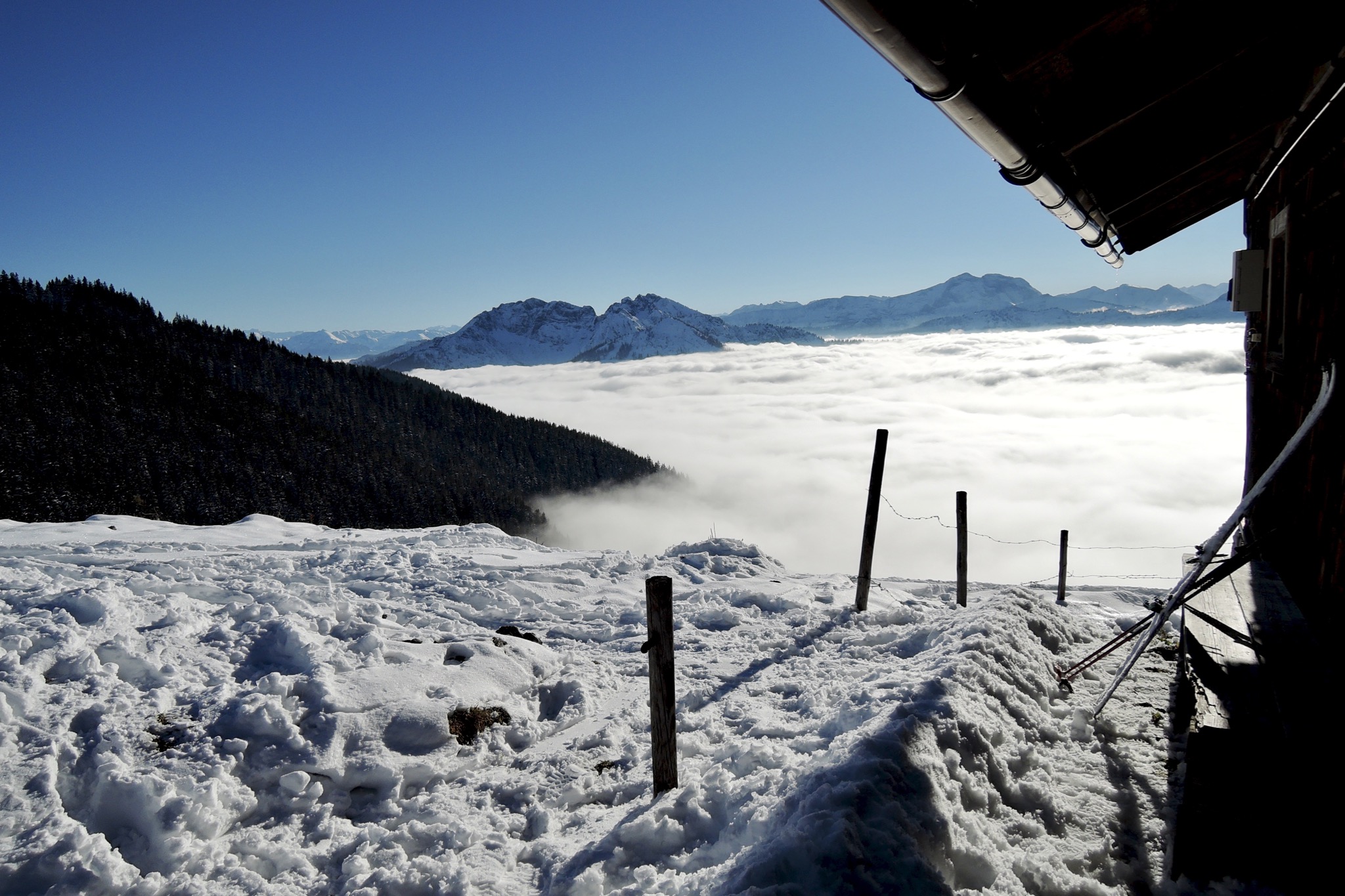 Sonstiges: Vom PP am Kurvenlift (1120m) bei Nebel unterm Kurvenlift hoch. Im Wald rechts zur Drei-Tannen-Abfahrt hinüber und Richtung W zum Nordhanglift – die ersten Sonnenstrahlen. Jetzt Richtung S hinauf und oben Richtung O zum Osthanglift. Am Roßkopf ist eine Menschentraube, das sieht nach inversem Christmas-Easter-Shift aus. Nach dem Abfellen lieber gleich Richtung W die Sutten-Abfahrt hinunter. Im Nebel muss man auf die von den Schneekanonen aufgehäuften Dünen aufpassen. An der Unteren Suttenalm (1190m) ist es endgültig zu neblig, anfellen. Auf dem Wanderweg Richtung Stümpfling. Jetzt ist oben weniger los, von der Jagahütt’n über die Stümpflingalm (1523m) zum Roßkopf (1580m) hinauf. Ein MTBer-Päarchen kommt auch noch hoch, er eher konventionell, sie mit stylischem Fat-Bike…
