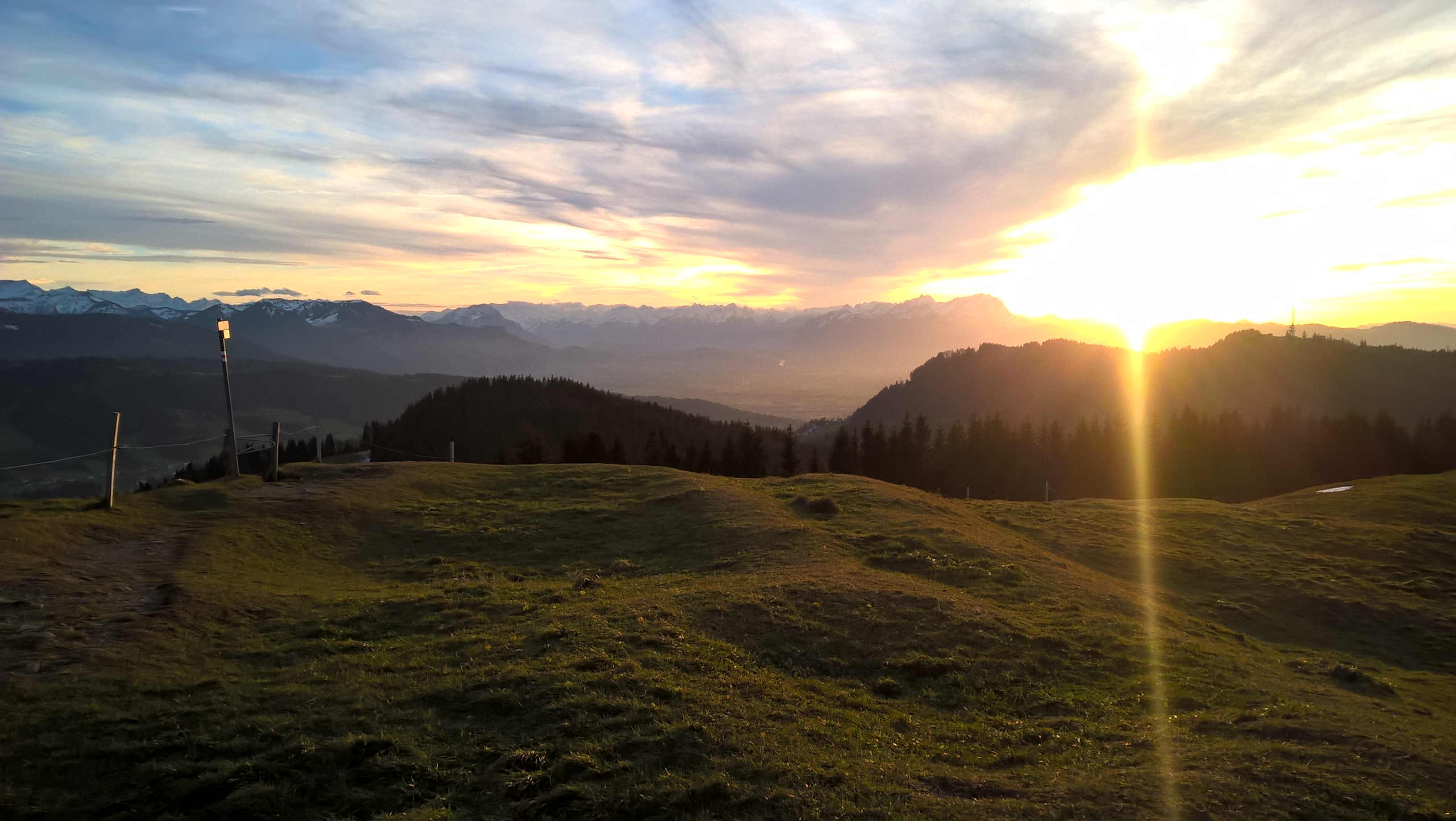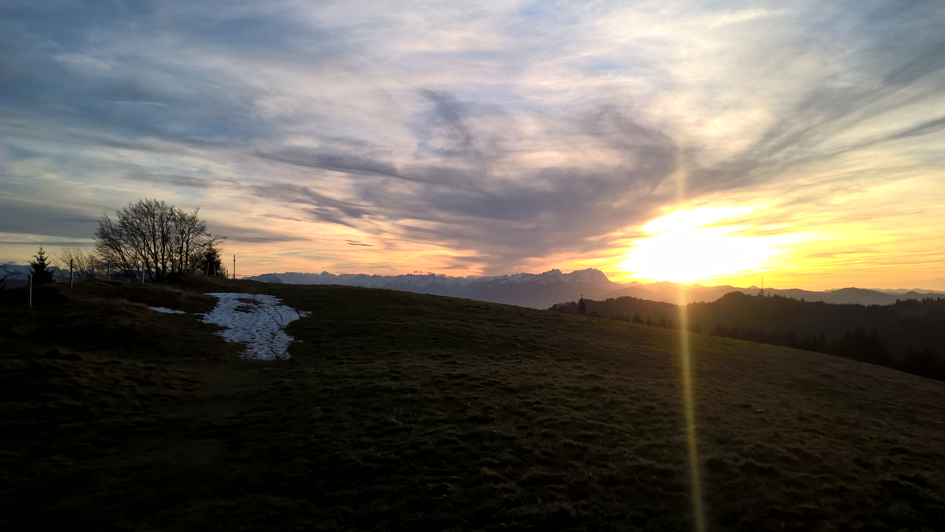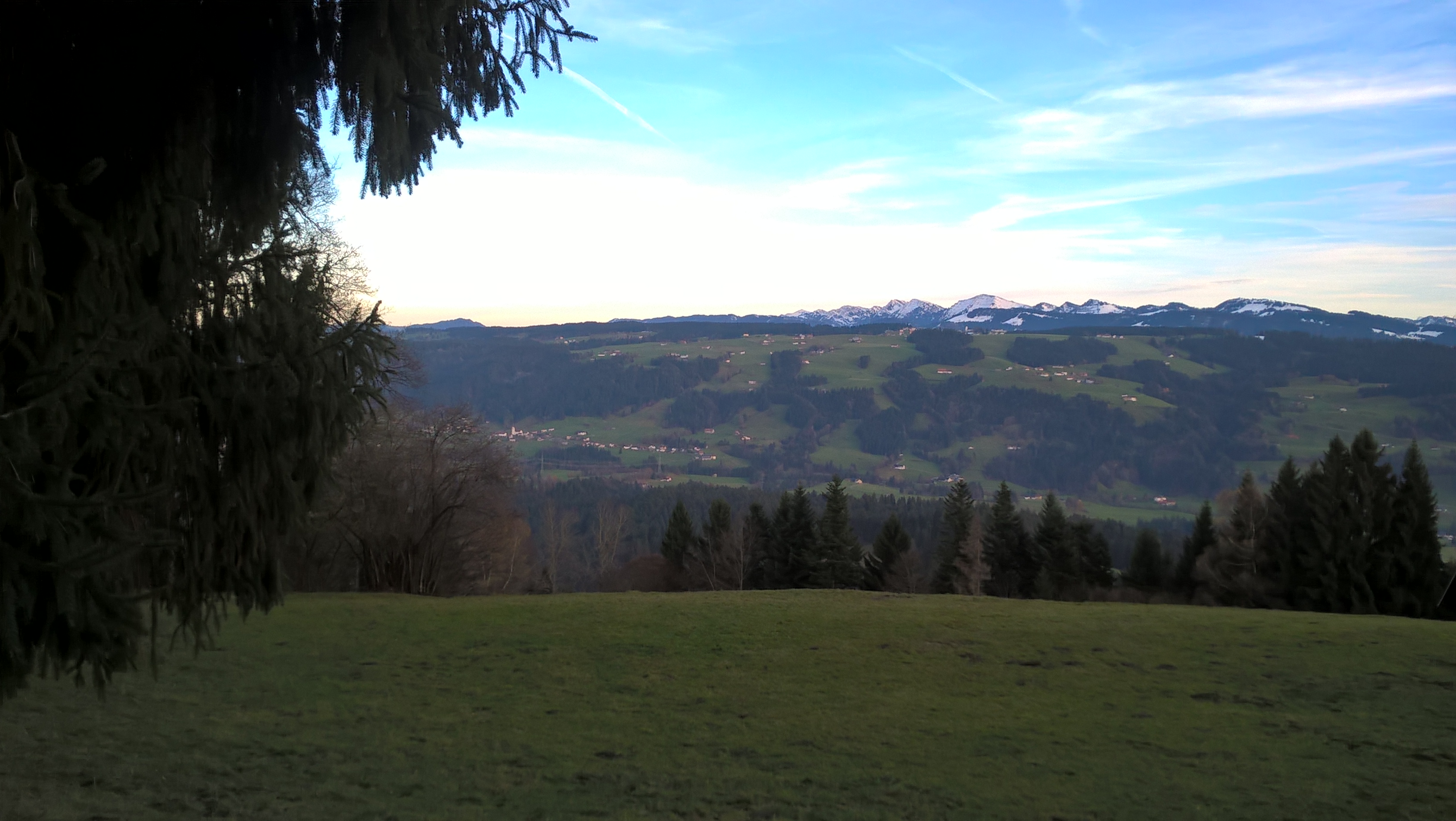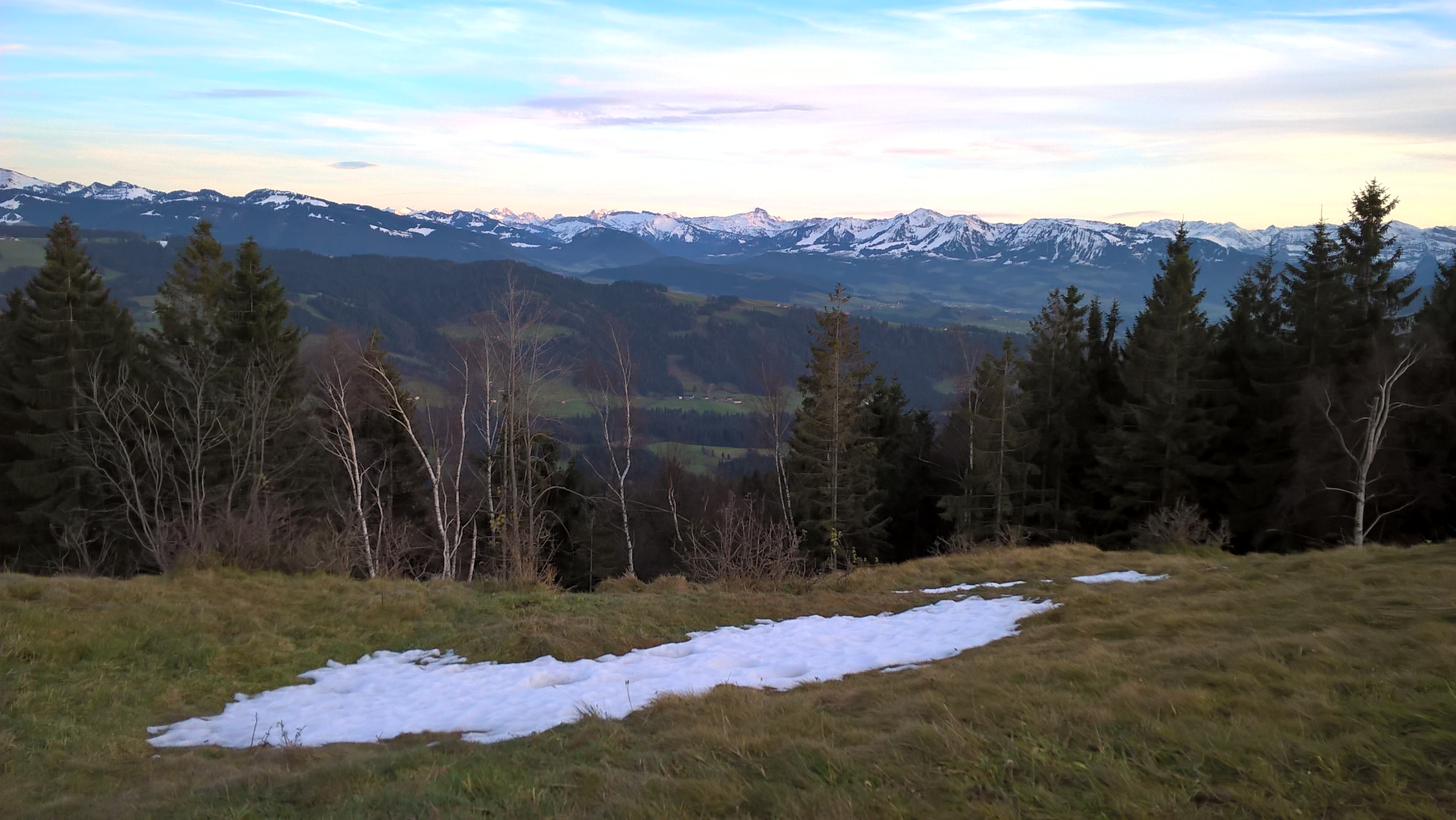 Tourenverhältnisse: Bei dem Fönsturm gestern und hohen Plusgraden haben wir den kleinen Ausflug auf den Hirschberg Nähe Scheidegg unternommen. Mit dem Auto kann man bis Hirschbergsau rauffahren. Von dort ist man in einer knappen Stunde am enorm aussichtsreichen Gipfel. Dieser Berg steht quasi als Aussichtsterrasse vor dem weiten Alpenpanorama der Allgäuer, Bregenzerwaldberge und dem schweizer Alpstein mit Säntis. Und wenn man sich Richtung Norden wendet kommt der Bodensee mit dem Pfänder im Vordergrund in den Blick.
