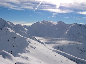 Tourenverhältnisse: unterhalb ca. 2.300-2.400 m im freien Gelände sehr wenig Schnee, die beschneiten Pisten haben aber eine gute Schneeauflage; oberhalb im freien Gelände sehr wechselhaft (abgeblasen / wenig Schnee, aber auch eingewehte Mulden)