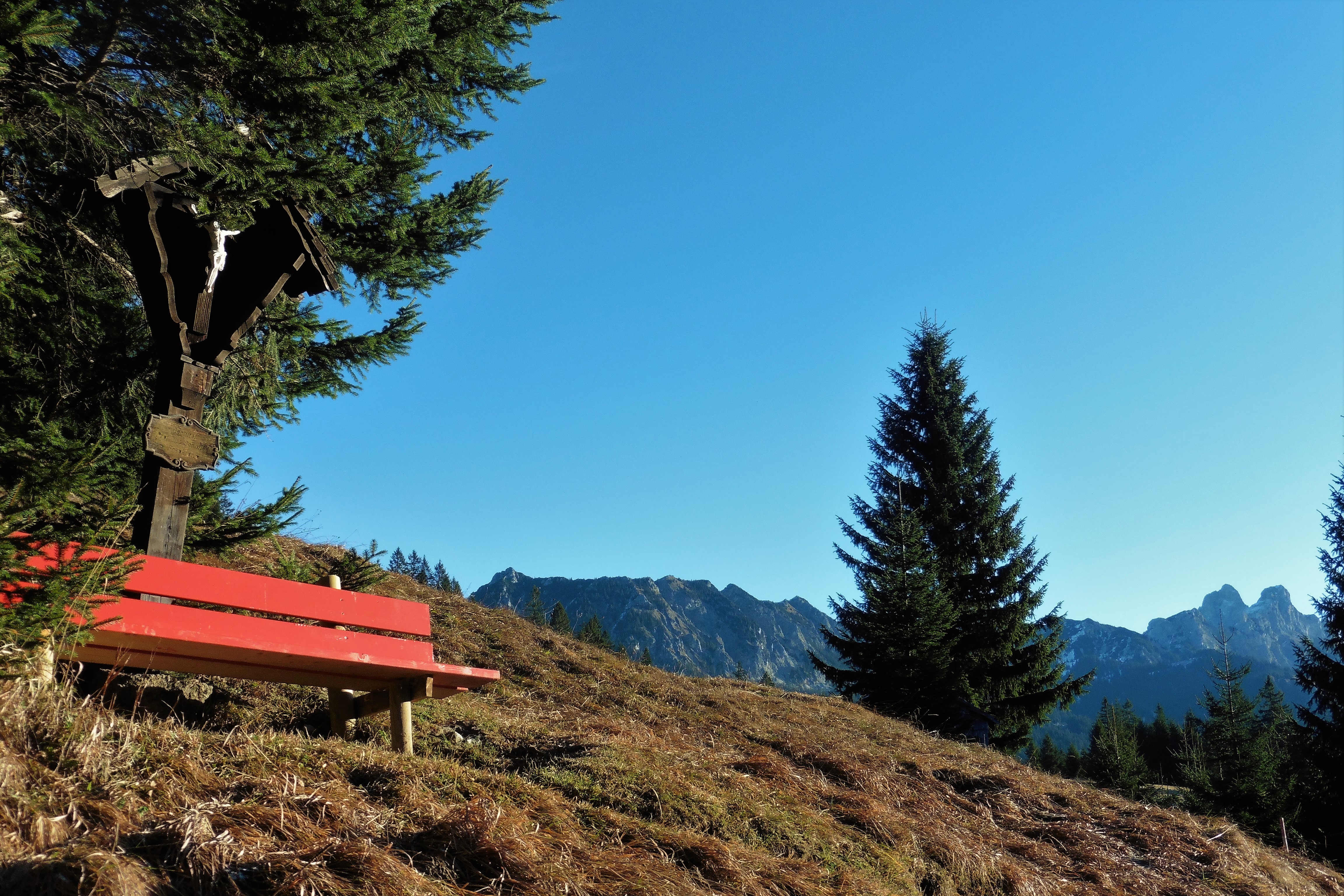 zu Bild 2: ein Kreuz am Wegesrand; ganz rechts - Gimpel und Rote Flüh;