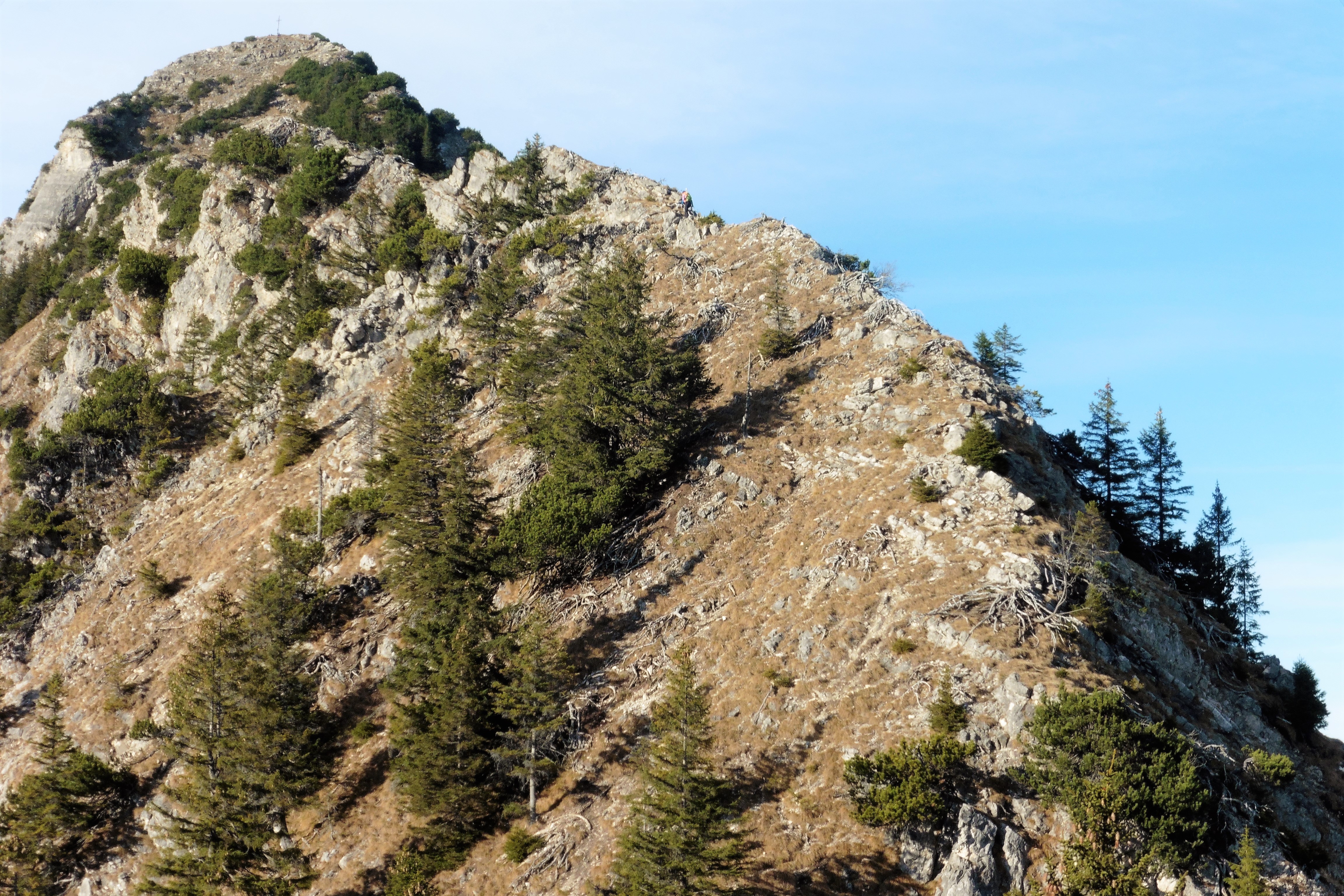 Gefahreneinschätzung: Trittsicherheit, Schwindelfreiheit und Orientierungsvermögen sind notwendig; der gesamte Aufstieg erfolgt weglos, nur im oberen Teil sind einige verwachsene Pfadspuren vorhanden; am Grat einige Stellen im Schwierigkeitsgrad I ;