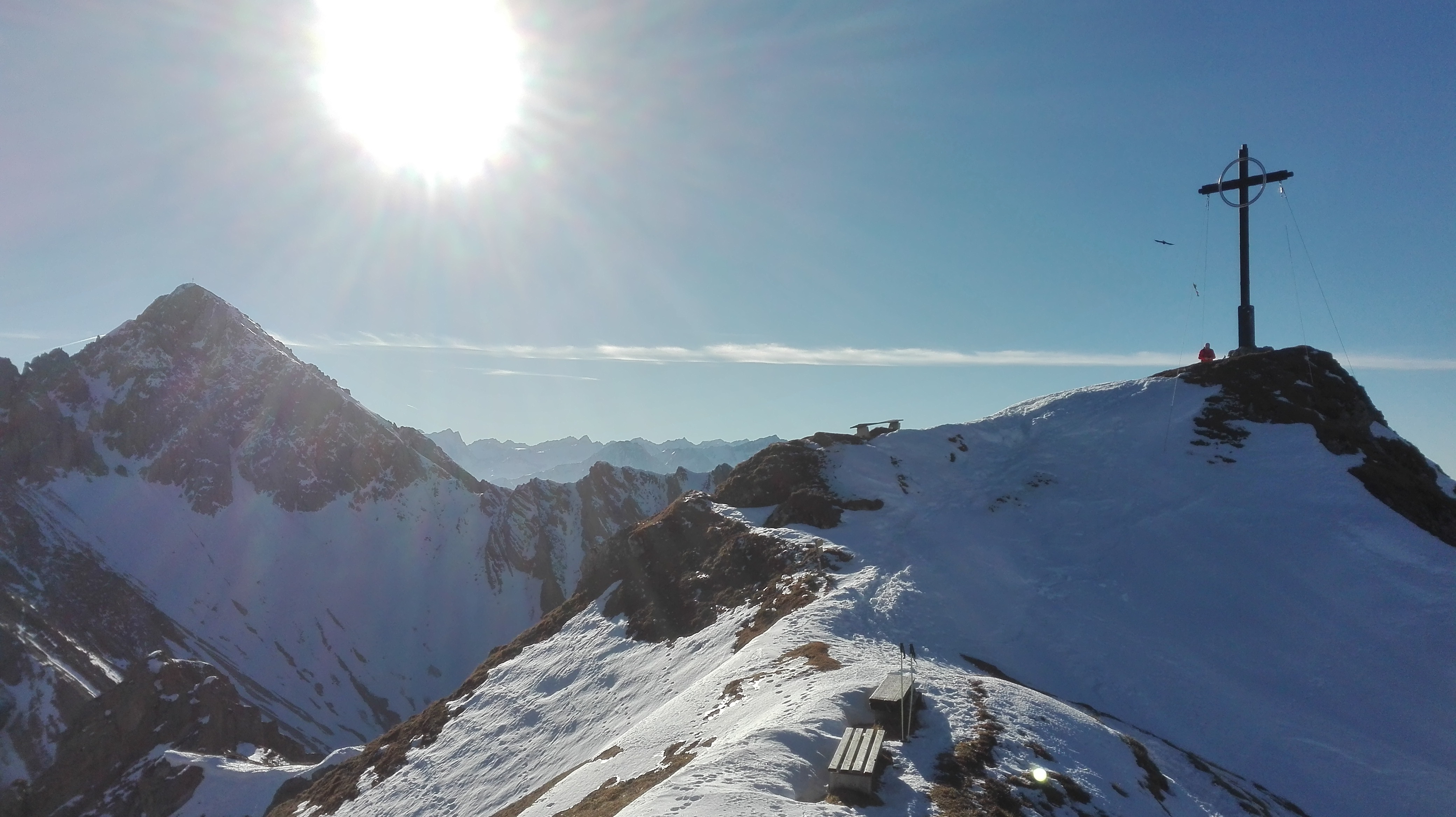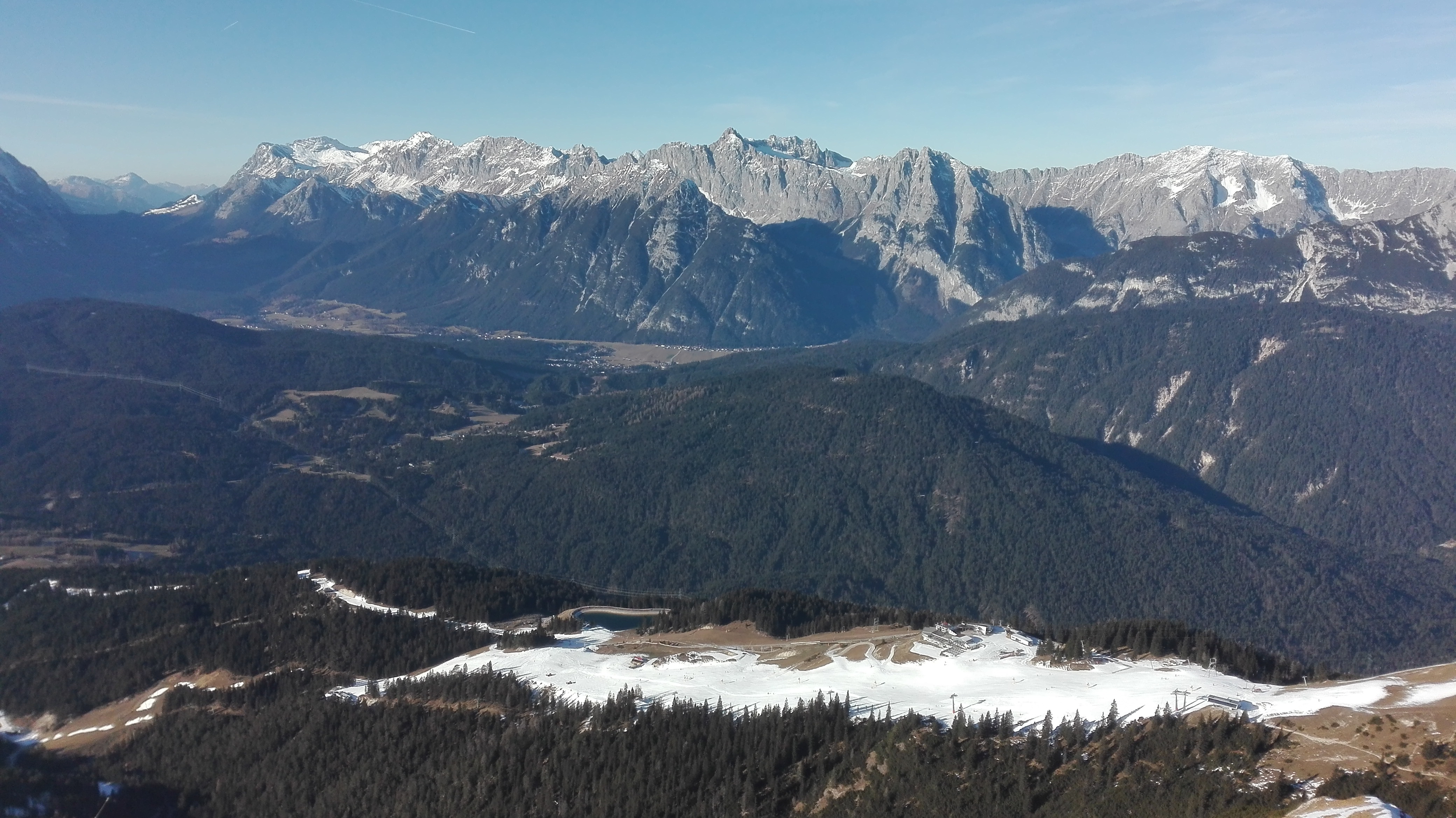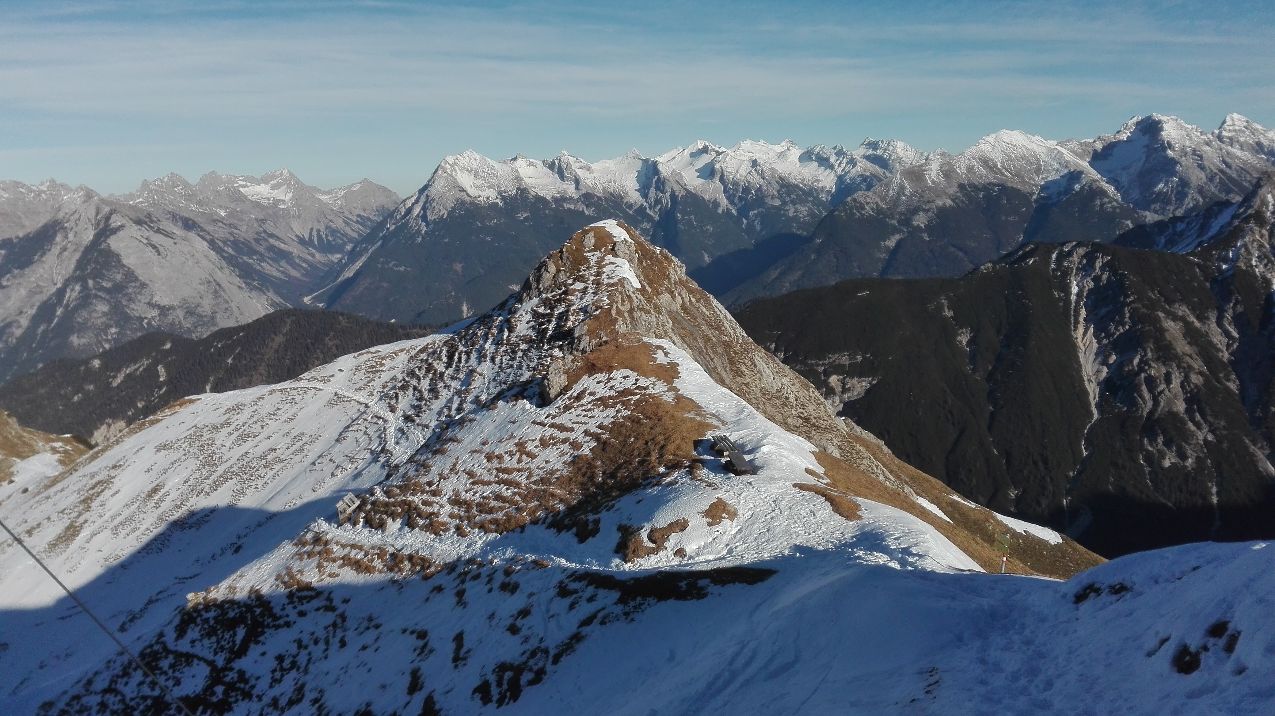 Sonstiges: Die Piste ist bis zur Rosshütte beschneit, die Schneekanonen liefen am Vormittag, mehrere Pistenraupen präparierten, über den Tag verteilt waren bestimmt 200 Leute unterwegs. Oberhalb der Rosshütte reicht der Schnee bis auf eine apere Stelle bis zum Seefelder Joch und mit ein paar Unterbrechungen auch bis zum Gipfel. Man könnte also bis zum Schluss mit Ski gehen, der Schnee am Grat ist aber meist hart bis sehr hart.