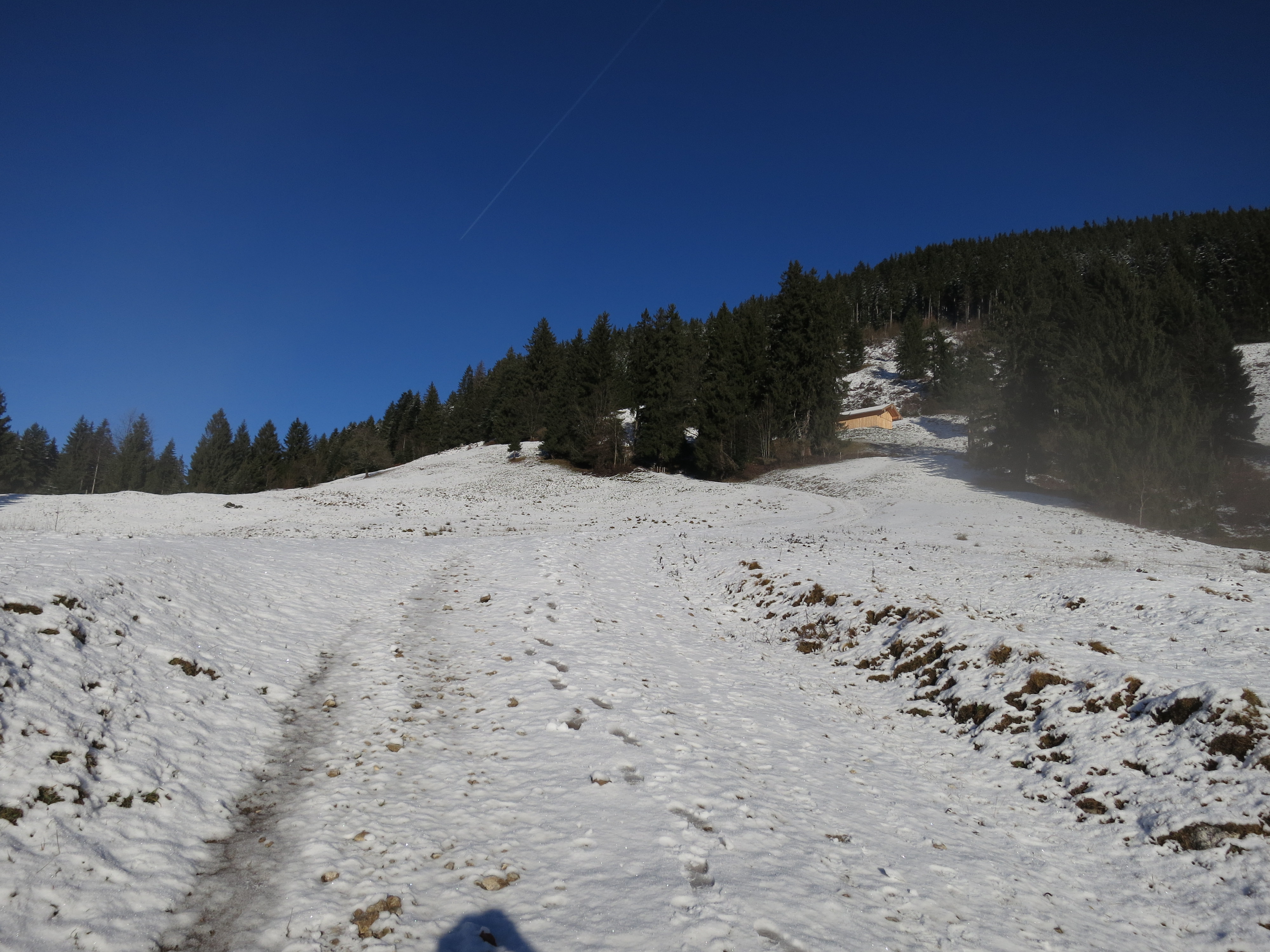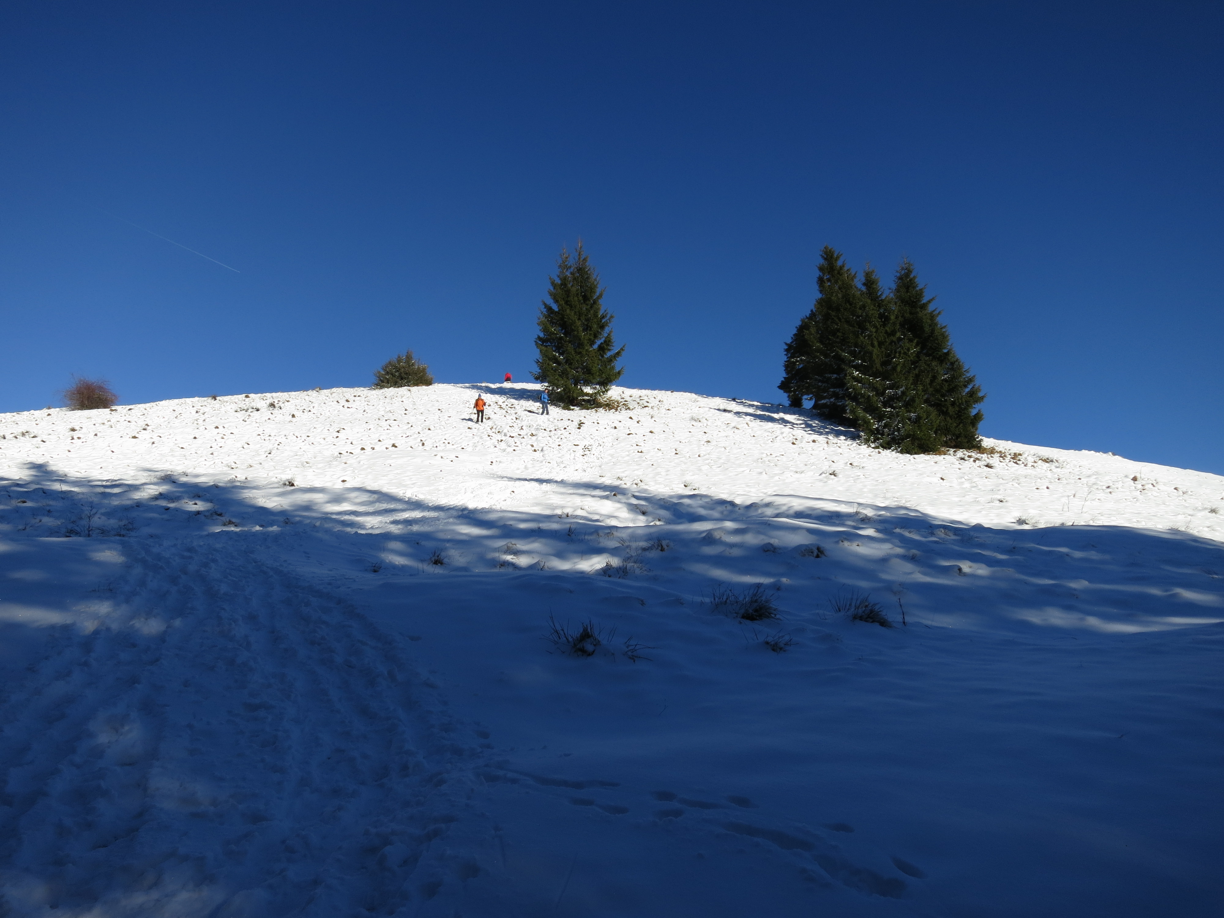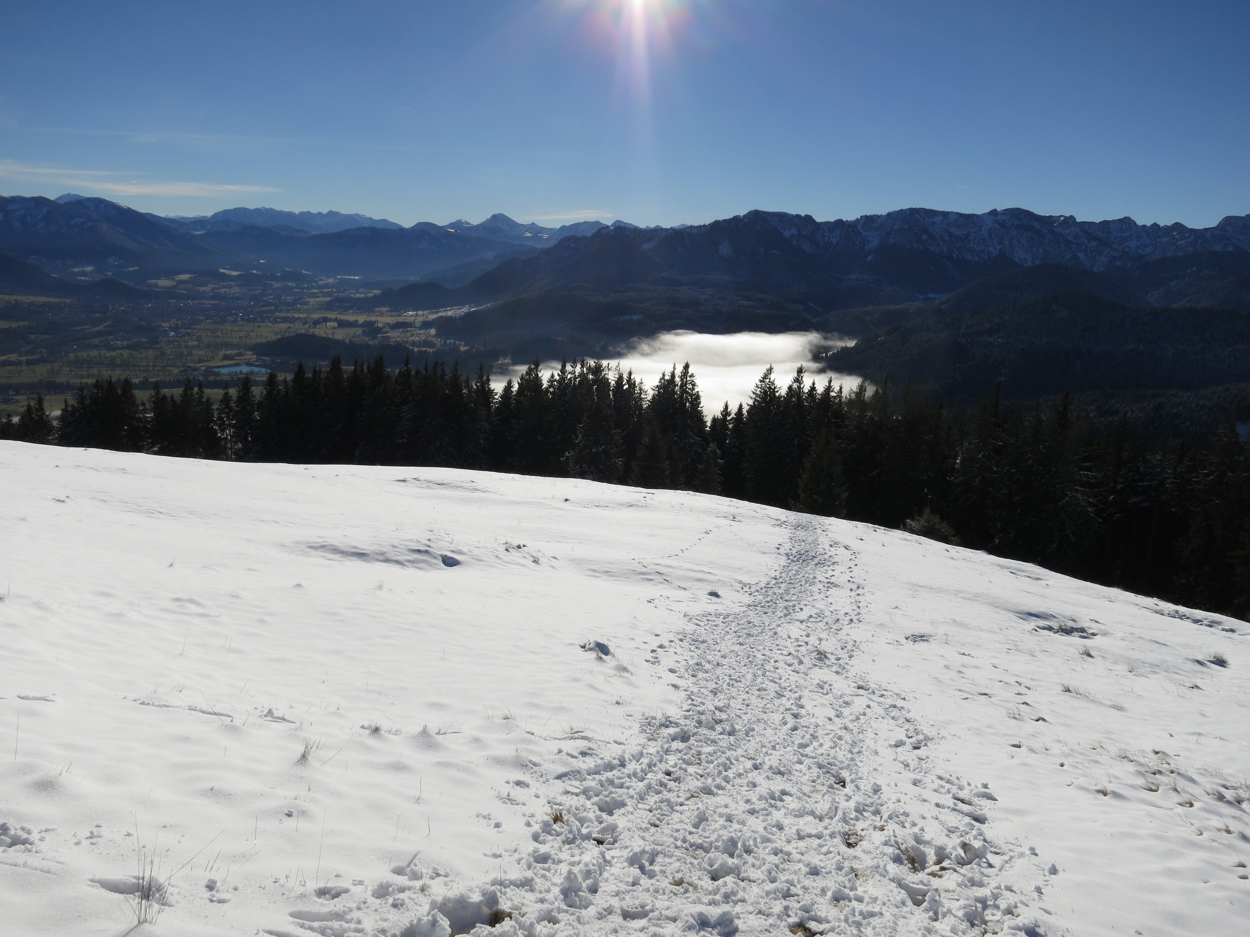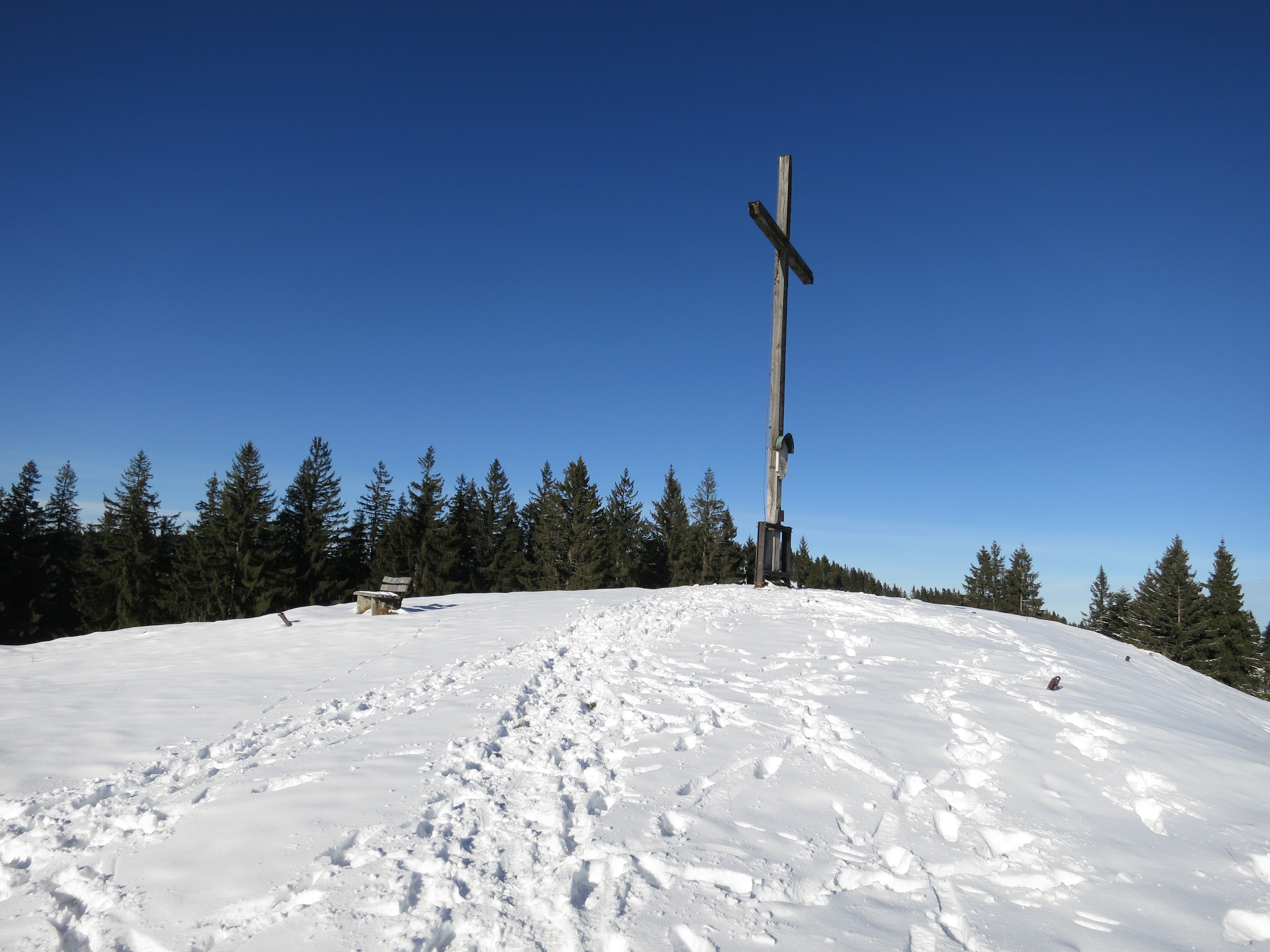 Tourenverhältnisse: Wege teils aper und trocken, teils auch überzuckert, ganz selten leicht eisig. Die Gipfelkuppe hatte ca. 5 cm Neuschnee. Insgesamt alles gut zu gehen.