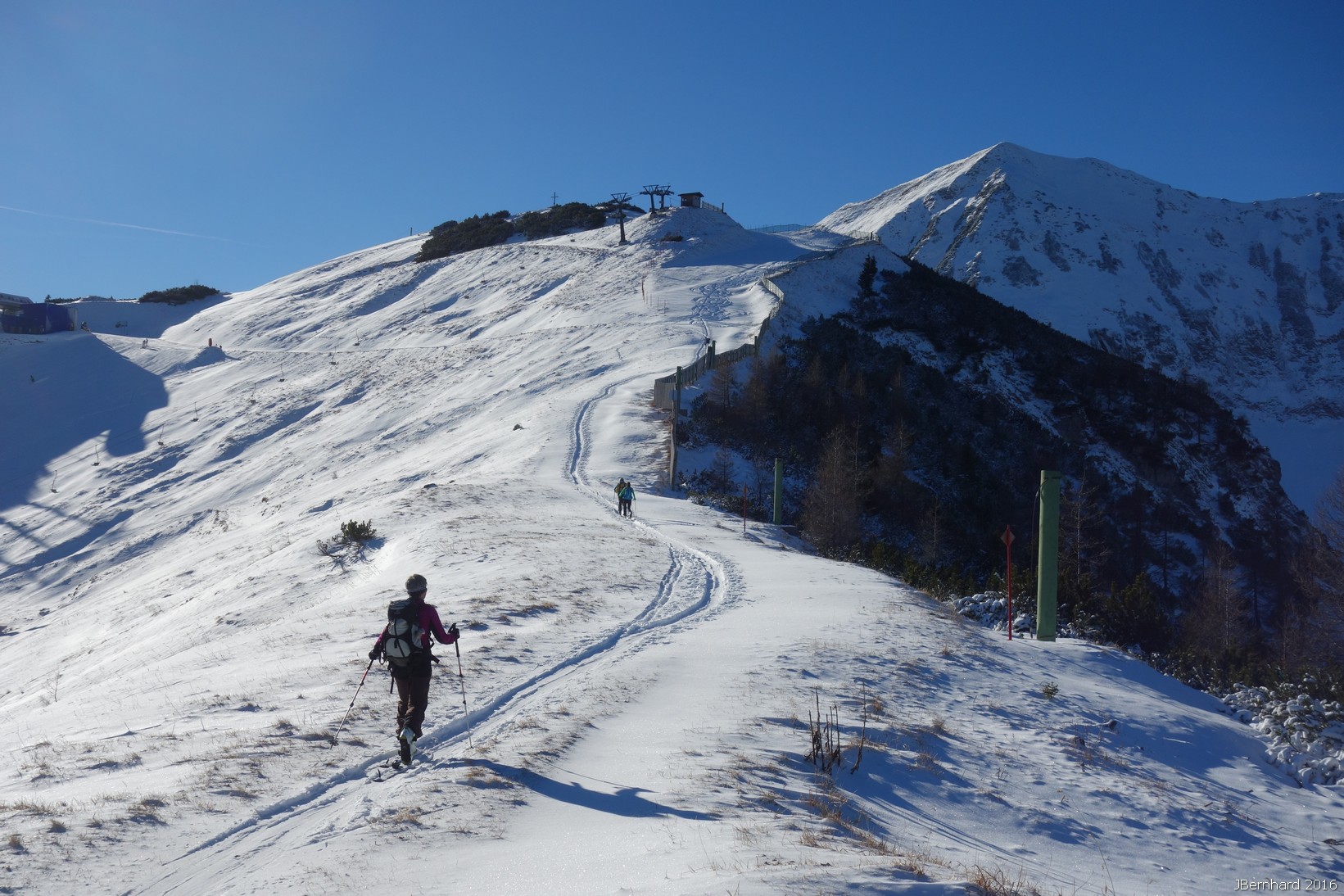 ruhiger Aufstieg am Nordrand des Pistengebiets mit dünner Schneeauflage.