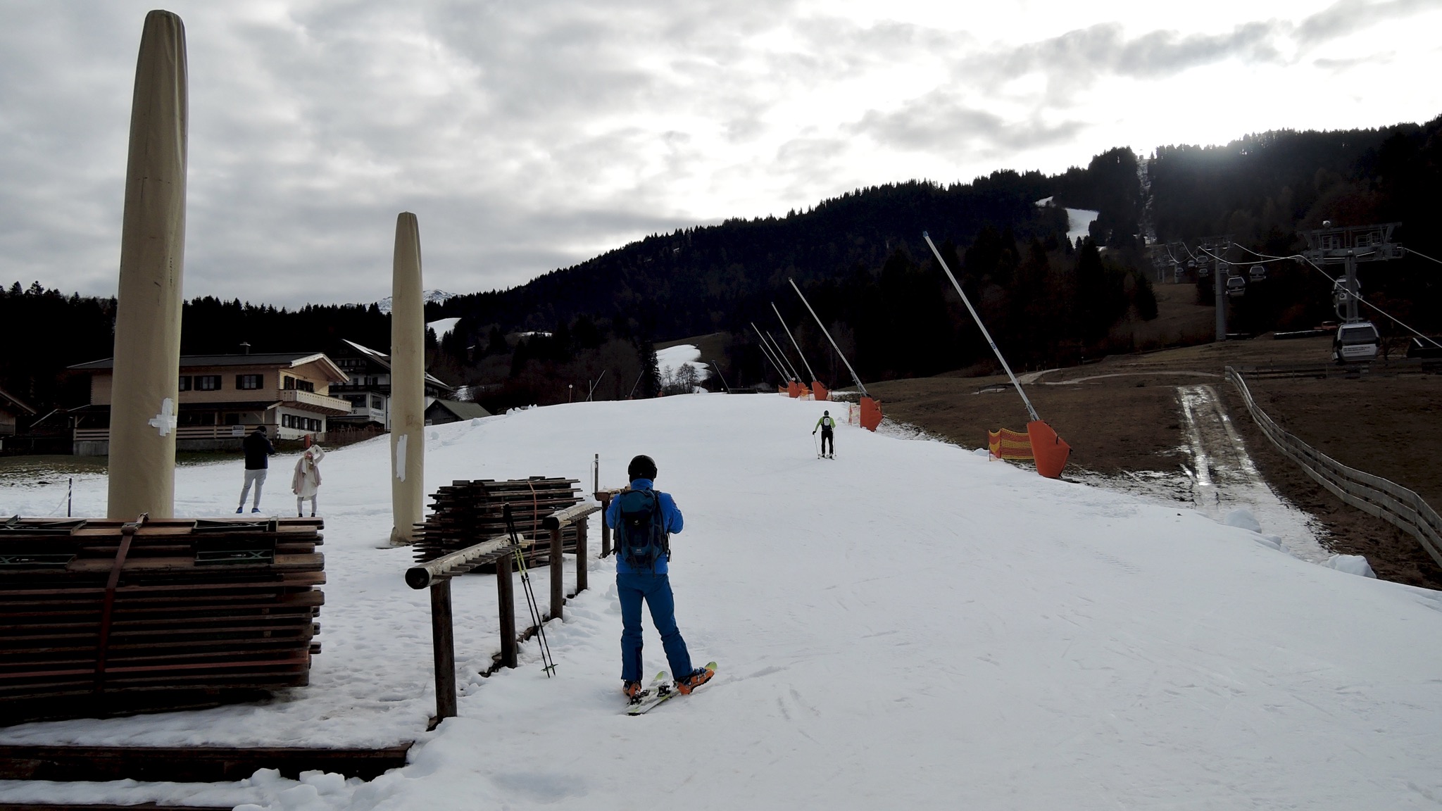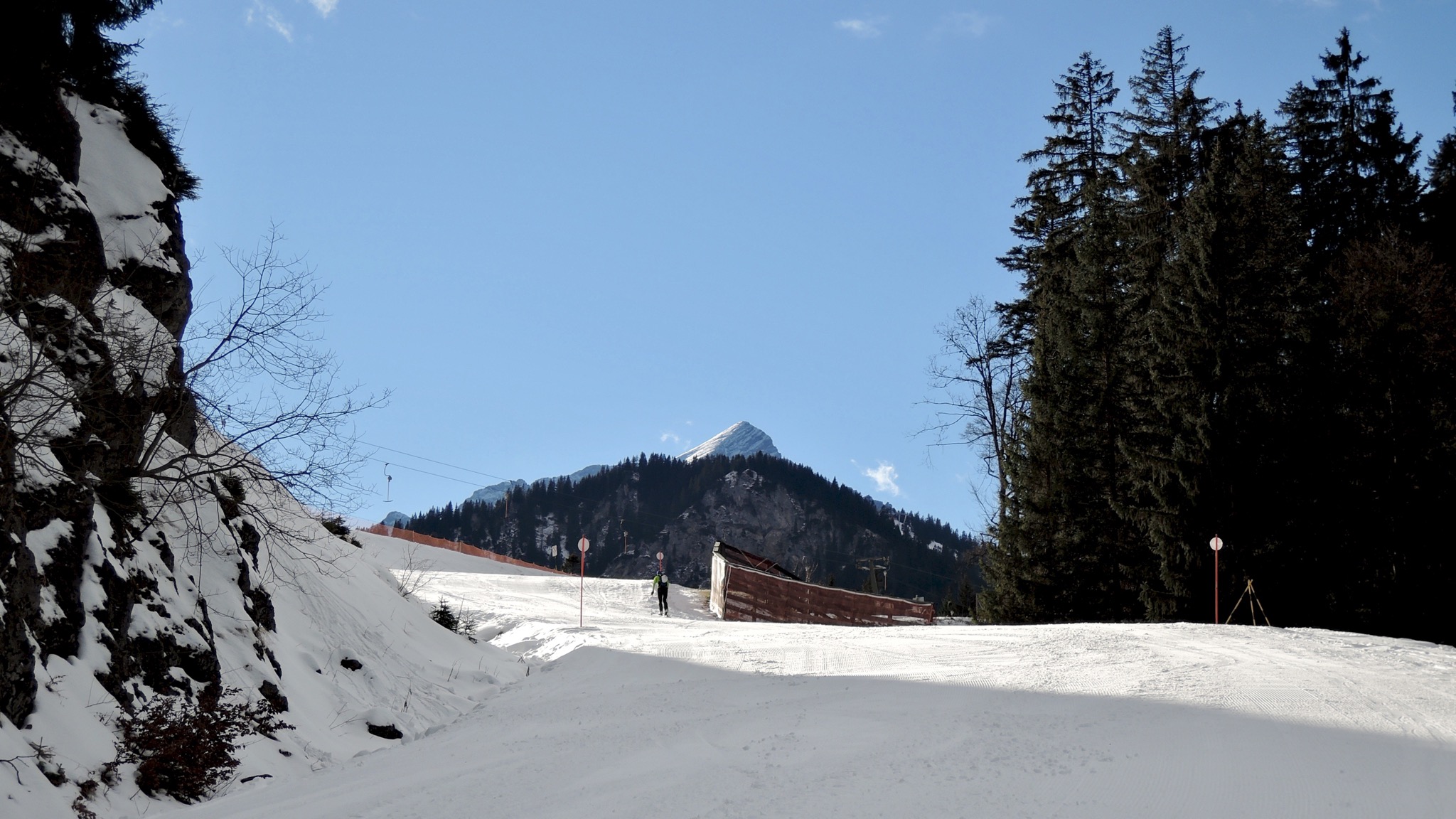 Tourenverhältnisse: Kein Schnee außer Kunstschnee. Pisten perfekt präpariert, im Gelände kein Schnee bzw. oberhalb des Hausbergs wenige cm Schnee.