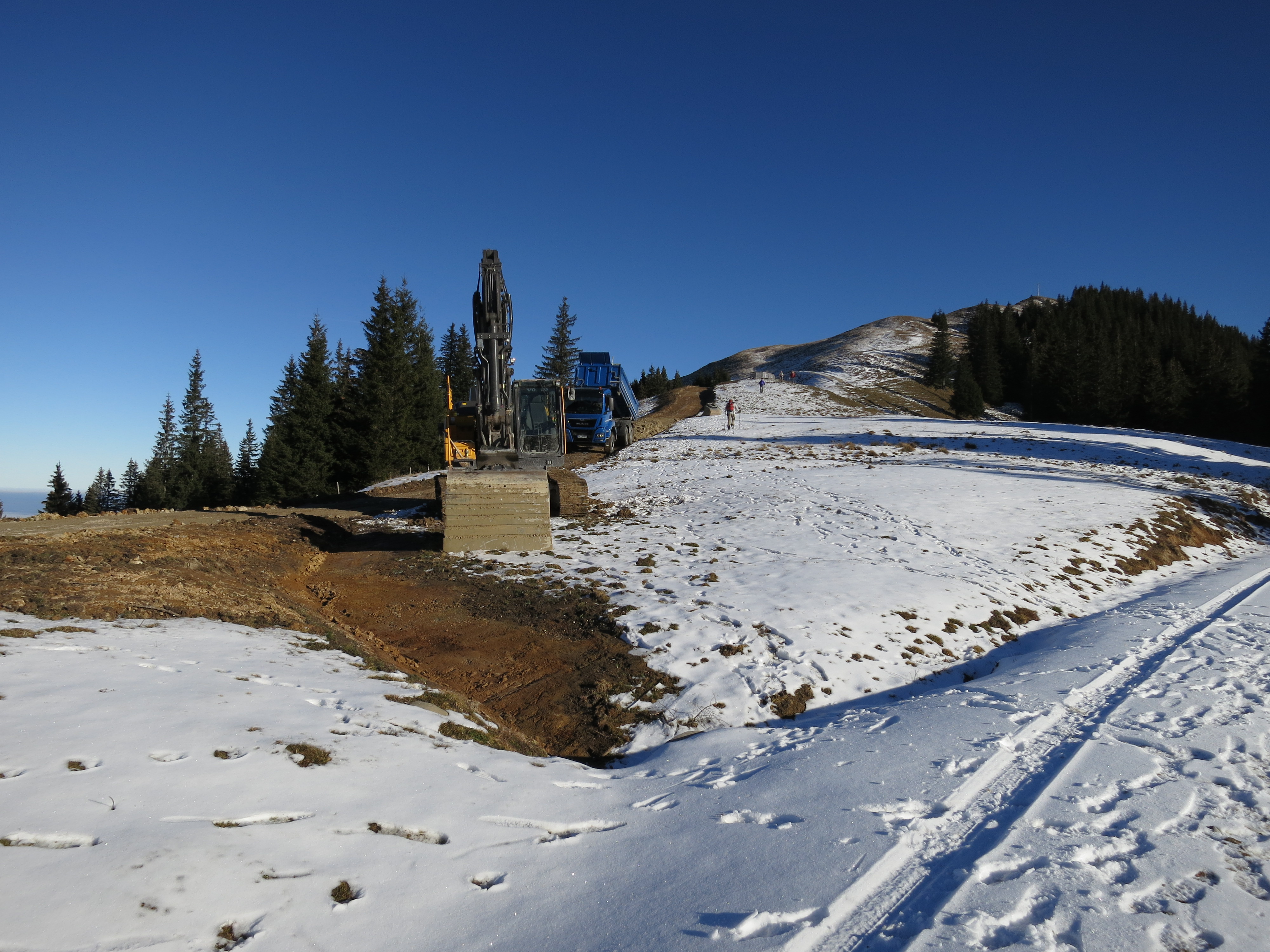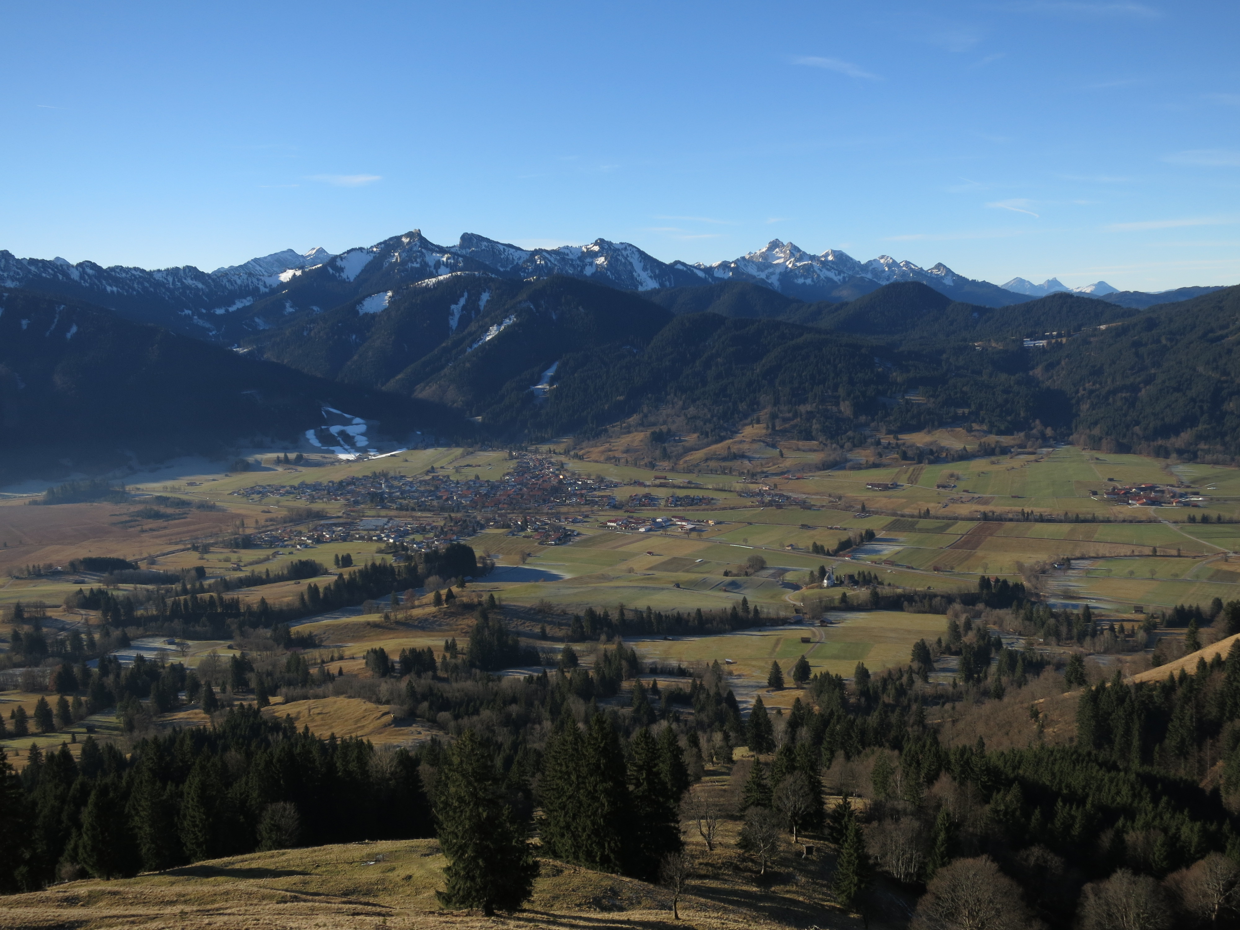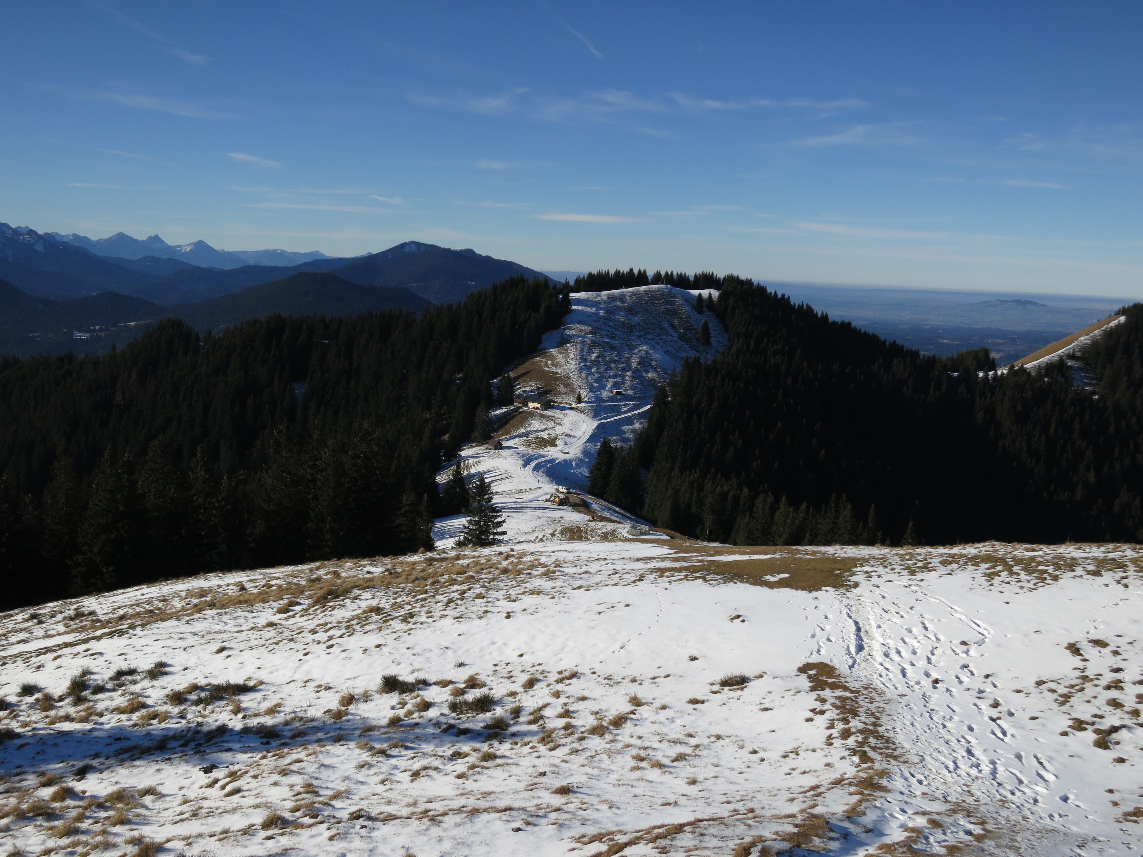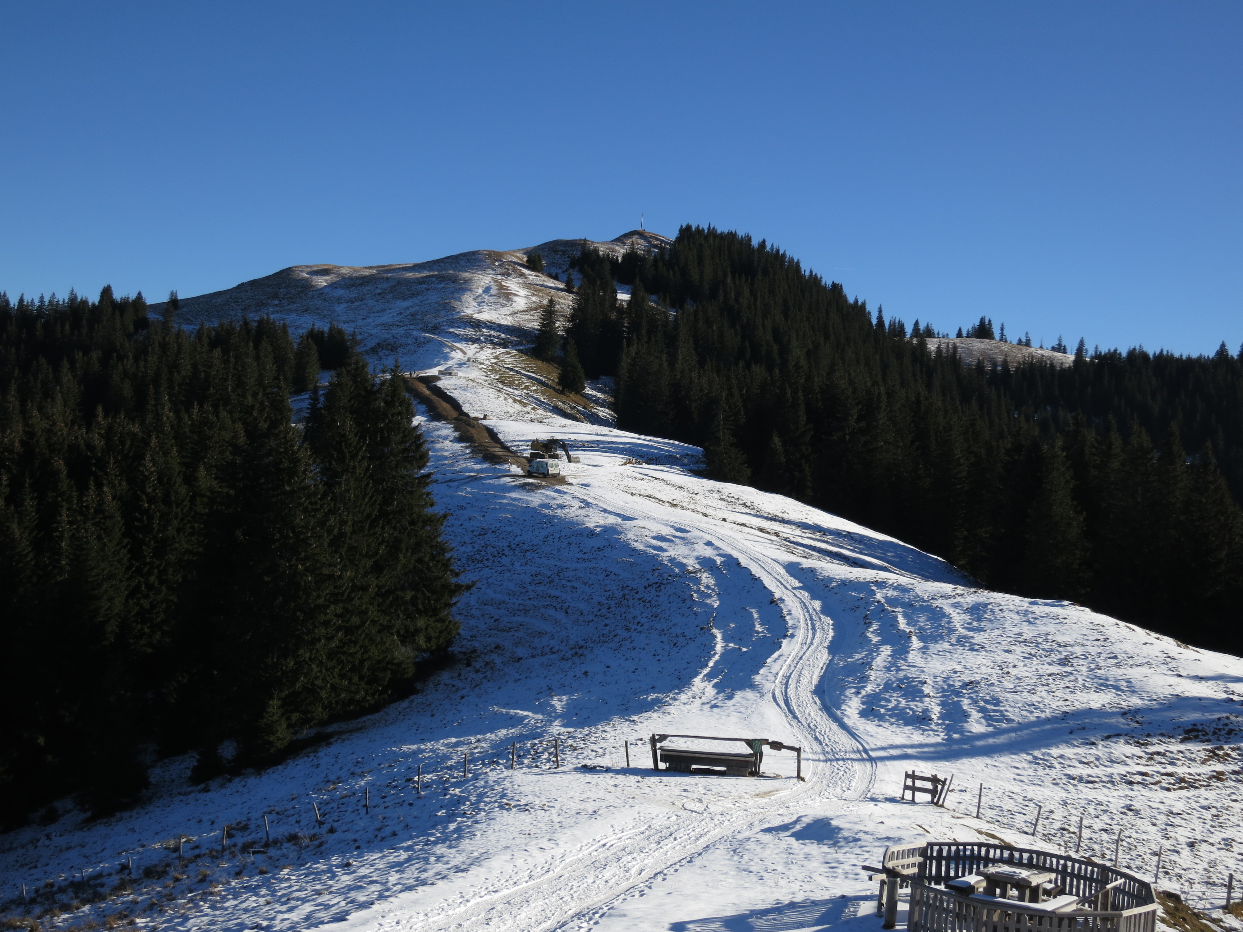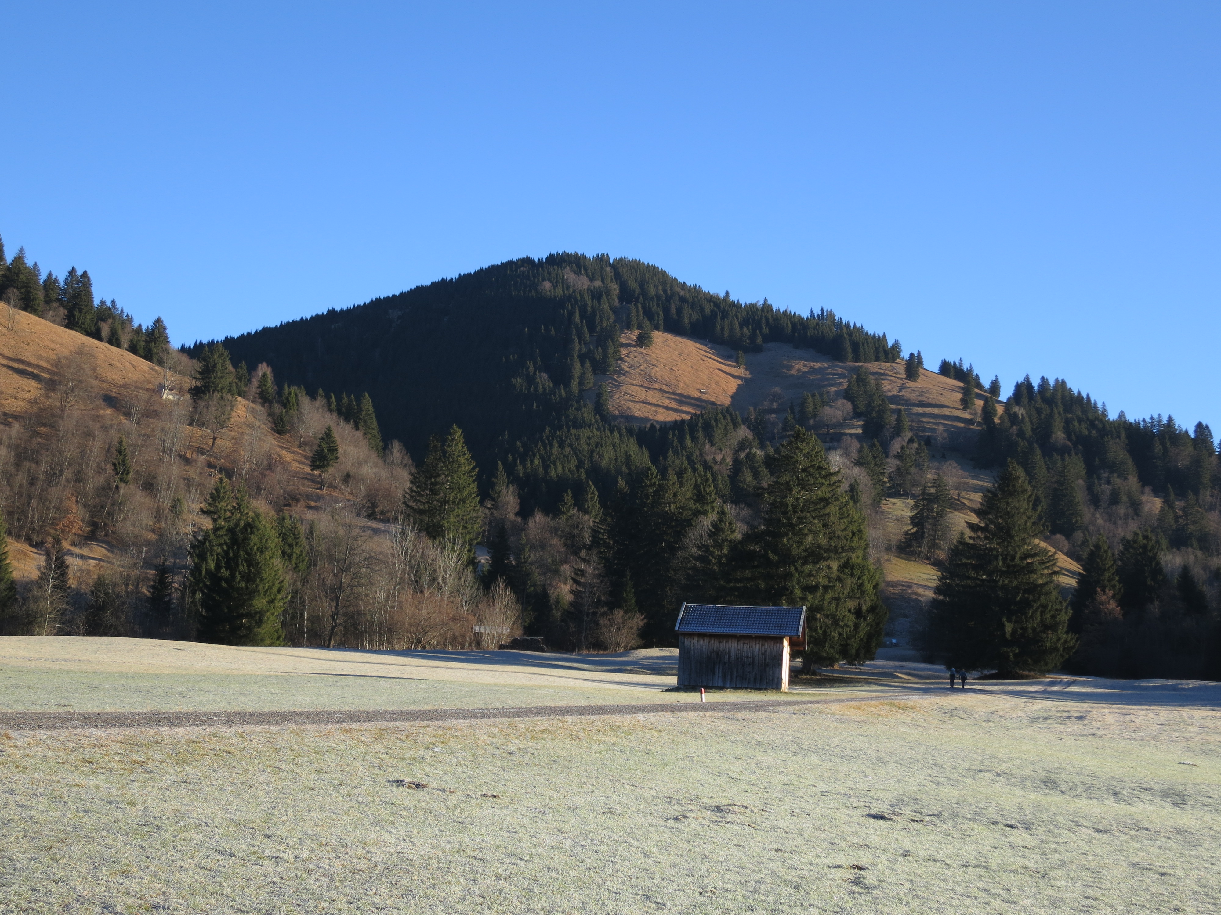 Tourenverhältnisse: Aufstieg und Abstieg in etwa der Skiroute folgend. Die unteren Hänge waren total aper (Bild 1). Im weiteren Verlauf dann schattseitig etwas Schnee am Weg. Ab Hörnle-Alm dann wenige cm Schnee mit vielen aperen Stellen (Bild 3). Die batzige "Straßenbaustelle" kann über die Wiese umgangen werden. Im Abstieg gab's generell etwas mehr batzige Abschnitte auf Grund der Erwärmung. Insgesamt aber eine perfekte Winterwanderung.