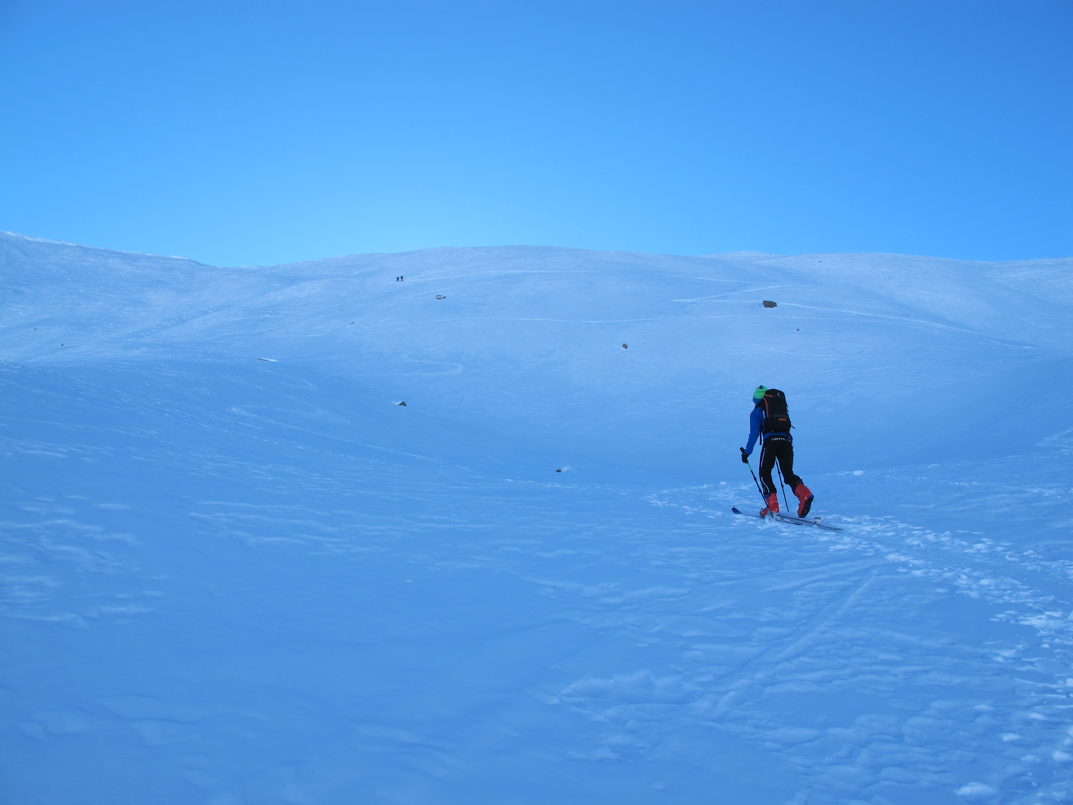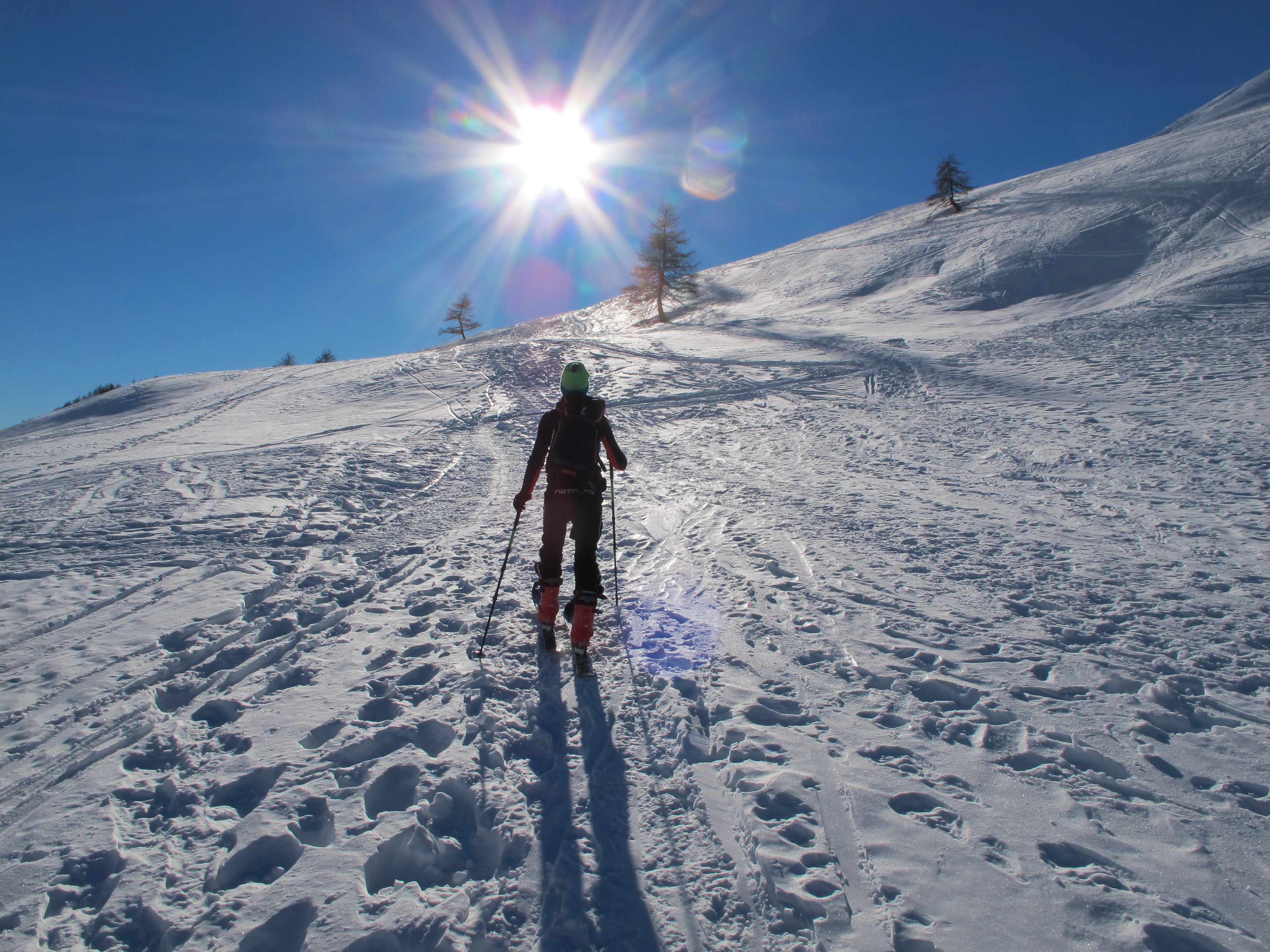 Schnee: teilweise windgeprägte Schneedecke, aber fast immer gut zu fahren. Ein Wechsel zwischen Platten, Pulver und verspurtem Pulver. Zumindest nordseitig ist das so. Bestes Wetter hier in einer mir bislang ziemlich fremden Bergwelt.