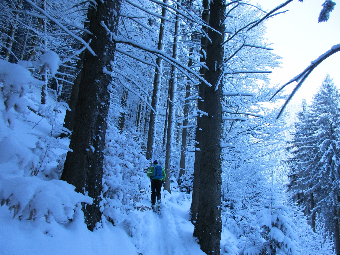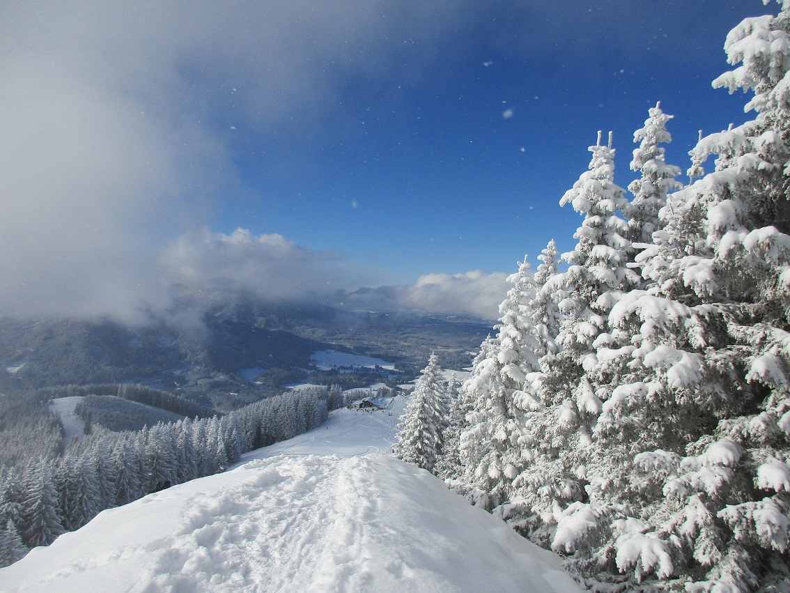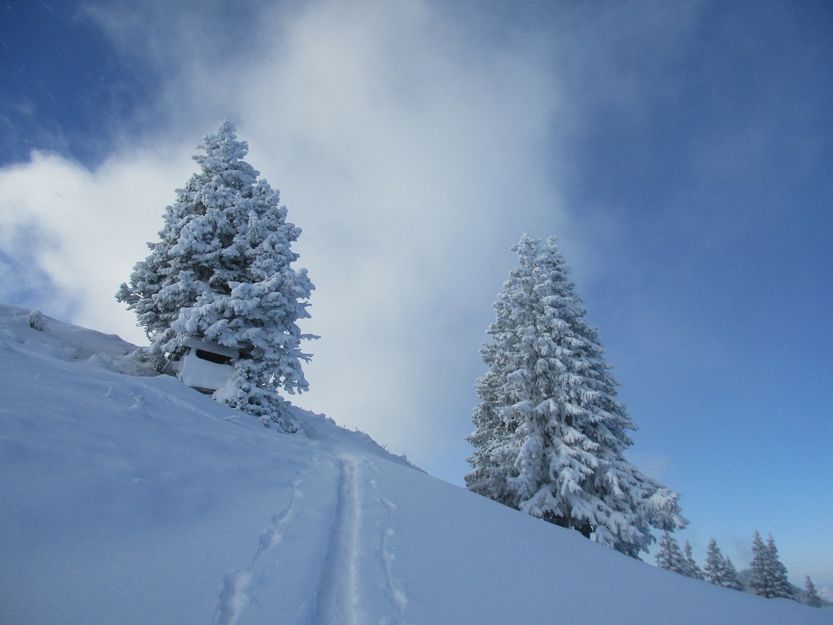 Tourenverhältnisse: Aufstieg sehr schön in winterlicher Stimmung / Neuschnee ohne Unterlage / KALT / Abfahrt in freiem Gelände wäre sehr mutig / auf den obersten Pistenabschnitten teilweise kleine Steine