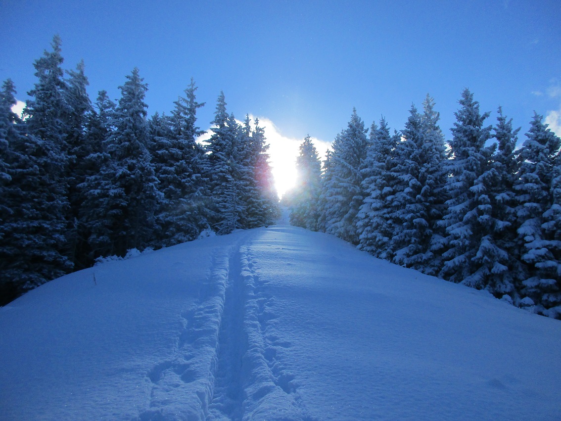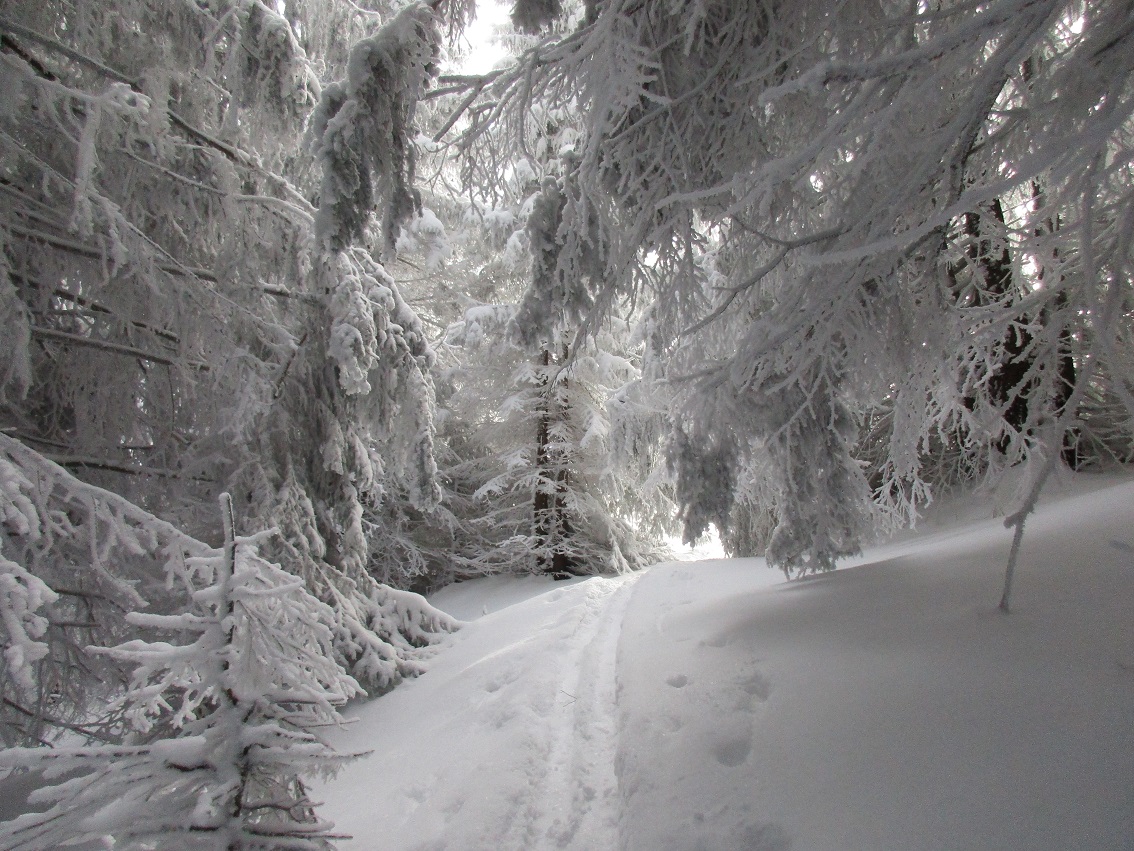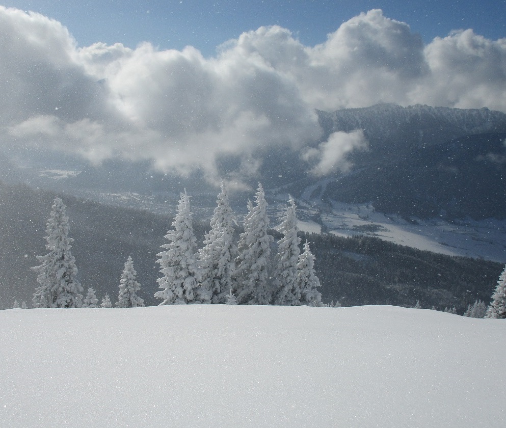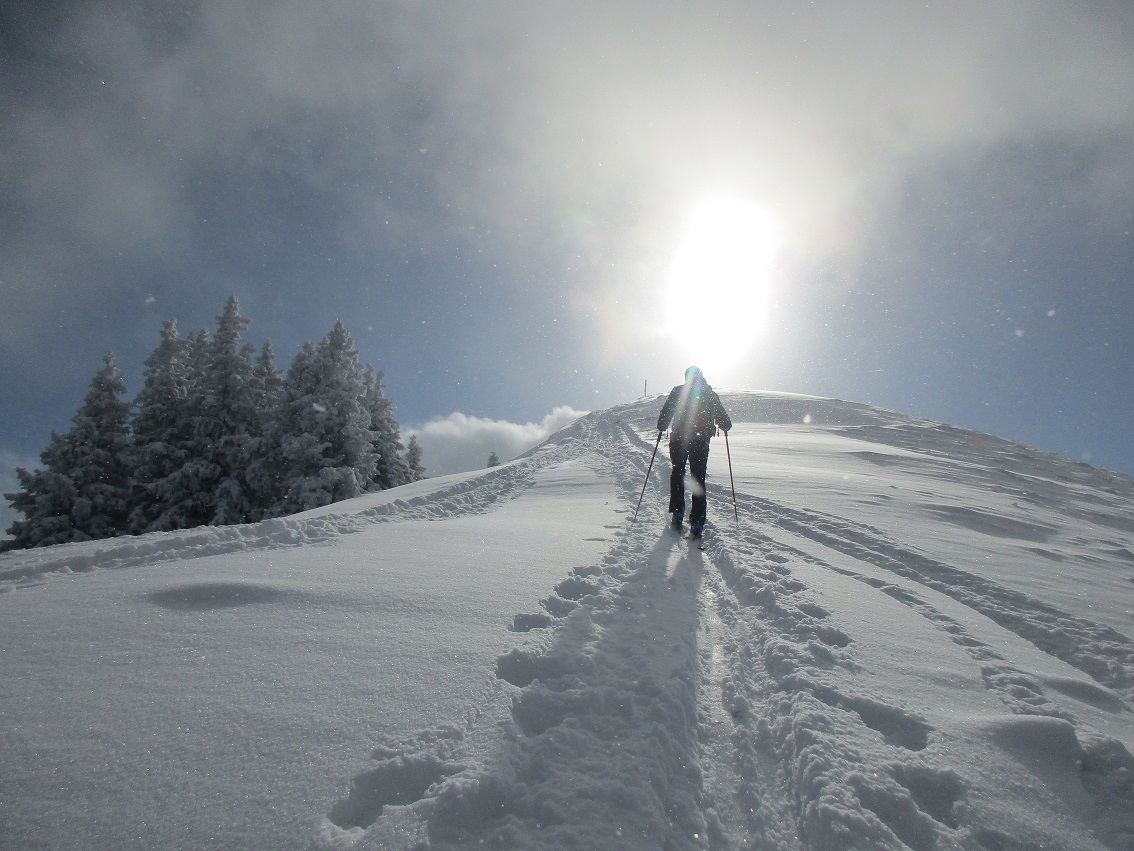 Tourenverhältnisse: Aufstieg sehr schön in winterlicher Stimmung / Neuschnee ohne Unterlage / KALT / Abfahrt in freiem Gelände wäre sehr mutig / auf den obersten Pistenabschnitten teilweise kleine Steine