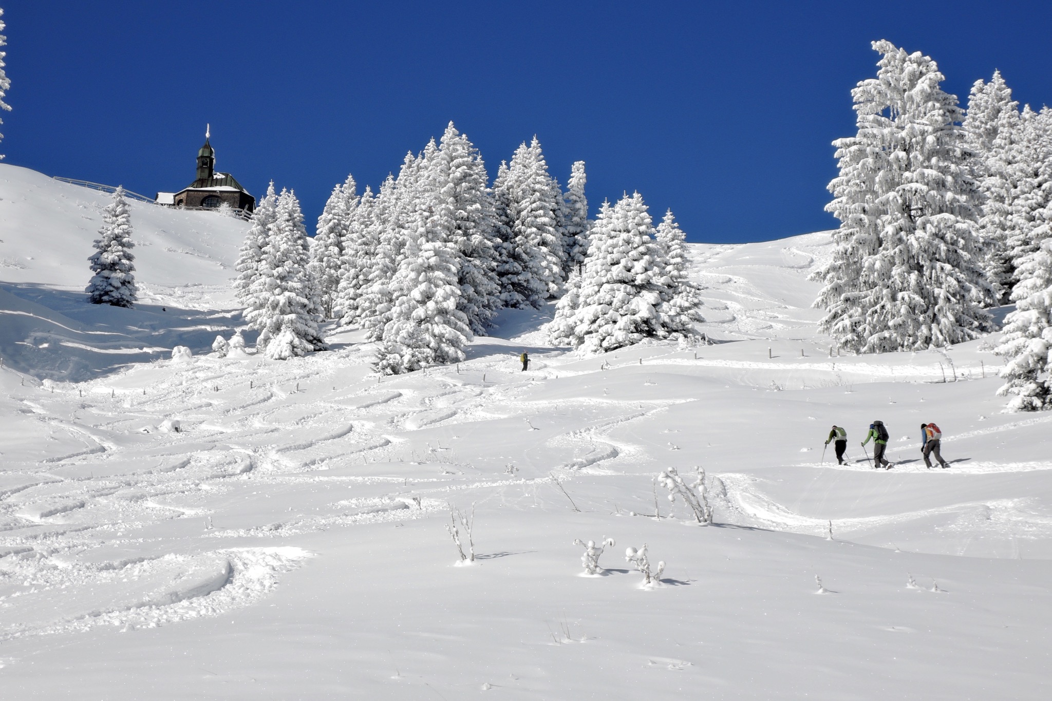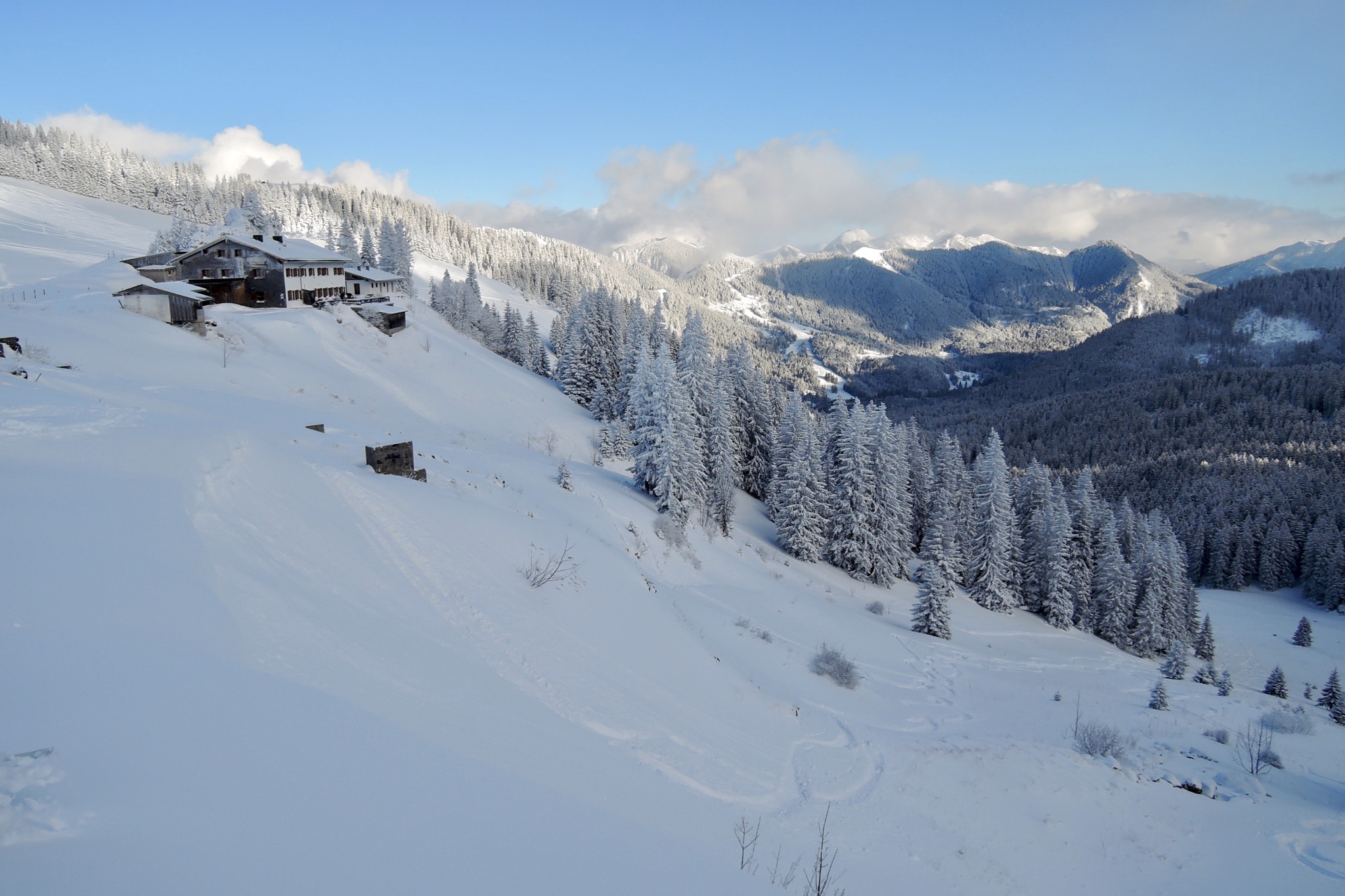 Sonstiges: Am Freitag von der Blankensteinhütte (1214m) Richtung W über den Schiffbach, dem Fahrweg zum Wallberghaus folgend an der Rottachalm (1211m) und der Portnesalm (1410m) vorbei in den weiten Kessel. Zuletzt Richtung NW steil zum Wallbergkircherl (1580m) hinauf. Viele von uns gehen noch auf den Wallberg (1722m) rüber, mich zeiht es aber, da man mit Ski nicht ans Gipfelkreuz geschweige denn runter kommt, ins Berghotel Altes Wallberghaus (1512m).