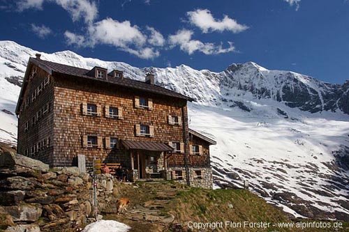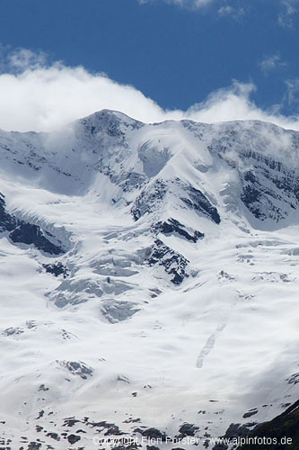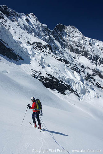 Am Sa. von Krimml mit dem Taxi bis zum Krimmler Tauernhaus (inkl. Radtransport 12 Euro). Mit Rad weiter über die Keesalmen bis zum Talende. Zu Fuß fast komplett schneefrei zur Warnsdorfer Hütte. Nachmittags noch kleine Erkundungstour zum Eissee, landschaftlich sehr reizvoll. Hütte exzellent geführt und sehr kompetenter Hüttenwirt! Nach gemütlichem Hüttenabend und kurzer Nacht um 2:30 Aufbruch zum Krimmlerkess. Ab Eissee durchgehend Schnee, bis 2700m sind wir zu Fuß, dann auf Skiern angeseilt weiter durch eindrückliche Spaltenzonen bis zum Einstieg auf 3050m. Den Bergschrund durfte ich dann von innen betrachten, nachdem die Schneebrücke unter mir zusammengebrochen ist. Etwas weite rechts gings dann aber gut rüber und in einer schwach ausgeprägte Rinne zwischen Eistürmen hindurch war fester Trittschnee, max 45°. Weiter oben wurde der Schnee dann immer tiefer mit üblem Harschdeckel, am Schluss durften wir dann knietief im frischen Pulverschnee bis zum Grat spuren. Über diesen bei starkem Wind bis zum Gipfel, 5 1/2h ab Hütte. Da der Grat zur Östl. Simonyspitze mit viel lockerem Neuschnee garniert war, sind wir die SW-Flanke Richtung Simonykees abgestiegen. Plötzlich stolpert mein Begleiter im 40° Gelände und rauscht an mir vorbei und reißt micht mit (das Seil hatten wir aufgrund Spaltengefahr drangelassen). Nach 70Hm kommen wir 10m neben einer riesigen Spalte zum Halten. Zum Glück ist bis auf ein paar Schürfwunden nichts passiert. Mit Ski gings dann weiter 200Hm über eine spaltenreiche Gletscherrampe aufwärts bis zum SO-Grat der Östl. Simonyspitze. Zu Fuß über diesen knapp 200Hm hinab (kurze Felsstelle und 50°) und Richtung Norden aufs Maurerkees gequert. Wieder auf Ski 150Hm in tiefem Schnee aufwärts zur Krimmlerkeesscharte. Dann Abfahrt (hart) übers Krimmlerkees bis 2500m und endlich ohne Seil in bestem Firn bis auf 2100m. Zu Fuß weiter zu den Rädern und rund 20Km durchs Krimmlertal bis zum Auto gerollt, insg. 12 Std.