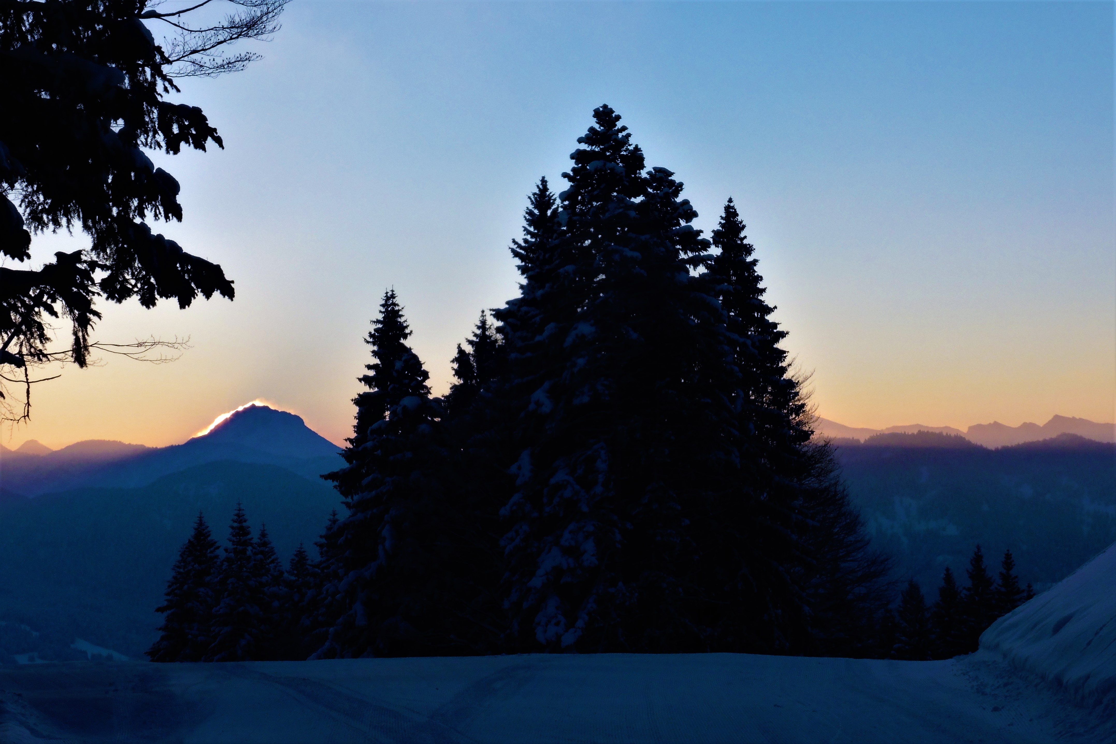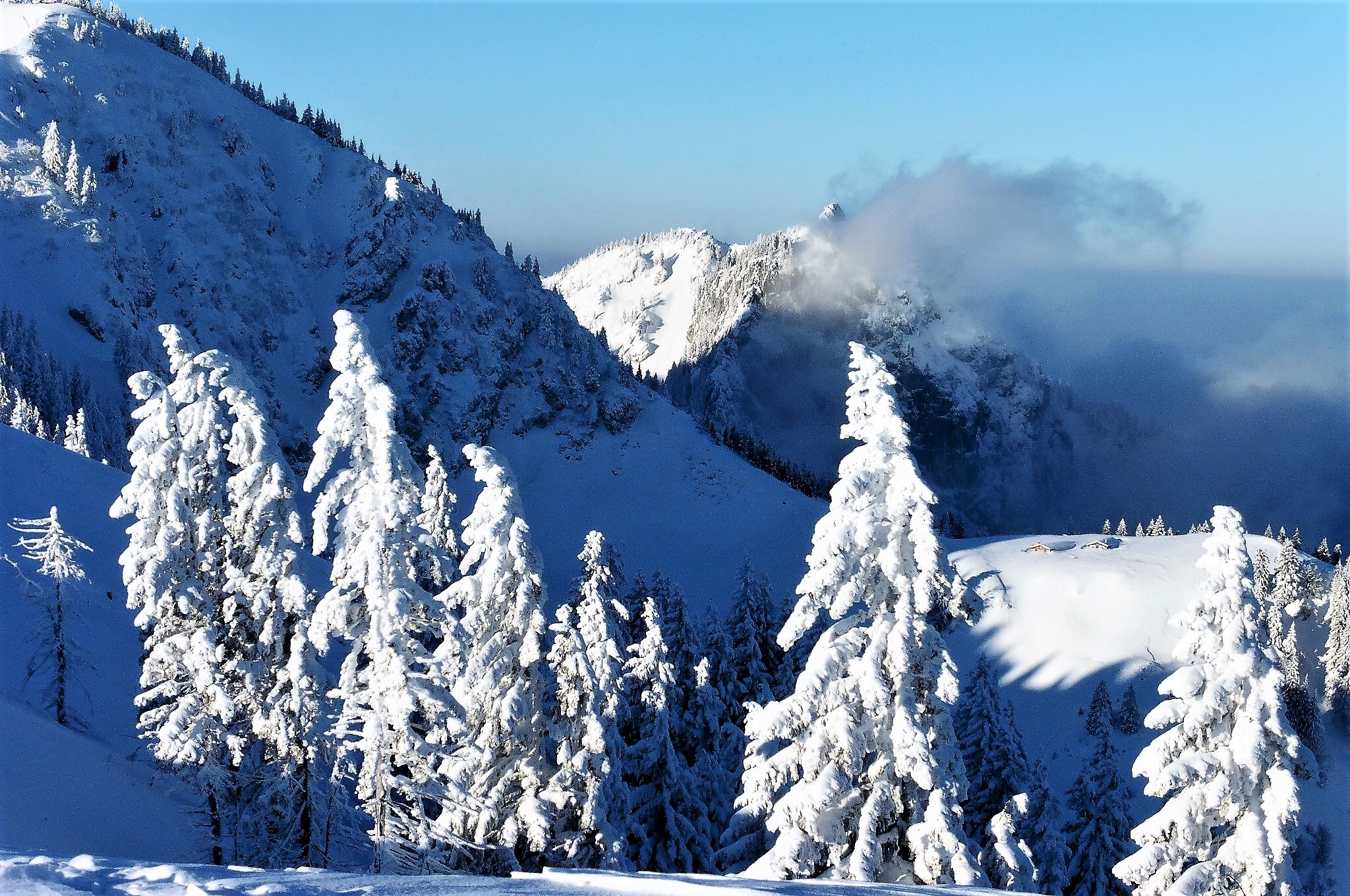 Sonstiges: vom Parkplatz frühmorgens bei -17 Grad auf den Gipfel (das Brauneckhaus war um 9.15 Uhr geschlossen; kein Hinweis auf Ruhetag); dann westlich vom Haus durch Tiefschnee und über Pisten zur Talstation der Finstermünz-Sesselbahn; entlang dem Florihang-Lift wieder aufgestiegen und über die Familienabfahrt abgefahren; am Brauneck war es wolkenlos, während der Blomberg und das nördliche Vorland in Wolken steckte;