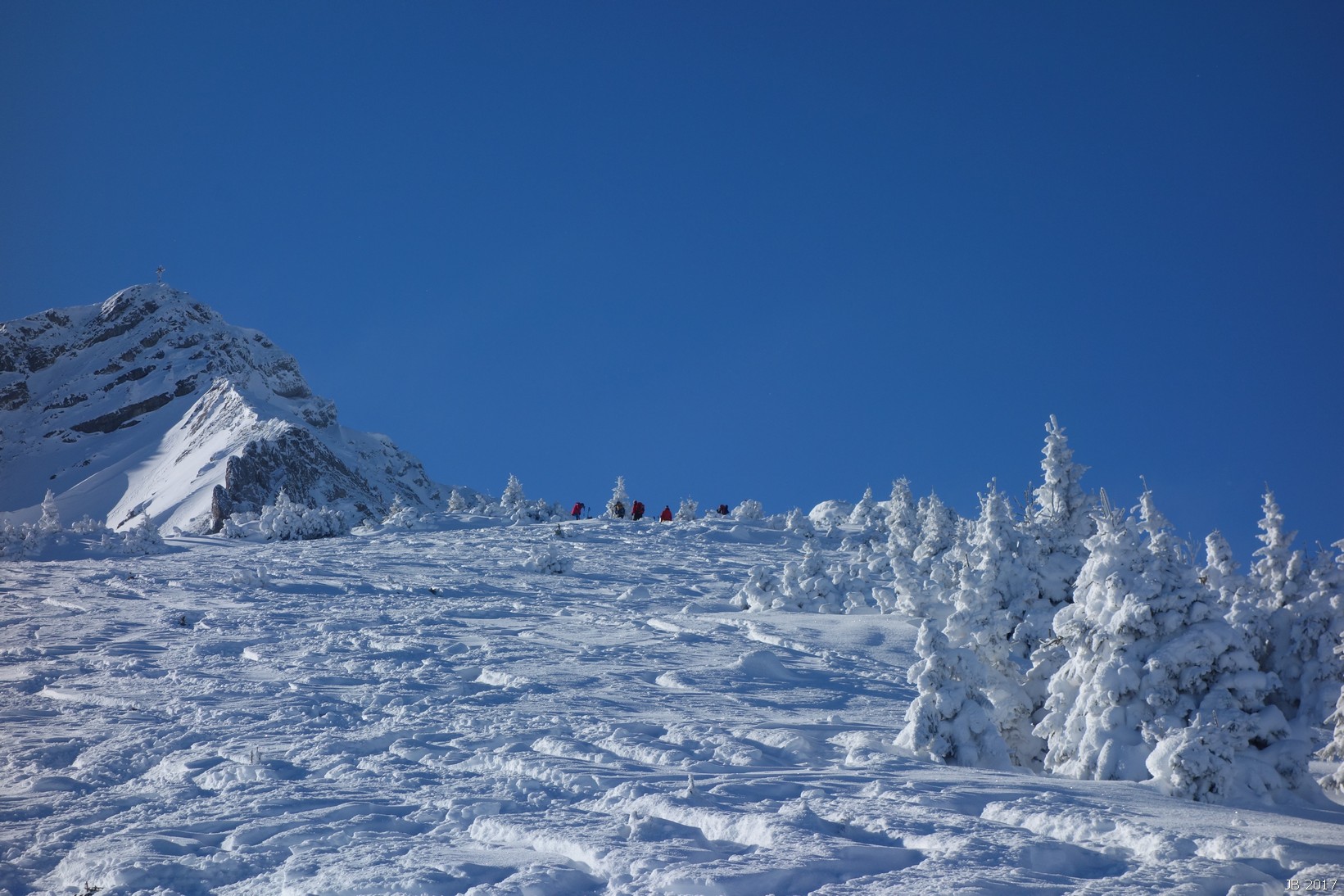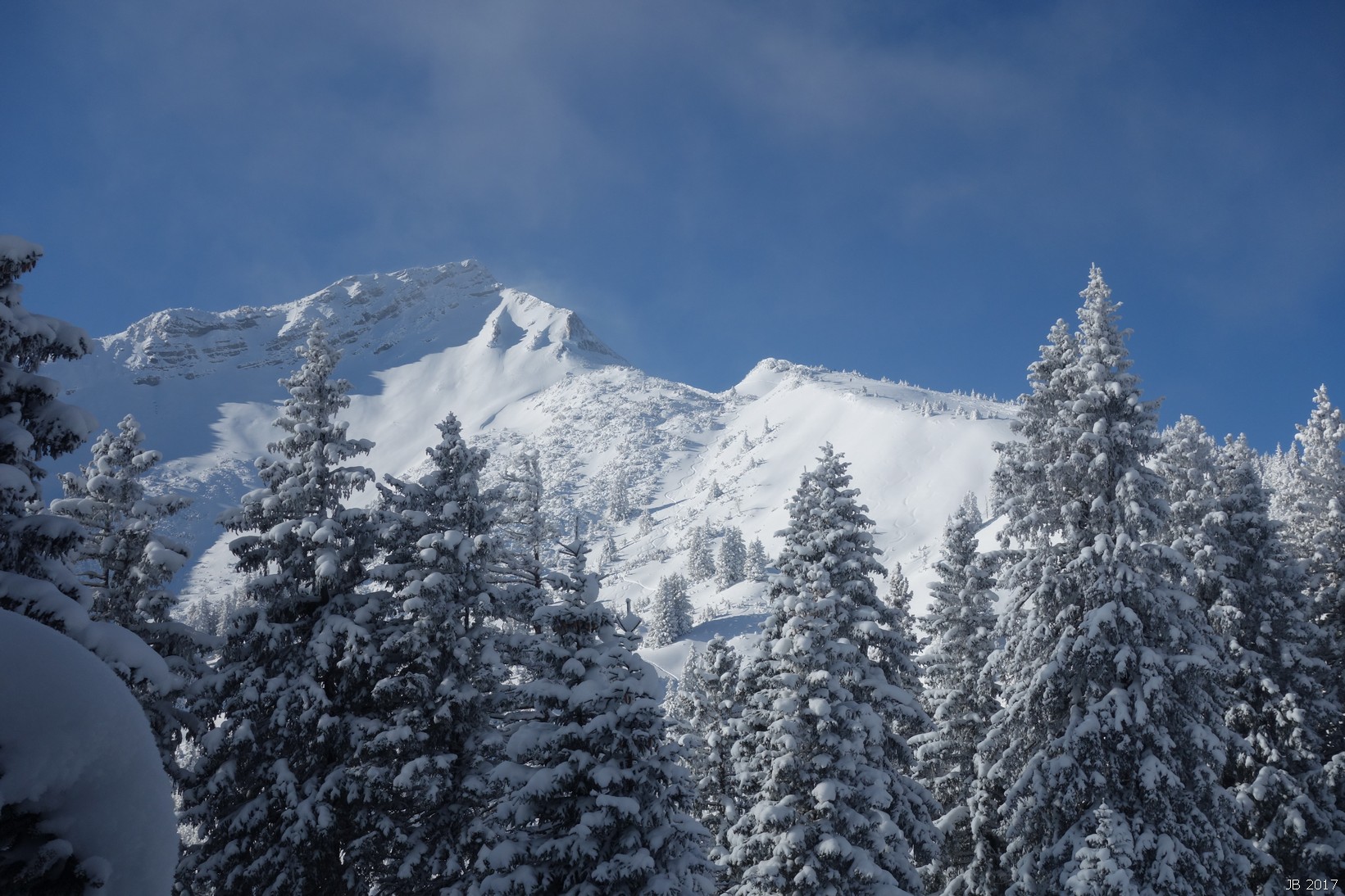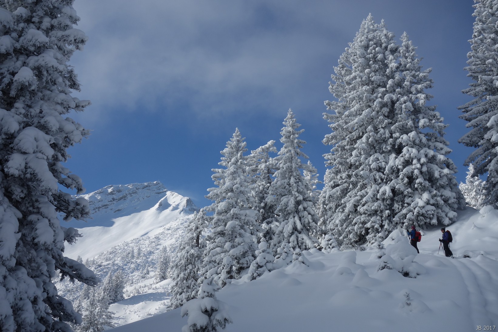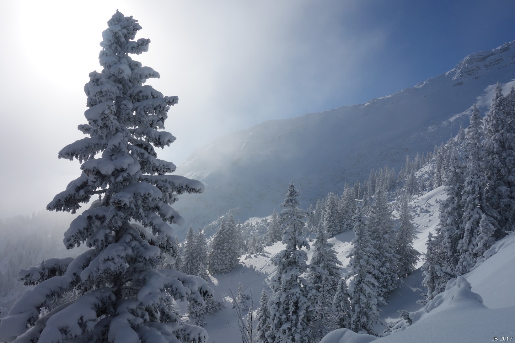 Viel Pulverschnee am Starthang unterm Skidepot und in den steilen Waldhängen.