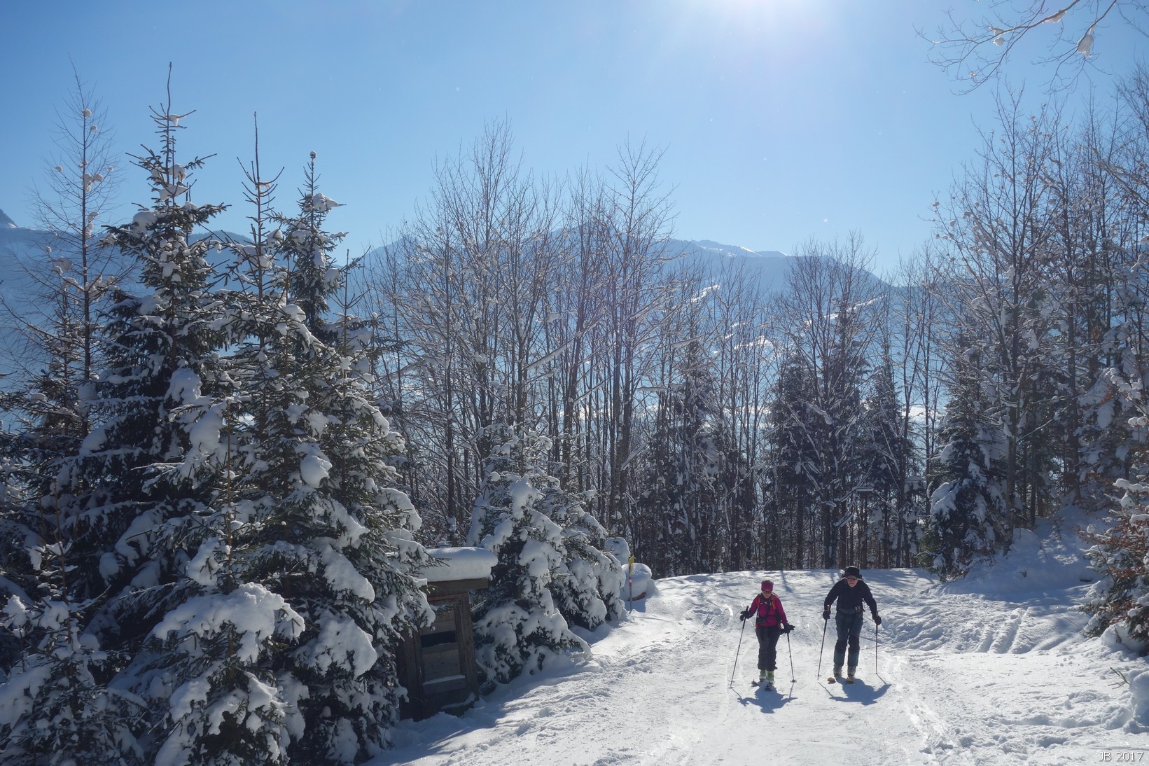 Genug Schnee vom PP weg. Abwechslungsreicher Aufstieg erst durch Wald über die Rodelbahn, dann über eine Schneise zur Klosteralm 1200m.