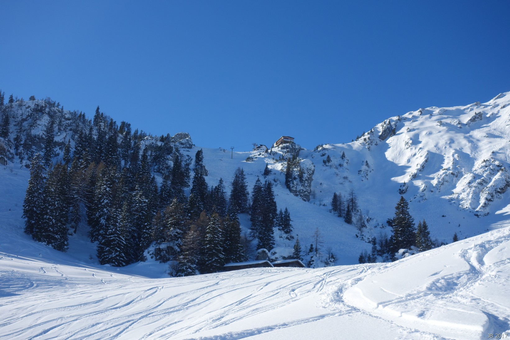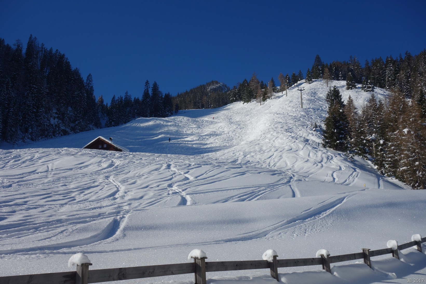 Die Hänge sind im oberen Teil breit und ziemlich zerfahren, sonnige Partien haben schon eine leichte Kruste. Unterhalb der Klosteralm pistenartig eingefahren, an einigen Stellen spitzt der Untergrund heraus. Die Rodelbahn im unteren Teil leitet problemlos zum PP.