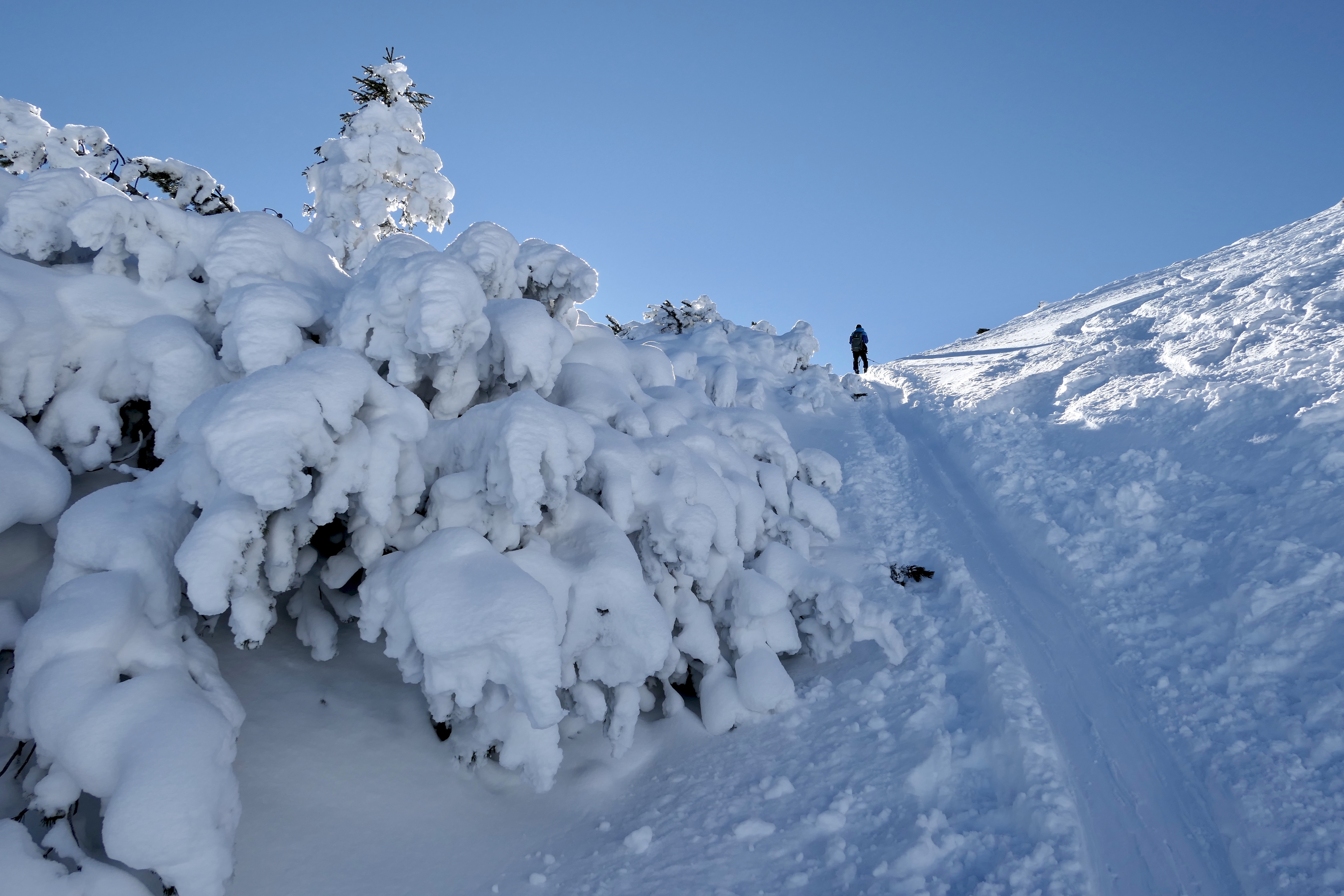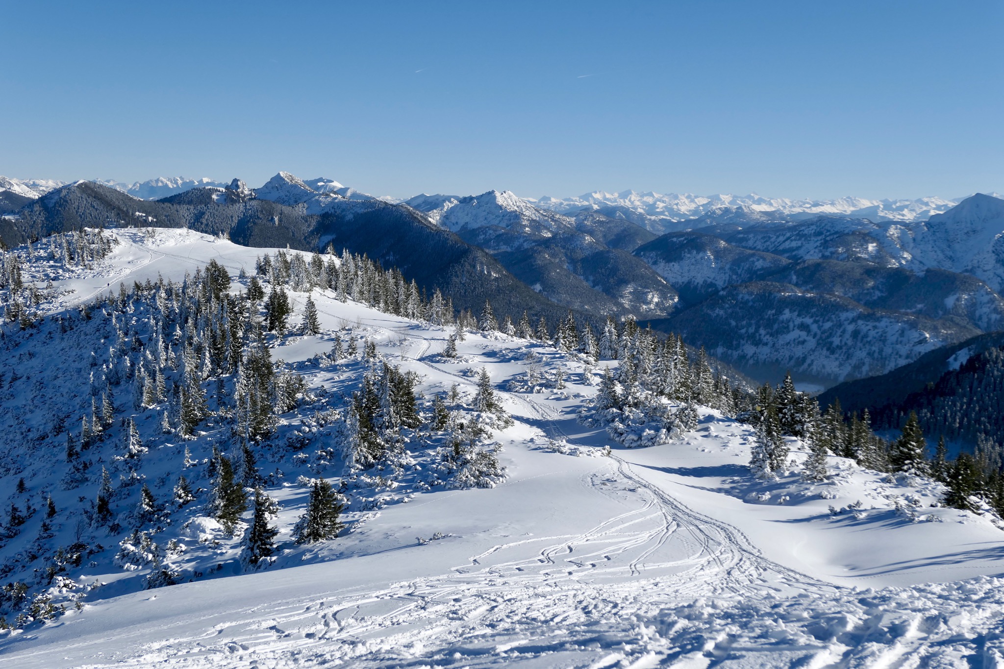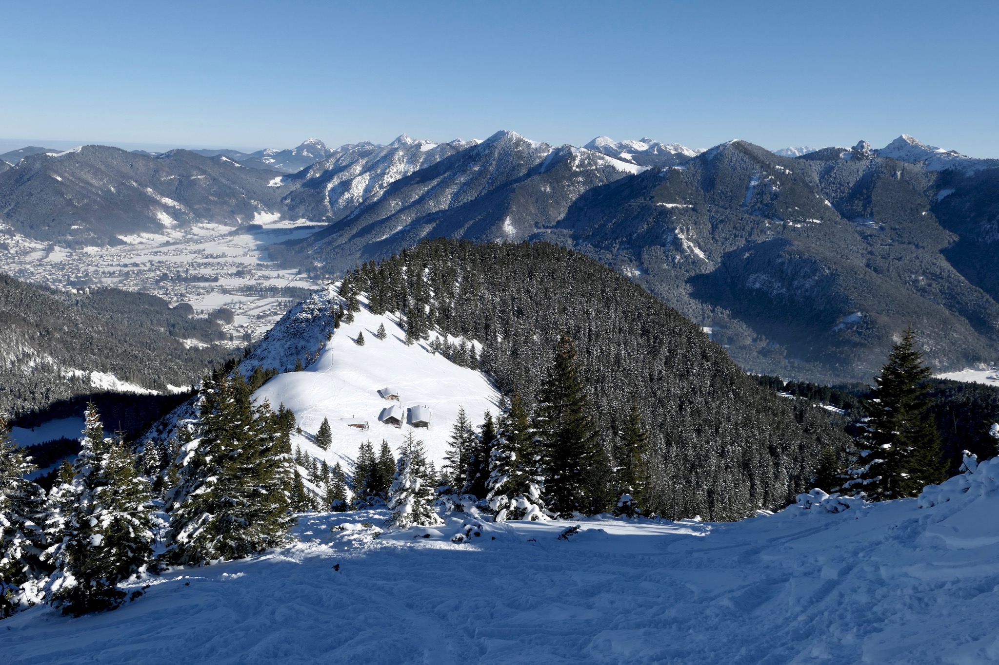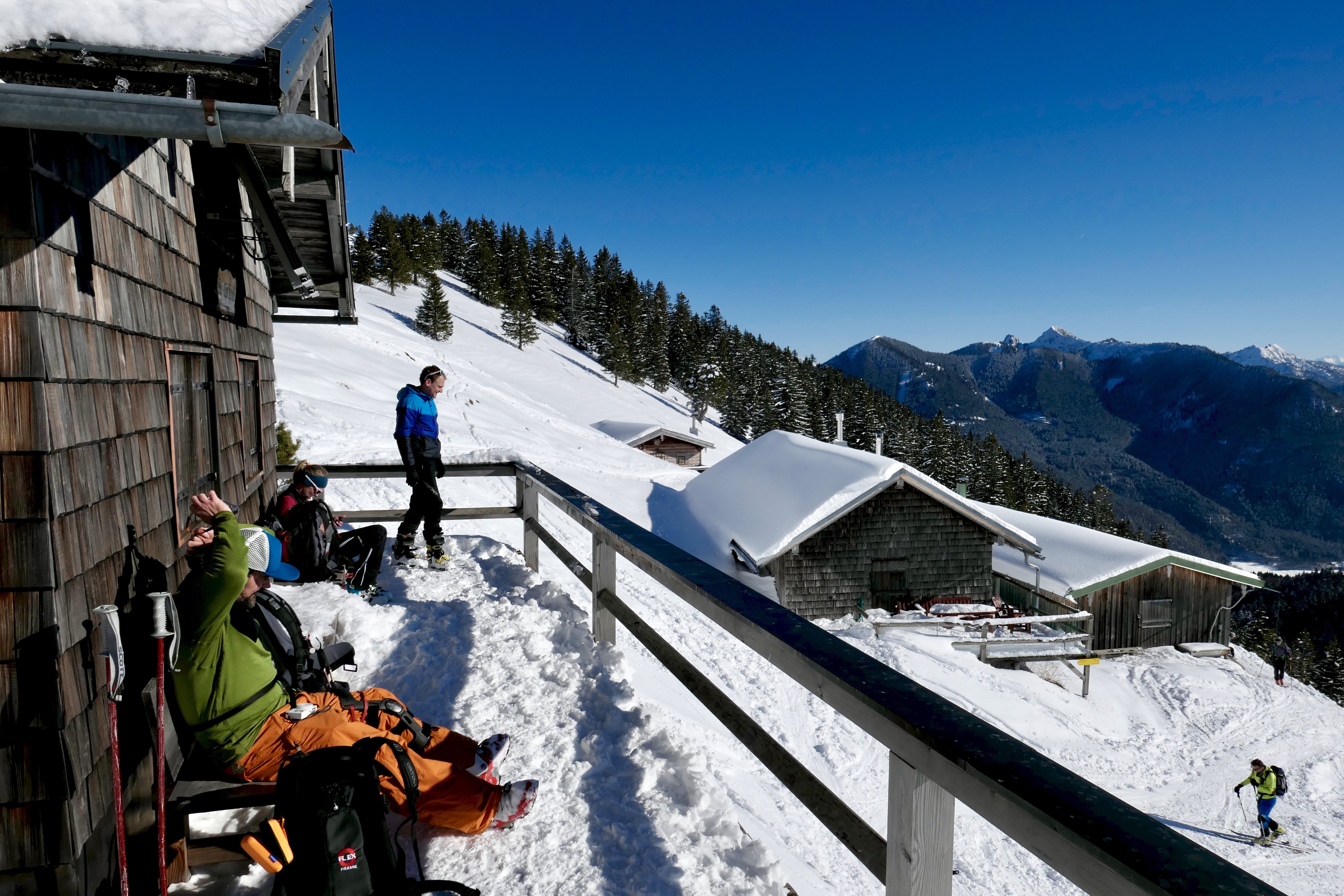 Sonstiges: Vom PP Hirschberglifte (775m, 3€) auf Skiroute rechts neben der Piste durch den Wald auf die Gründ (1180m). Am Wegweiser weiter Richtung SW, in einem weiten Rechtsbogen Richtung WNW drehend. Bald sieht man rechts oben bereits die Rauheck-Alm (1480m), zu der man etwas steiler Richtung N aufsteigt. Von dieser erst Richtung W, dann Richtung SW über einen Rücken zum Hirschberg-Vorgipfel (1653m) mit dem Haag-Denkmal, von dem man in leichtem Auf und Ab Richtung W in wenigen Minuten den Hirschberg (1668m) mit dem großen Kreuz erreicht.Runter über den Rücken zur Raecke-Alm, dann die Schneise – wo sich Andi ordentlich auf die Zunge beißt – zur Gründhütte und dann die Piste.
