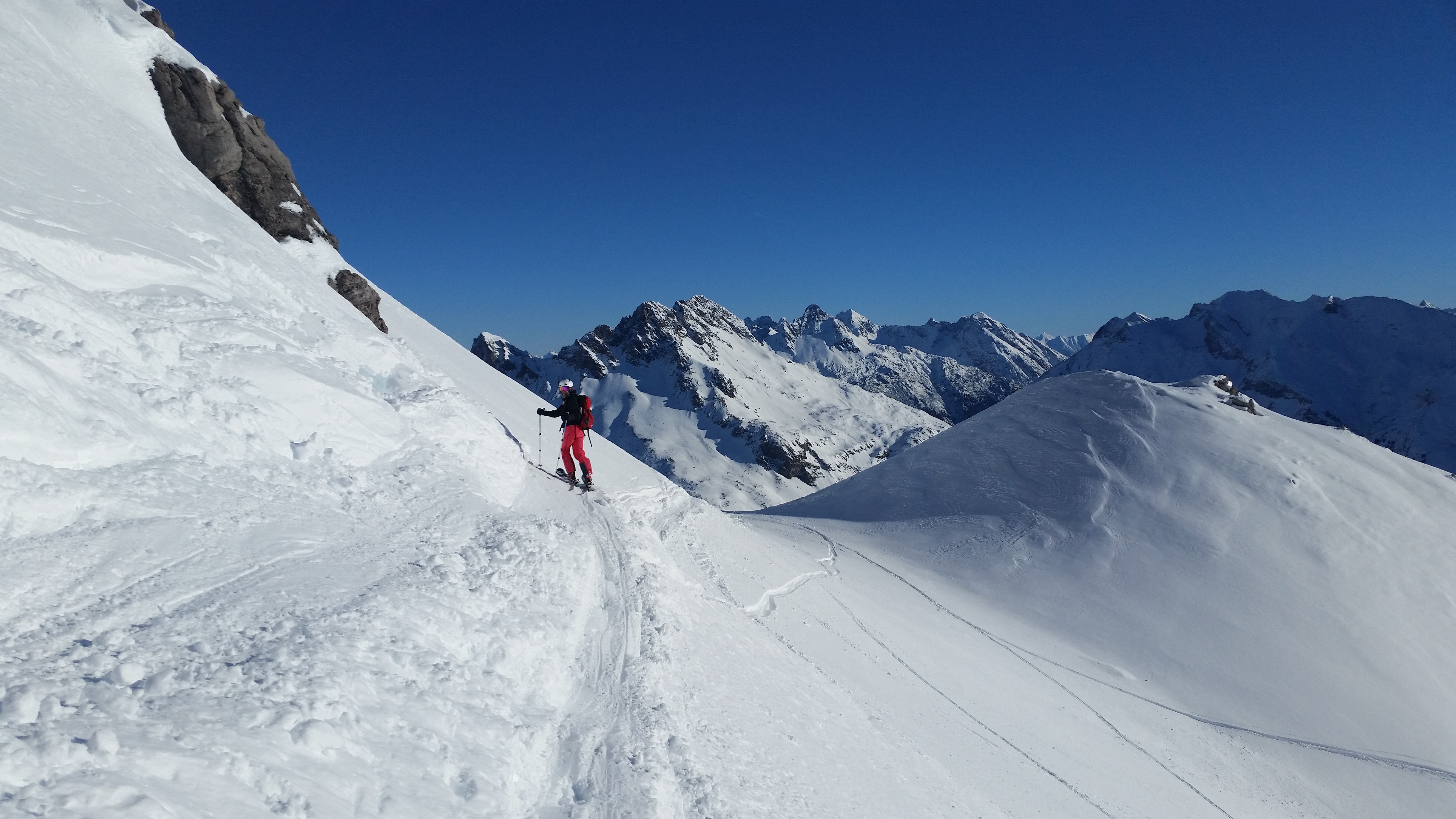 Tourenverhältnisse: Am Mi noch reichlich Schnee, fast alles ziemlich verspurt. Mit jedem Tag werden die Hangkanten und - rippen (bei Querungen) aperer.