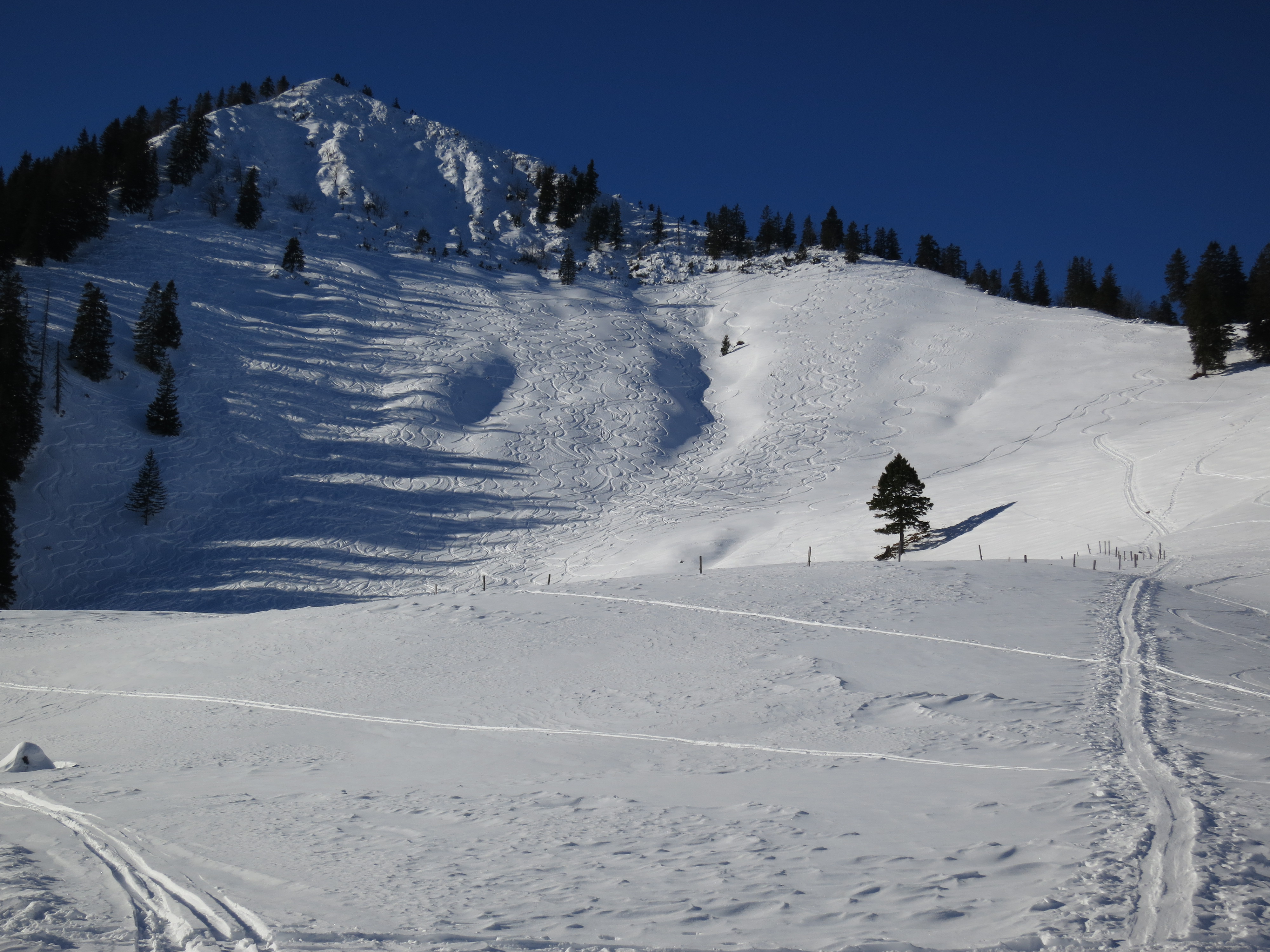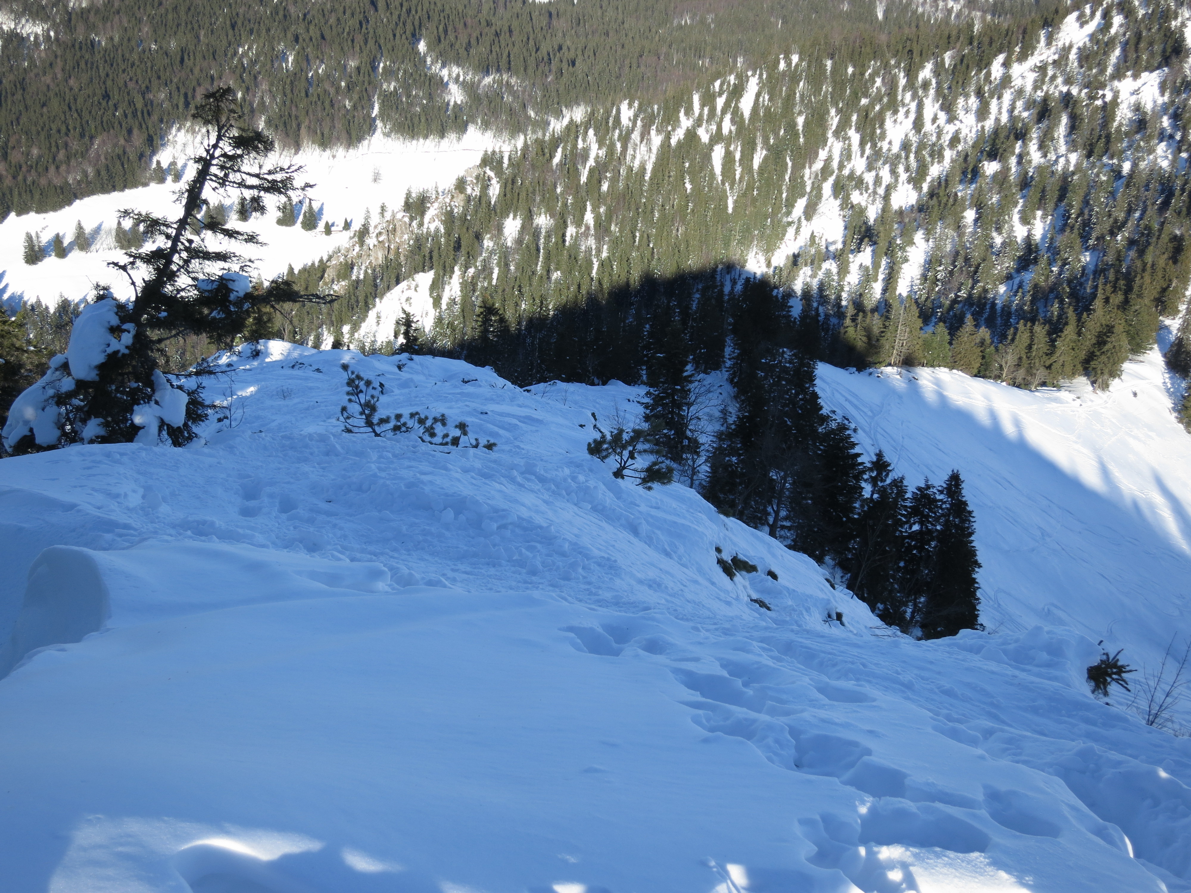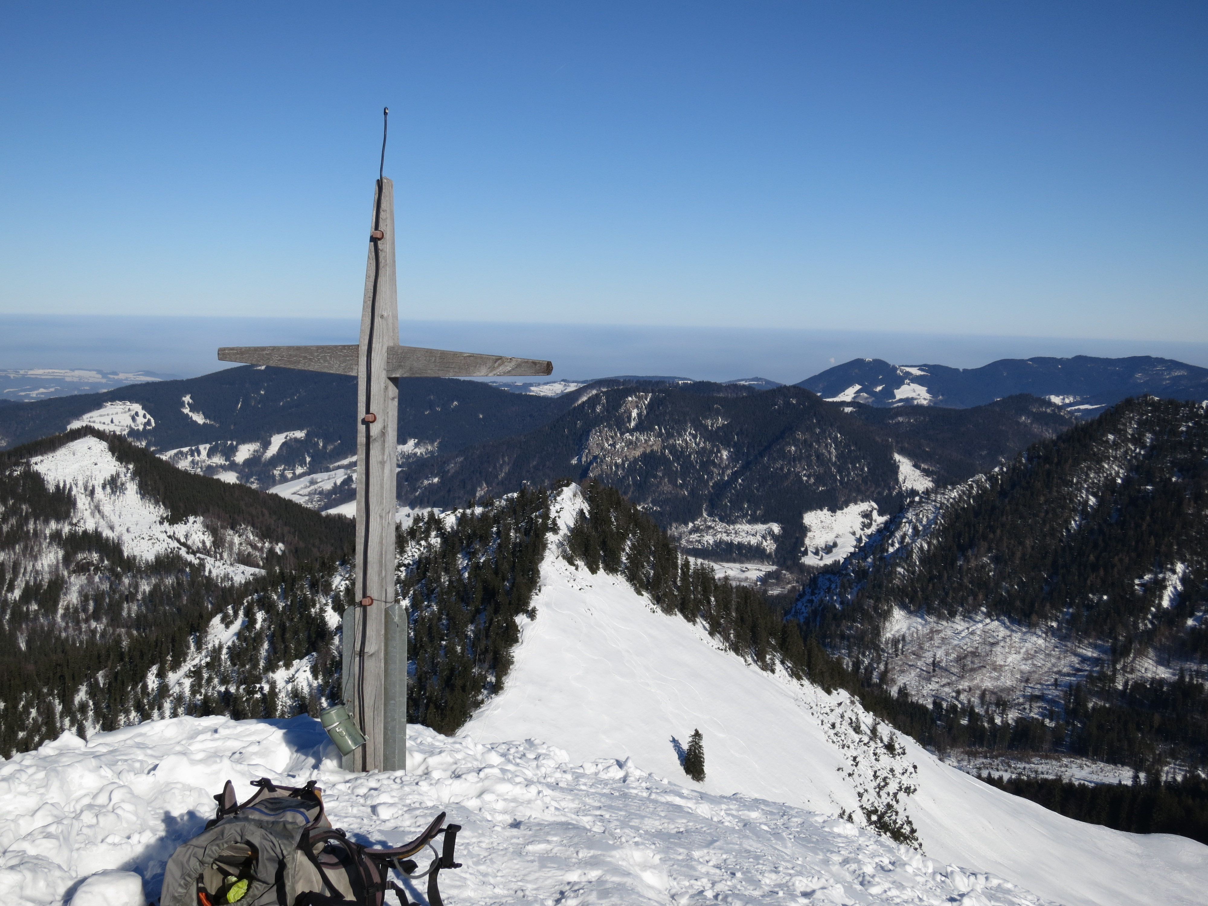 Tourenverhältnisse: Aufstieg problemlos. Abfahrt am Aufstiegsweg über den Grat anfangs ein rechtes Geackere, ab der Einfahrt in den Hang (wo er nicht mehr so steil war wie direkt vom Gipfel) aber ein Pulverschneegenuss. Auch die weitere Abfahrt im Wald und später direkt auf der Forststraße (die in gutem Zustand war) ging super. Kein Steinkontakt.