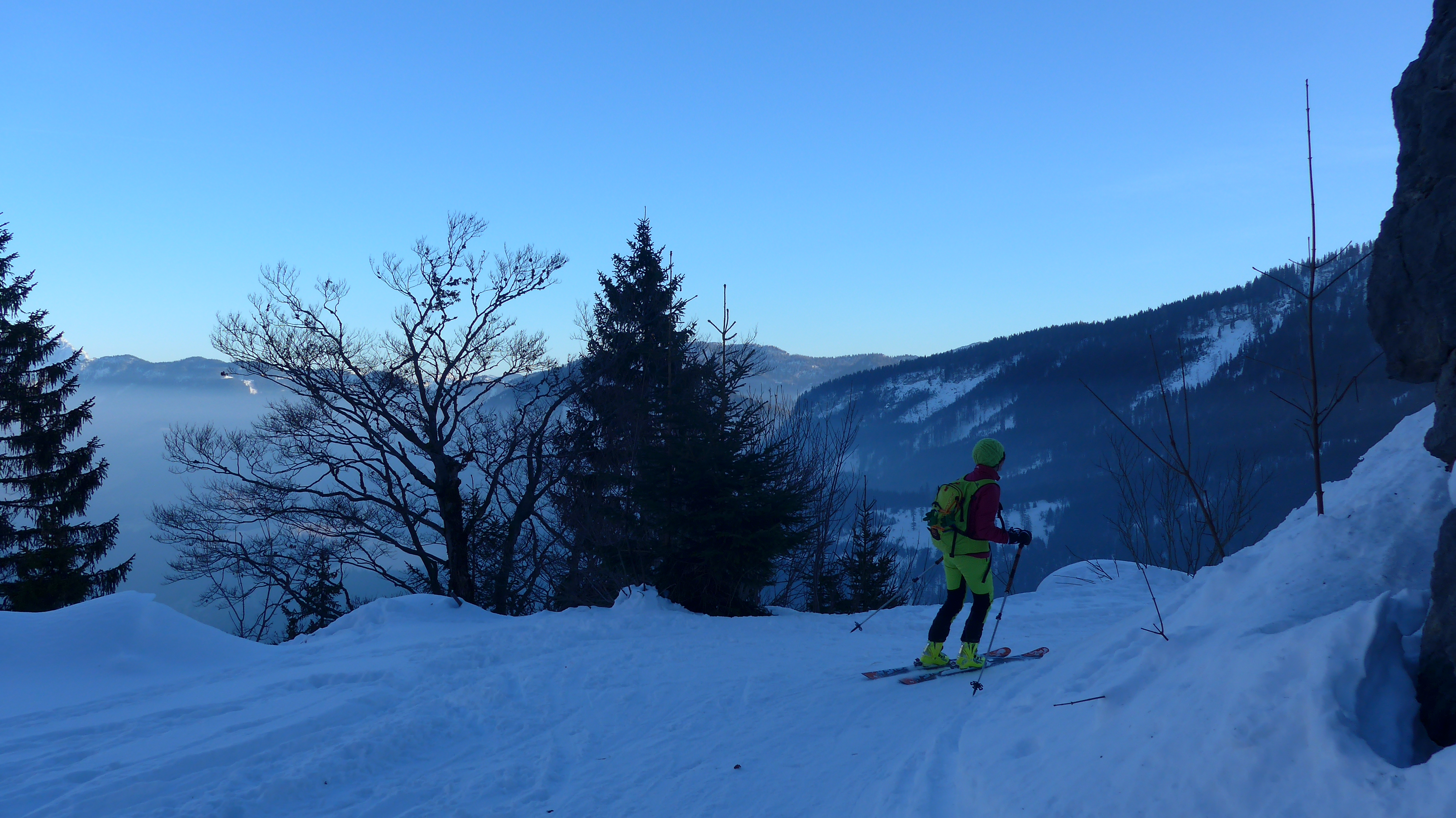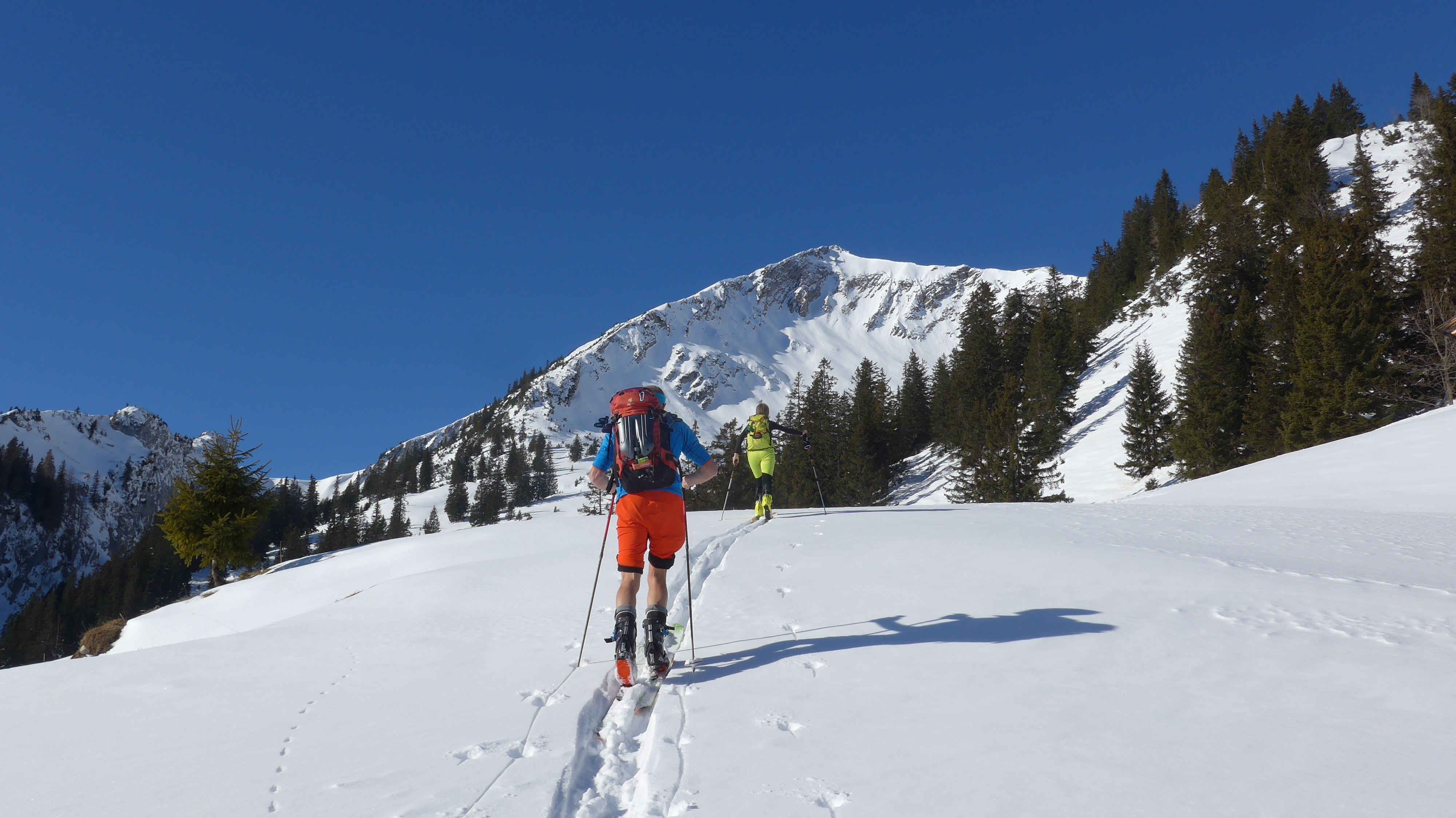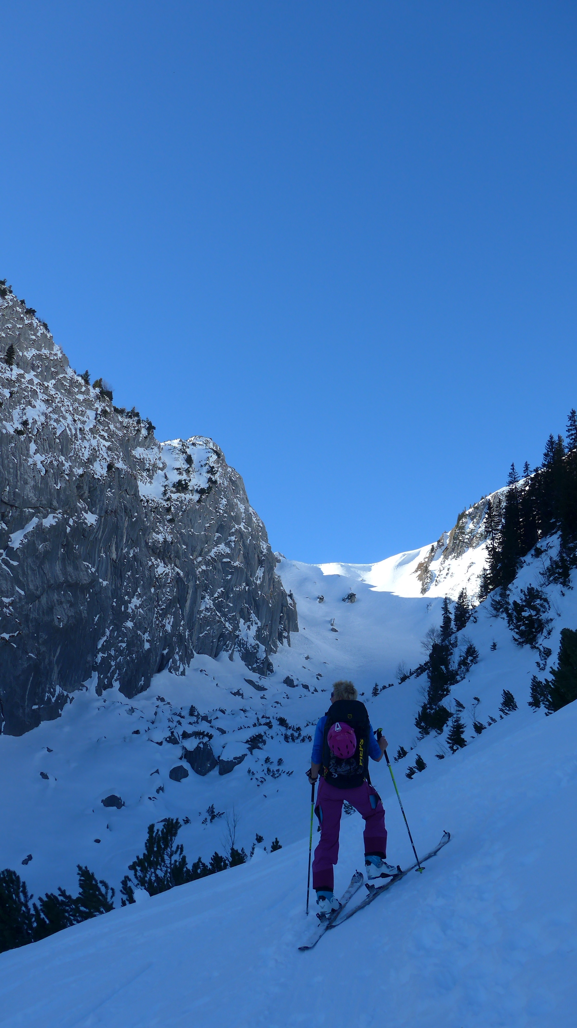 Tourenverhältnisse: geschlossene Schneedecke vom Auto weg. 1 h auf der Straße entlang bis zum Abzweig Wildenkar Alm (wie in AV Karte eingezeichnet) Abwechslungsreicher Aufstieg.