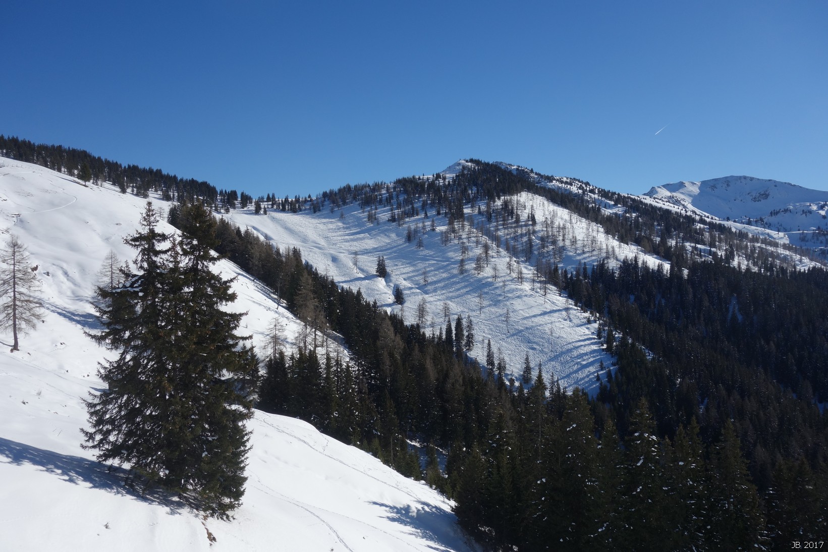 Start am PP Breitebenalm. Über die Breitebenalm planten wir zur Gabel aufzusteigen. Wegen Schneemangel auf der Südseite sind wir über die Promaualm über den N-Rücken auf den Penkkopf gestiegen, zumal die Westhänge recht vielversprechend aussahen. Leider enden diese Hänge in einer steilen eingefahrenen Waldabfahrt, die aber mit kürzeren Skiern machbar war. Im unteren Teil dann Bruchharsch und eingefahrene Forststraßen. Besser vom Gipfel erst nach SW abfahren.