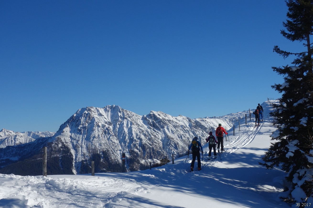 Vom PP Hallmoosalm über die Karteisalm in den weiten Kessel unter dem Gipfel. Unsere Aufstiegsspur führte ab 1900m nach S auf den W-Grat. Über diesen Grat führte der Anstieg zum Gipfel. Für die Abfahrt wählten wir die schönen nordseitigen Mulden, die mit tragfähigen windgepreßten Schnee gefüllt waren.