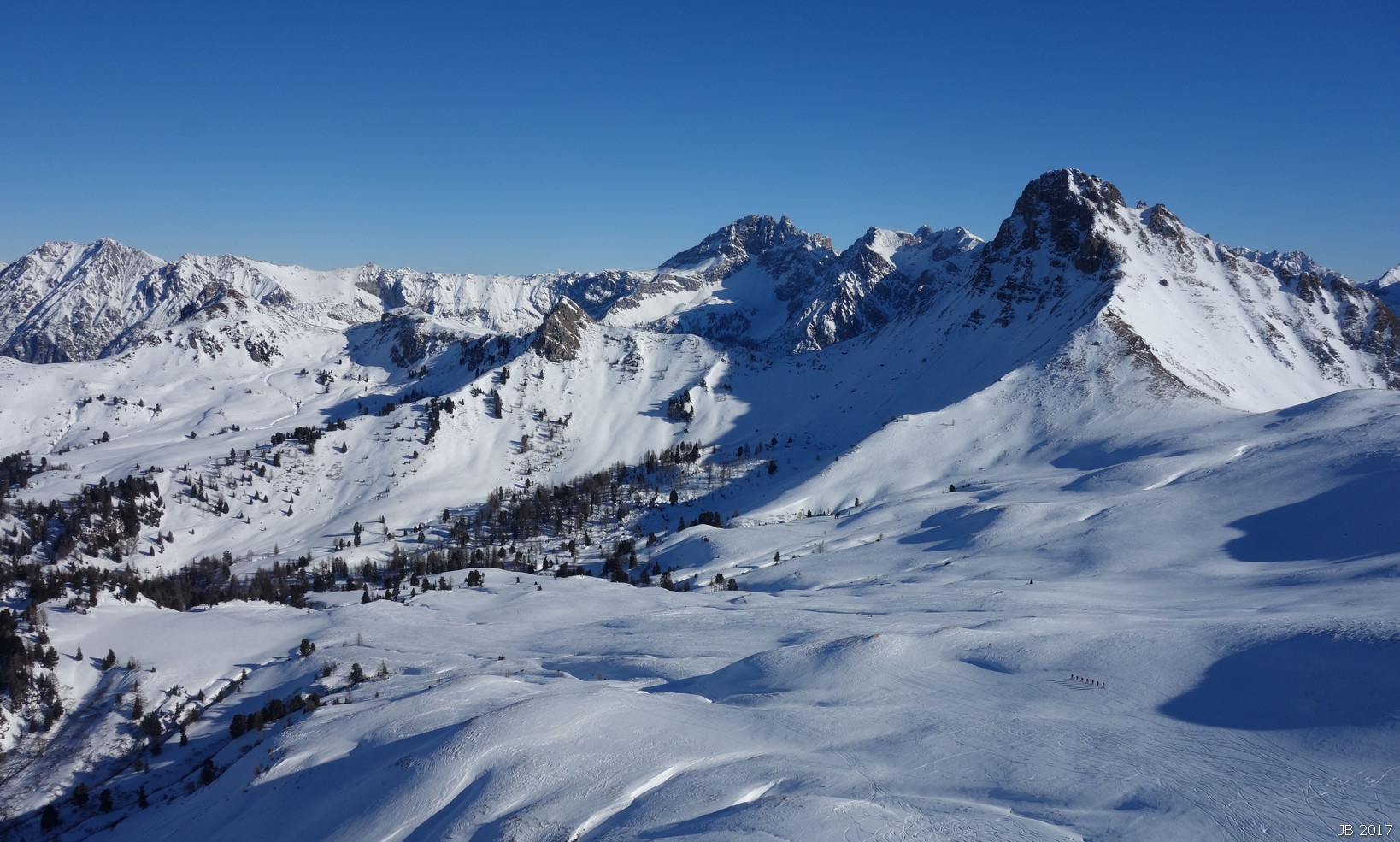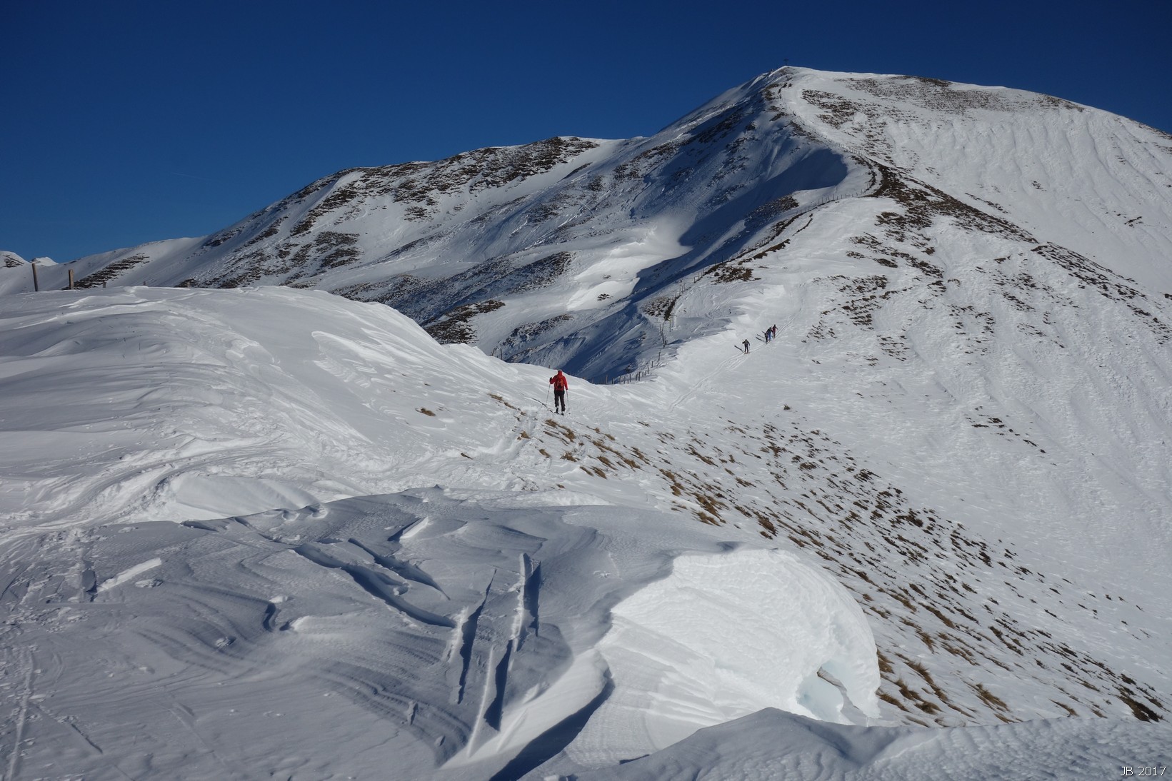 unterhalb der Waldgrenze in den Schattenhängen gesetzter Pulver, darüber sehr abgeblasen, teilweise hart und griffig, teilweise Plattenpulver.