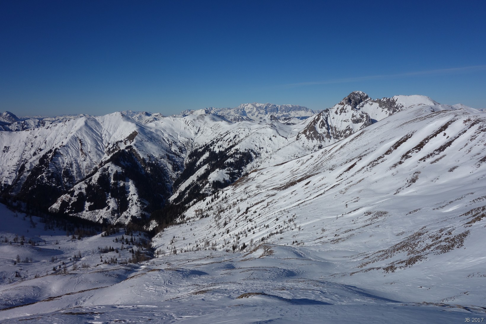 Die N-Abfahrt vom Kreuzeck, Filzmooshörndl und Draugstein im Hintergrund