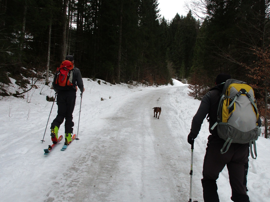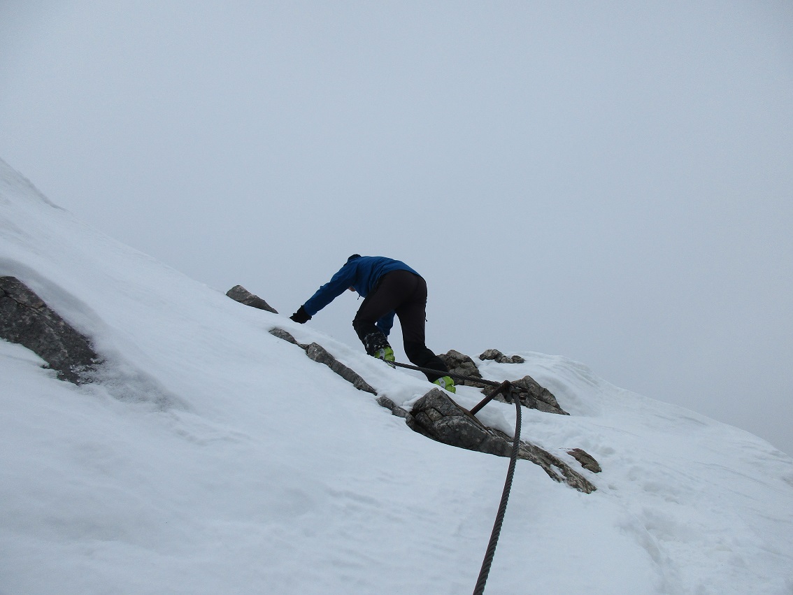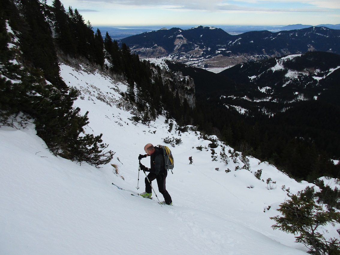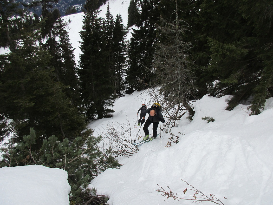 Tourenverhältnisse: Unten vereist / sonst harter Schnee mit leichter Pulverschneeauflage ( nur wenige cm ) / Harscheisen erleichteren im oberen steileren Teil den Aufstieg / Am Gipfel eisiger Wind / Abfahrt zwar hart aber besser als erwartet