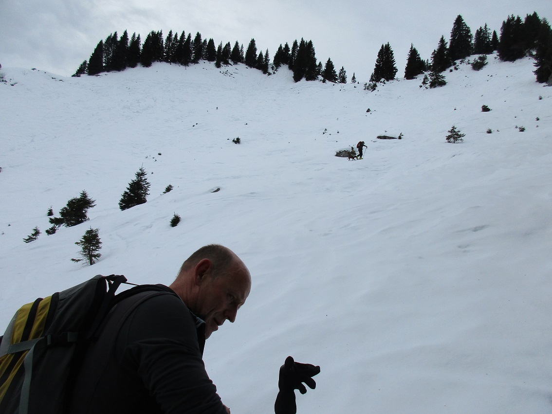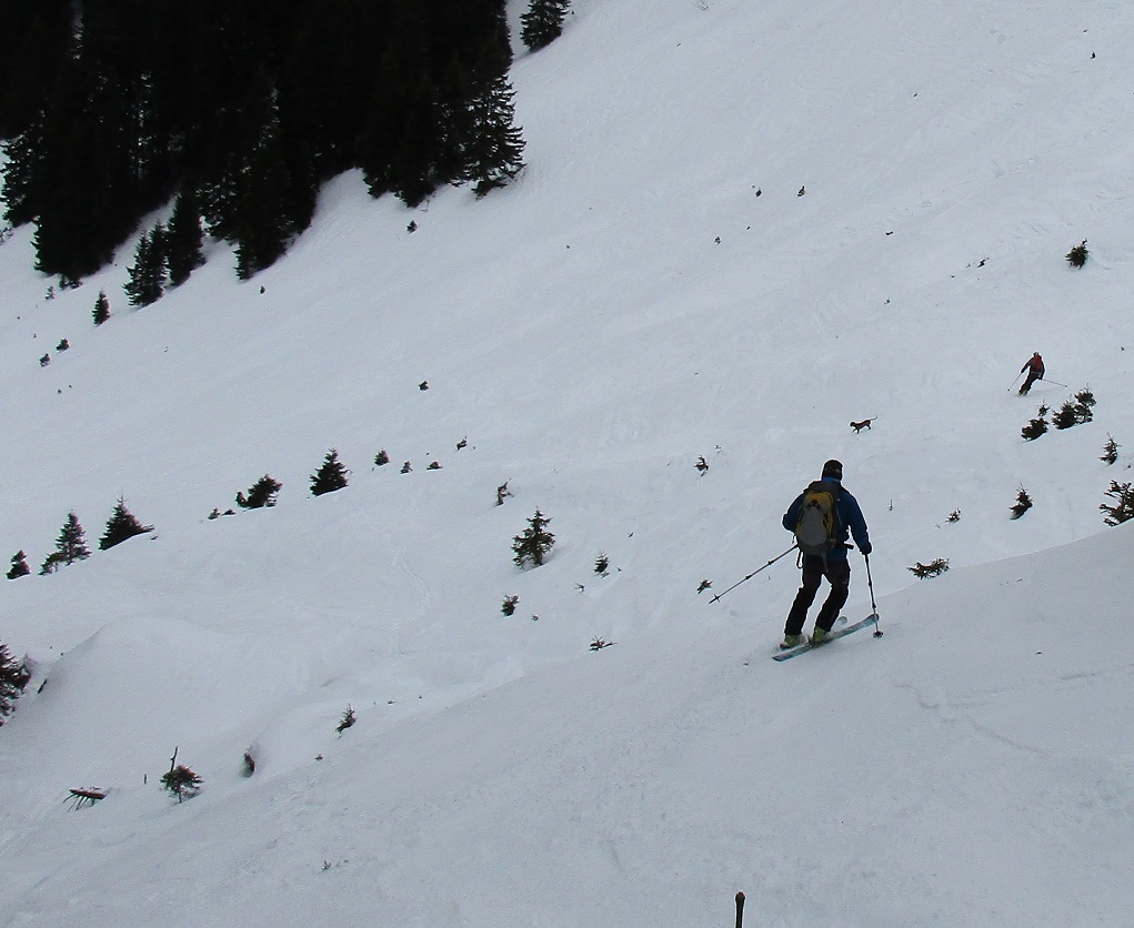 Gefahreneinschätzung: zur Zeit keine ( Lawinen ) / man sollte sicher auf den Ski stehen / u. U. Gefahr eines Muskelkaters in den Oberschenkeln wg. ruppiger Abfahrtsbedingungen