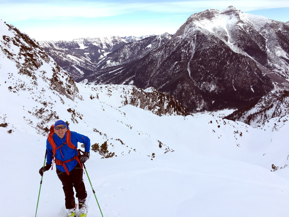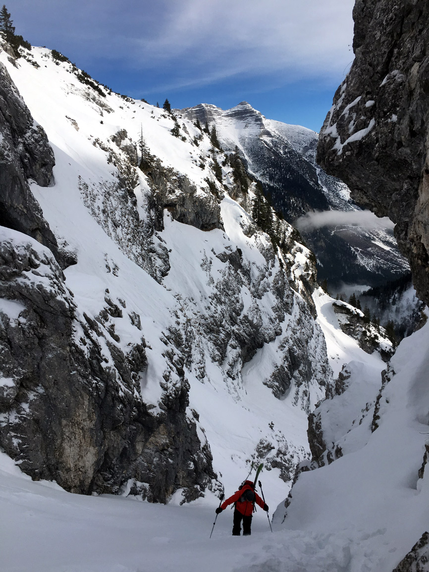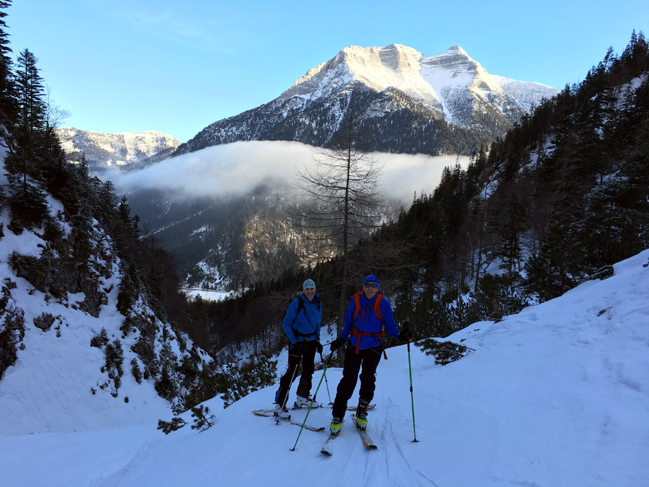 Genug Schee vom Start weg. Im Aufstieg morgens teils hart gefroren, die letzten Meter der Steilstufe zum ersten Felsentor haben wir die Skier auf den Rucksack schnallen müssen. Ansonsten gute Bedingungen für Aufstieg (mit Harscheisen) und Abfahrt. Im oberen Teil bis zu 25 cm Neuschnee, ab dem Abzweig zum Hinteren Unnütz waren wir allein und mussten spuren. Die Schneeverhältnisse wechselten sehr kleinräumig zwischen Pulver, windgepresstem Decke und leichtem Bruchharsch. Insgesamt aber ordentlich zu fahren. Ab dem Ausstieg aus dem Nordostkar zum Normalweg von Steinberg aus (wurde auch gemacht) grimmiger Wind auf den letzten 5 Minuten zum Gipfel (Brotzeit deshalb weiter unten). Die Bachpassage (im unteren Teil) ist derzeit problemlos machbar.